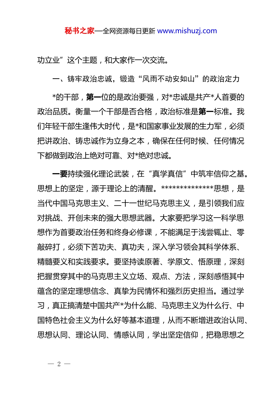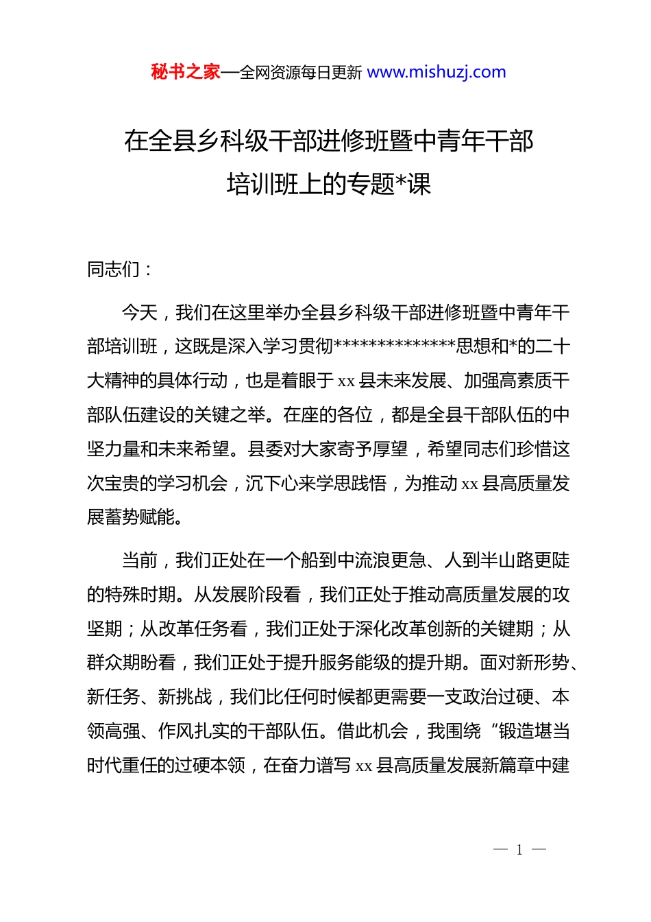 秘书之家—全网资源每日更新 www.mishuzj.com在全县乡科级干部进修班暨中青年干部培训班上的专题*课同志们:今天,我们在这里举办全县乡科级干部进修班暨中青年干部培训班,这既是深入学习贯彻**************思想和*的二十大精神的具体行动,也是着眼于 xx 县未来发展、加强高素质干部队伍建设的关键之举。在座的各位,都是全县干部队伍的中坚力量和未来希望。县委对大家寄予厚望,希望同志们珍惜这次宝贵的学习机会,沉下心来学思践悟,为推动 xx 县高质量发展蓄势赋能。当前,我们正处在一个船到中流浪更急、人到半山路更陡的特殊时期。从发展阶段看,我们正处于推动高质量发展的攻坚期;从改革任务看,我们正处于深化改革创新的关键期;从群众期盼看,我们正处于提升服务能级的提升期。面对新形势、新任务、新挑战,我们比任何时候都更需要一支政治过硬、本领高强、作风扎实的干部队伍。借此机会,我围绕“锻造堪当时代重任的过硬本领,在奋力谱写 xx 县高质量发展新篇章中建— 1 —秘书之家—全网资源每日更新 www.mishuzj.com功立业”这个主题,和大家作一次交流。一、铸牢政治忠诚,锻造“风雨不动安如山”的政治定力*的干部,第一位的是政治要强,对*忠诚是共产*人首要的政治品质。衡量一个干部是否合格,政治标准是第一标准。我们年轻干部生逢伟大时代,是*和国家事业发展的生力军,必须把讲政治、铸忠诚作为立身之本,确保在任何时候、任何情况下都做到政治上绝对可靠、对*绝对忠诚。一要持续强化理论武装,在“真学真信”中筑牢信仰之基。思想上的坚定,源于理论上的清醒。**************思想,是当代中国马克思主义、二十一世纪马克思主义,是引领我们应对挑战、开创未来的强大思想武器。大家要把学习这一科学思想作为首要政治任务和终身必修课,不能满足于浅尝辄止、零敲碎打,必须下苦功夫、真功夫,深入学习领会其科学体系、精髓要义和实践要求。要坚持读原著、学原文、悟原理,深刻把握贯穿其中的马克思主义立场、观点、方法,深刻感悟其中蕴含的坚定理想信念、真挚为民情怀和强烈历史担当。通过学习,真正搞清楚中国共产*为什么能、马克思主义为什么行、中国特色社会主义为什么好等基本道理,从而不断增进政治认同、思想认同、理论认同、情感认同,学出坚定信仰,把稳思想之— 2 —秘书之家—全网资源每日更新 www.mishuzj.com舵。二要坚决拥护“两个确立”,在“对标对表”中践行绝对忠诚。“两个确立”是新时代取得一切成就最根本的保证。对*忠诚,最现实、最直接的体现就是坚决拥护“两个确立”、做到“两个维护”。这绝不是一句空洞的口号,而是要体现在我们的一言一行、一举一动之中。大家要时时刻刻向*中央看齐,向******看齐,向*的理论和路线方针政策看齐。*中央提倡的要坚决响应,*中央决定的要坚决执行,*中央禁止的要坚决不做。要养成在吃透*中央精神前提下开展工作的习惯,想问题、作决策、抓落实,都要自觉同*的基本理论、基本路线、基本方略对标对表,同*中央的决策部署对标对表,确保我们推进的每一项工作,都始终沿着正确政治方向前进,做到不偏向、不变通、不走样。三要不断提升政治能力,在“知行合一”中彰显政治担当。政治能力是*员干部的“看家本领”。我们讲的政治能力,不是空泛的,而是具体的,主要体现在“三力”上:一是政治判断力,就是要善于从纷繁复杂的矛盾中把握政治逻辑,透过现象看本质,在大是大非面前保持清醒头脑,在风浪考验面前立场坚定。二是政治领悟力,就是要对*中央精神深入学习、融会贯— 3 —秘书之家—全网资源每日更新 www.mishuzj.com通,坚持用*中央精神分析形势、推动工作,始终同*中央保持高度一致。三是政治执行力,就是要闻令而动、听令而行,不折不扣地贯彻落实*中央决策部署,做到***有号令、*中央有部署、省市委有要求、xx 见行动、见实效。作为*的干部,必须把对*忠诚融入血脉、见诸行动,以实际工作成效来检验我们的政治能力,以推动 xx 发展的实绩来诠释我们的忠诚担当。二、强化担当作为,砥砺“敢教日月换新天”的担当锐气干部干部,干字当头。担当作为是干部的职责所在,也是价...