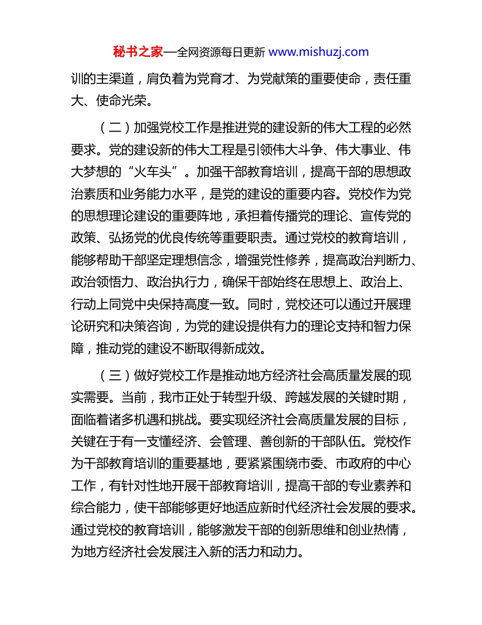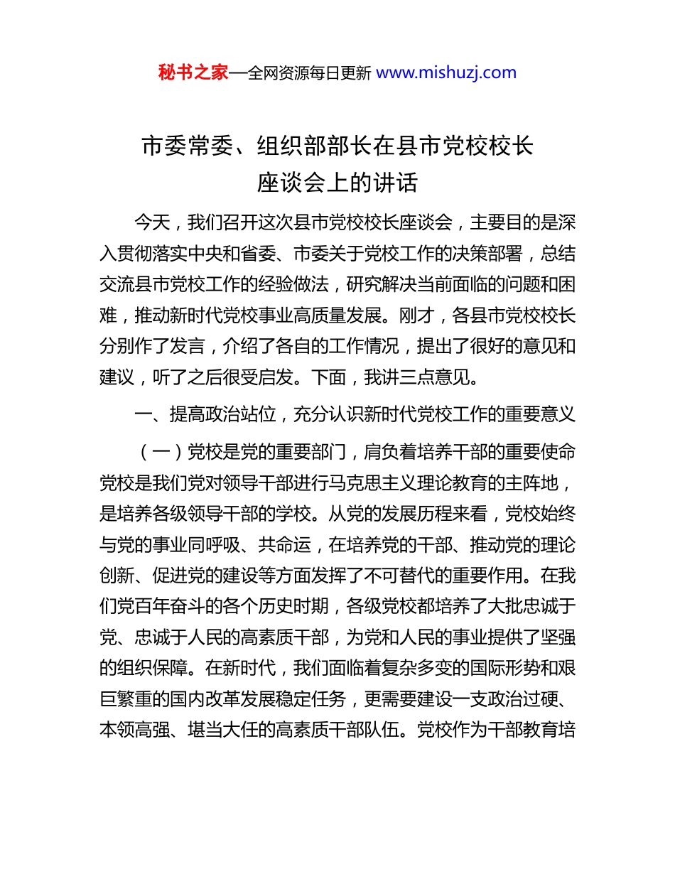 秘书之家—全网资源每日更新 www.mishuzj.com市委常委、组织部部长在县市党校校长座谈会上的讲话今天,我们召开这次县市党校校长座谈会,主要目的是深入贯彻落实中央和省委、市委关于党校工作的决策部署,总结交流县市党校工作的经验做法,研究解决当前面临的问题和困难,推动新时代党校事业高质量发展。刚才,各县市党校校长分别作了发言,介绍了各自的工作情况,提出了很好的意见和建议,听了之后很受启发。下面,我讲三点意见。一、提高政治站位,充分认识新时代党校工作的重要意义(一)党校是党的重要部门,肩负着培养干部的重要使命党校是我们党对领导干部进行马克思主义理论教育的主阵地,是培养各级领导干部的学校。从党的发展历程来看,党校始终与党的事业同呼吸、共命运,在培养党的干部、推动党的理论创新、促进党的建设等方面发挥了不可替代的重要作用。在我们党百年奋斗的各个历史时期,各级党校都培养了大批忠诚于党、忠诚于人民的高素质干部,为党和人民的事业提供了坚强的组织保障。在新时代,我们面临着复杂多变的国际形势和艰巨繁重的国内改革发展稳定任务,更需要建设一支政治过硬、本领高强、堪当大任的高素质干部队伍。党校作为干部教育培秘书之家—全网资源每日更新 www.mishuzj.com训的主渠道,肩负着为党育才、为党献策的重要使命,责任重大、使命光荣。(二)加强党校工作是推进党的建设新的伟大工程的必然要求。党的建设新的伟大工程是引领伟大斗争、伟大事业、伟大梦想的“火车头”。加强干部教育培训,提高干部的思想政治素质和业务能力水平,是党的建设的重要内容。党校作为党的思想理论建设的重要阵地,承担着传播党的理论、宣传党的政策、弘扬党的优良传统等重要职责。通过党校的教育培训,能够帮助干部坚定理想信念,增强党性修养,提高政治判断力、政治领悟力、政治执行力,确保干部始终在思想上、政治上、行动上同党中央保持高度一致。同时,党校还可以通过开展理论研究和决策咨询,为党的建设提供有力的理论支持和智力保障,推动党的建设不断取得新成效。(三)做好党校工作是推动地方经济社会高质量发展的现实需要。当前,我市正处于转型升级、跨越发展的关键时期,面临着诸多机遇和挑战。要实现经济社会高质量发展的目标,关键在于有一支懂经济、会管理、善创新的干部队伍。党校作为干部教育培训的重要基地,要紧紧围绕市委、市政府的中心工作,有针对性地开展干部教育培训,提高干部的专业素养和综合能力,使干部能够更好地适应新时代经济社会发展的要求。通过党校的教育培训,能够激发干部的创新思维和创业热情,为地方经济社会发展注入新的活力和动力。秘书之家—全网资源每日更新 www.mishuzj.com二、聚焦主责主业,全面提升党校办学治校水平(一)坚持质量立校,提高干部教育培训的针对性和实效性。质量是党校的生命线。要坚持把提高教学质量作为中心环节,不断优化教学内容,改进教学方法,提高教学水平。一是要优化课程设置。紧紧围绕党的理论教育和党性教育这个主业主课,合理设置课程体系,突出重点、注重实效。要加强马克思主义基本原理、中国特色社会主义理论体系等基础理论课程的教学,打牢干部的理论根基。同时,要结合地方实际和干部需求,开设一些具有针对性、实用性的专业课程,如经济发展、社会治理、乡村振兴等,提高干部解决实际问题的能力。二是要改进教学方法。积极探索多样化的教学方法,如案例教学、现场教学、模拟教学、研讨式教学等,增强教学的吸引力和感染力。要注重运用现代信息技术手段,开展线上线下相结合的混合式教学,提高教学的效率和效果。三是要加强师资队伍建设。教师是党校教学的主体,师资队伍的素质直接关系到教学质量的高低。要加大师资培养力度,通过选派教师到上级党校进修学习、到基层挂职锻炼、参加学术交流等方式,提高教师的业务水平和教学能力。要建立健全师资考核评价机制,激励教师积极投身教学科研工作,打造一支政治强、业务精、作风正的高素质师资队伍。(二)坚持科研兴校,提升党校的科研咨询能力和学术影响力。科研是党校发展的基础支撑。要坚持教学与科研相结合,秘书之家—全...