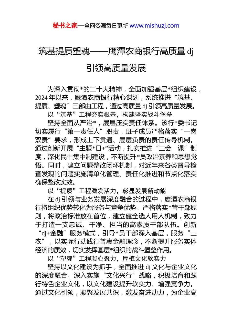 秘书之家—全网资源每日更新 www.mishuzj.com筑基提质塑魂——鹰潭农商银行高质量 dj引领高质量发展为深入贯彻*的二十大精神,全面加强基层*组织建设,2024 年以来,鹰潭农商银行精心谋划,系统推进“筑基、提质、塑魂”三部曲工程,通过高质量 dj 引领高质量发展。以“筑基”工程夯实根基,构建坚实战斗堡垒坚持全面从严治*,层层压实责任体系。该行*委书记切实履行“第一责任人”职责,班子成员严格落实“一岗双责”要求,形成上下贯通、层层负责的责任传导机制。通过创新开展“主题*日+”活动,扎实推进“三会一课”制度,深化民主集中制建设,不断提升*员政治素养和思想觉悟。同时,建立问题整改闭环机制,对近年来各类督导检查发现的问题实施清单化管理、责任化推进和节点化落实确保整改实效。以“提质”工程激发活力,彰显发展新动能在 dj 引领与业务发展深度融合的过程中,鹰潭农商银行将组织优势转化为服务与竞争优势。严格落实*管干部原则,将政治标准放在首位,建立健全选人用人机制,致力于打造一支忠诚、干净、担当的高素质干部队伍。创新“dj+金融”服务模式,引导*员干部深入基层,服务“三农”,以实际行动践行普惠金融理念,不断提升服务实体经济的质效,切实发挥基层*组织的战斗堡垒作用。以“塑魂”工程凝心聚力,厚植文化软实力坚持以文化建设为抓手,全面推进 dj 文化与企业文化的深度融合。深入实施“文化兴行”战略,积极培育和践行特色企业文化,以文化建设提升软实力、增强竞争力。通过文化引领,凝聚发展共识,激发奋进动力,为企业高秘书之家—全网资源每日更新 www.mishuzj.com质量可持续发展注入强大精神动力。通过三部曲工程的系统推进,鹰潭农商银行的 dj 工作展现出组织更加坚强有力、队伍更加奋发有为、文化更加特色鲜明的良好局面,为推动企业高质量发展提供了坚强的政治保证和组织保障。