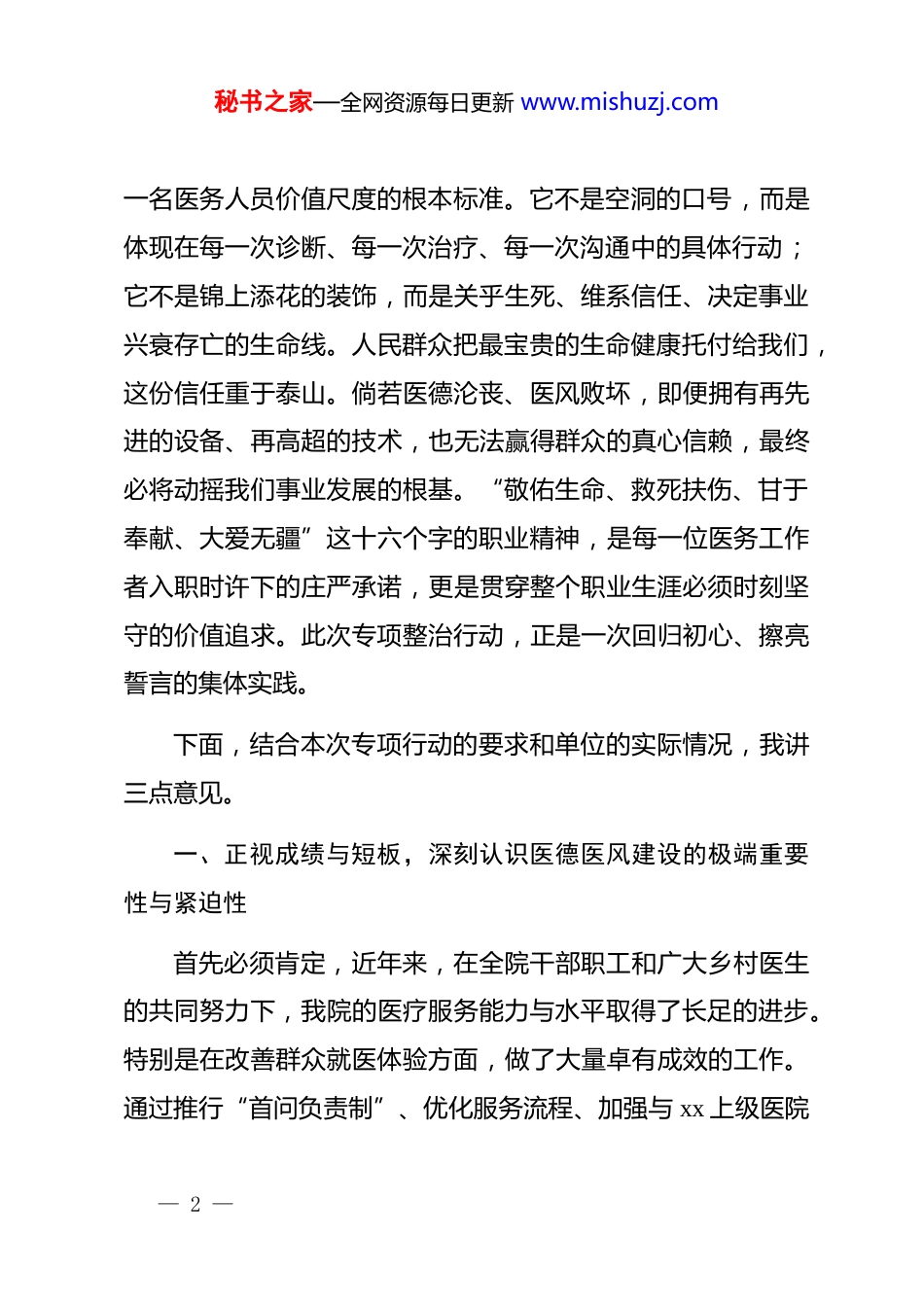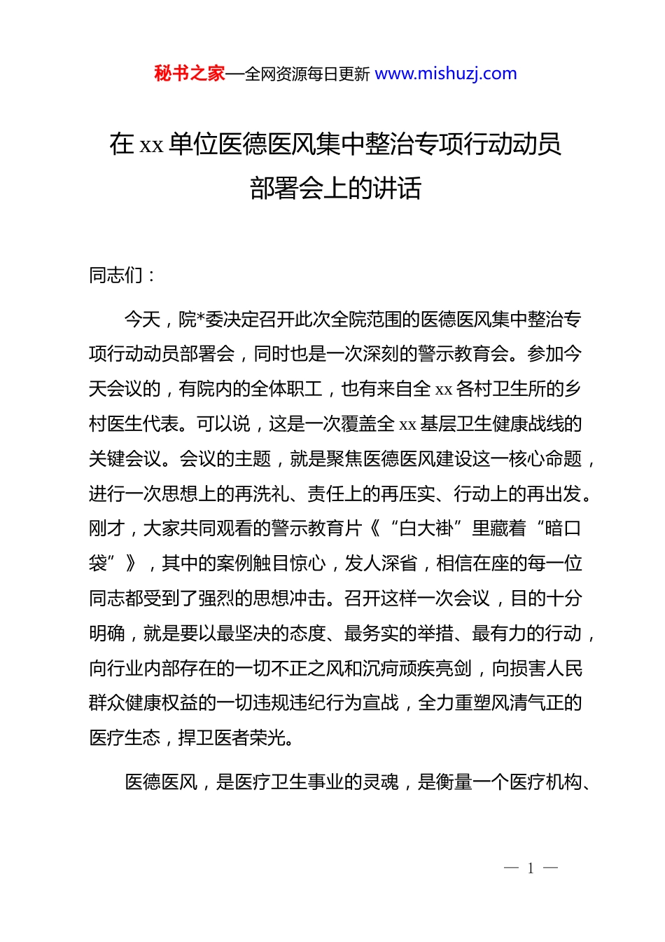 秘书之家—全网资源每日更新 www.mishuzj.com在 xx 单位医德医风集中整治专项行动动员部署会上的讲话同志们:今天,院*委决定召开此次全院范围的医德医风集中整治专项行动动员部署会,同时也是一次深刻的警示教育会。参加今天会议的,有院内的全体职工,也有来自全 xx 各村卫生所的乡村医生代表。可以说,这是一次覆盖全 xx 基层卫生健康战线的关键会议。会议的主题,就是聚焦医德医风建设这一核心命题,进行一次思想上的再洗礼、责任上的再压实、行动上的再出发。刚才,大家共同观看的警示教育片《“白大褂”里藏着“暗口袋”》,其中的案例触目惊心,发人深省,相信在座的每一位同志都受到了强烈的思想冲击。召开这样一次会议,目的十分明确,就是要以最坚决的态度、最务实的举措、最有力的行动,向行业内部存在的一切不正之风和沉疴顽疾亮剑,向损害人民群众健康权益的一切违规违纪行为宣战,全力重塑风清气正的医疗生态,捍卫医者荣光。医德医风,是医疗卫生事业的灵魂,是衡量一个医疗机构、— 1 —秘书之家—全网资源每日更新 www.mishuzj.com一名医务人员价值尺度的根本标准。它不是空洞的口号,而是体现在每一次诊断、每一次治疗、每一次沟通中的具体行动;它不是锦上添花的装饰,而是关乎生死、维系信任、决定事业兴衰存亡的生命线。人民群众把最宝贵的生命健康托付给我们,这份信任重于泰山。倘若医德沦丧、医风败坏,即便拥有再先进的设备、再高超的技术,也无法赢得群众的真心信赖,最终必将动摇我们事业发展的根基。“敬佑生命、救死扶伤、甘于奉献、大爱无疆”这十六个字的职业精神,是每一位医务工作者入职时许下的庄严承诺,更是贯穿整个职业生涯必须时刻坚守的价值追求。此次专项整治行动,正是一次回归初心、擦亮誓言的集体实践。下面,结合本次专项行动的要求和单位的实际情况,我讲三点意见。一、正视成绩与短板,深刻认识医德医风建设的极端重要性与紧迫性首先必须肯定,近年来,在全院干部职工和广大乡村医生的共同努力下,我院的医疗服务能力与水平取得了长足的进步。特别是在改善群众就医体验方面,做了大量卓有成效的工作。通过推行“首问负责制”、优化服务流程、加强与 xx 上级医院— 2 —秘书之家—全网资源每日更新 www.mishuzj.com的紧密协作,实现了“基层检查、上级诊断”的便捷模式,我们的服务质量得到了群众的广泛认可。根据最新的满意度调查数据显示,患者满意度从过去的 75%提升到了目前的 96%以上。这个数字的背后,是大家日复一日的辛勤付出和无私奉献,是在座各位用心、用情服务群众的生动体现。在此,我代表院*委,向大家表示衷心的感谢!然而,成绩面前,我们绝不能沾沾自喜、盲目乐观。必须清醒地看到,与新时代人民群众对高质量健康服务的新期待相比,与全面从严治*、纵深推进清廉医院建设的新要求相比,我们工作中存在的短板和问题依然不容忽视。正如刚才的警示片所揭示的,医疗领域绝非净土,“白大褂”里也可能藏污纳垢。这些问题,虽然可能只发生在少数人身上,但其破坏性极大,足以侵蚀我们好不容易建立起来的信任基石。综合日常监督、信访投诉和巡查情况来看,当前我们的医德医风建设主要面临以下几个方面的突出问题:第一,思想认识存在温差。部分同志对医德医风建设的重要性认识不足,存在“重业务、轻医德”的倾向。认为只要技术过硬,服务态度差一点、行为规范松一点无伤大雅。这种思想偏差,是滋生各种问题的根本原因。有的同志纪律观念淡薄,— 3 —秘书之家—全网资源每日更新 www.mishuzj.com对行业纪律和规章制度缺乏应有的敬畏之心,把组织的反复提醒当作“耳旁风”,把廉洁行医的规定视为“稻草人”,在思想的源头上就放松了警惕。第二,服务行为存在偏差。在日常工作中,少数医务人员服务意识不强,缺乏应有的耐心和同理心。面对患者的询问,表现出不耐烦甚至冷漠;在诊疗过程中,沟通解释不到位,引发患者的疑虑和不满。更有甚者,存在推诿扯皮、敷衍塞责的现象,没有真正把患者的疾苦放在心上。这些行为,直接伤害了医患感情,也与我们 96%的总体满意度形成了巨大反差,说明我们的服务质量还...