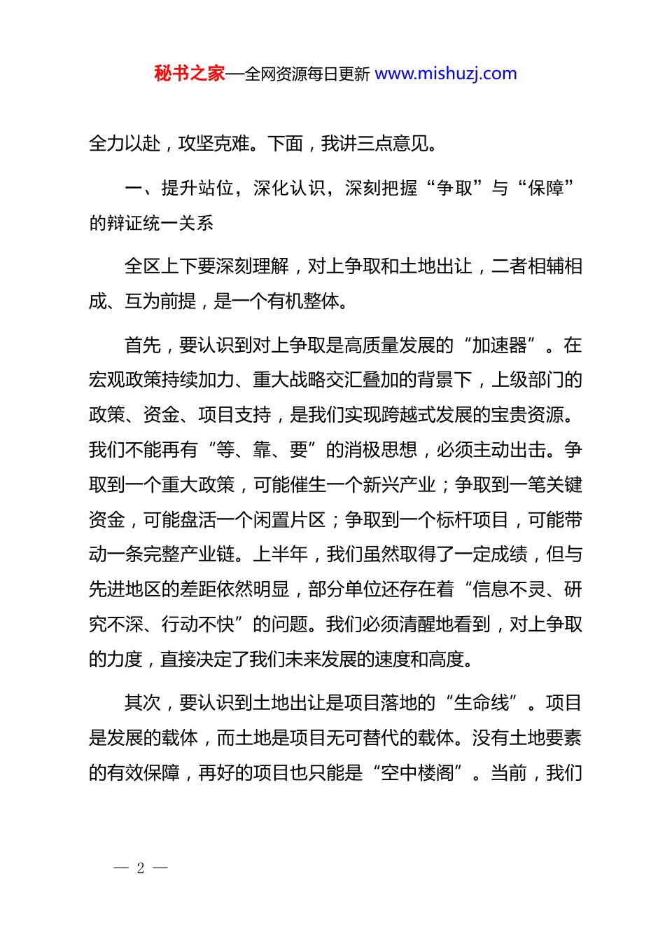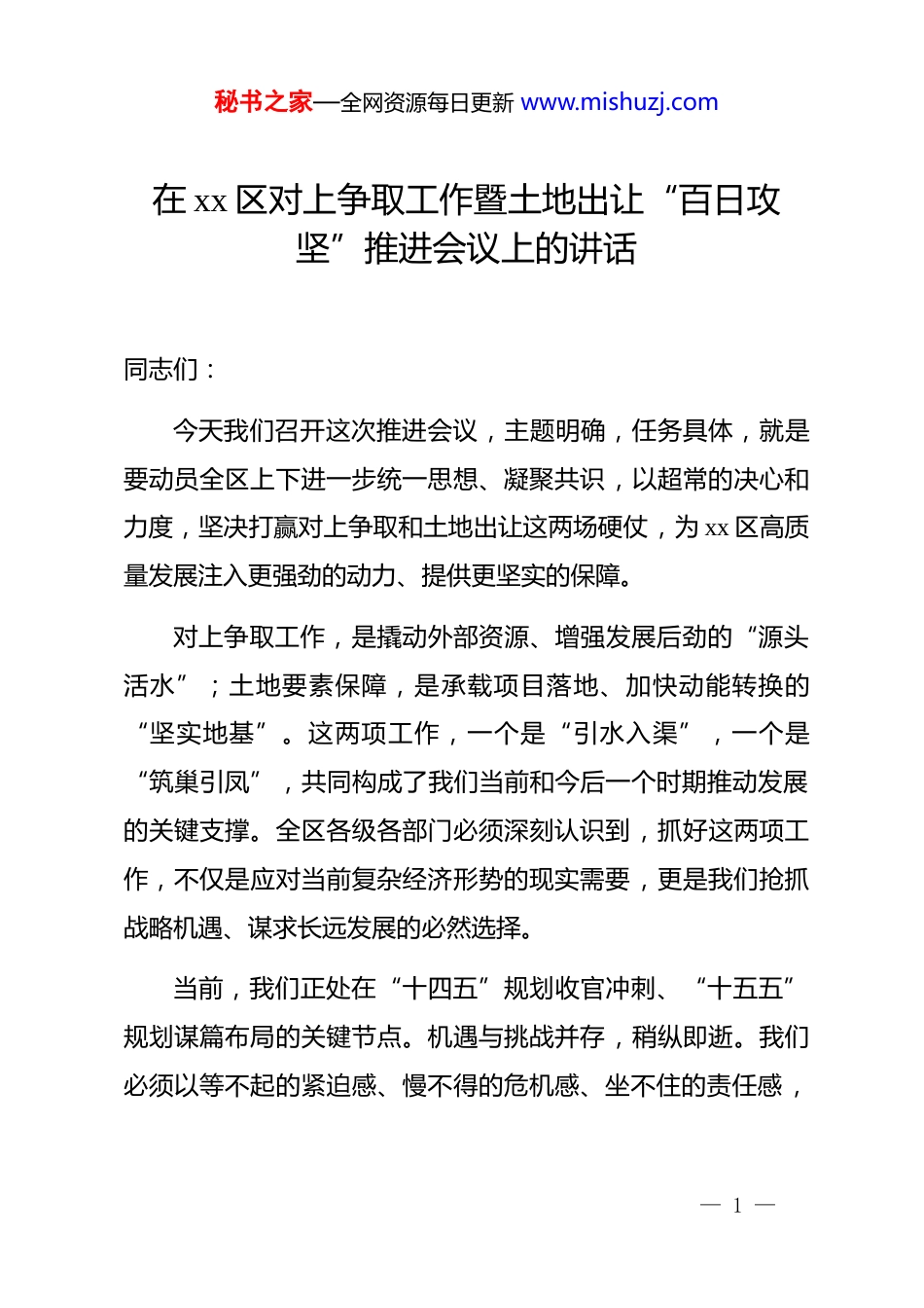 秘书之家—全网资源每日更新 www.mishuzj.com在 xx 区对上争取工作暨土地出让“百日攻坚”推进会议上的讲话同志们:今天我们召开这次推进会议,主题明确,任务具体,就是要动员全区上下进一步统一思想、凝聚共识,以超常的决心和力度,坚决打赢对上争取和土地出让这两场硬仗,为 xx 区高质量发展注入更强劲的动力、提供更坚实的保障。对上争取工作,是撬动外部资源、增强发展后劲的“源头活水”;土地要素保障,是承载项目落地、加快动能转换的“坚实地基”。这两项工作,一个是“引水入渠”,一个是“筑巢引凤”,共同构成了我们当前和今后一个时期推动发展的关键支撑。全区各级各部门必须深刻认识到,抓好这两项工作,不仅是应对当前复杂经济形势的现实需要,更是我们抢抓战略机遇、谋求长远发展的必然选择。当前,我们正处在“十四五”规划收官冲刺、“十五五”规划谋篇布局的关键节点。机遇与挑战并存,稍纵即逝。我们必须以等不起的紧迫感、慢不得的危机感、坐不住的责任感,— 1 —秘书之家—全网资源每日更新 www.mishuzj.com全力以赴,攻坚克难。下面,我讲三点意见。一、提升站位,深化认识,深刻把握“争取”与“保障”的辩证统一关系全区上下要深刻理解,对上争取和土地出让,二者相辅相成、互为前提,是一个有机整体。首先,要认识到对上争取是高质量发展的“加速器”。在宏观政策持续加力、重大战略交汇叠加的背景下,上级部门的政策、资金、项目支持,是我们实现跨越式发展的宝贵资源。我们不能再有“等、靠、要”的消极思想,必须主动出击。争取到一个重大政策,可能催生一个新兴产业;争取到一笔关键资金,可能盘活一个闲置片区;争取到一个标杆项目,可能带动一条完整产业链。上半年,我们虽然取得了一定成绩,但与先进地区的差距依然明显,部分单位还存在着“信息不灵、研究不深、行动不快”的问题。我们必须清醒地看到,对上争取的力度,直接决定了我们未来发展的速度和高度。其次,要认识到土地出让是项目落地的“生命线”。项目是发展的载体,而土地是项目无可替代的载体。没有土地要素的有效保障,再好的项目也只能是“空中楼阁”。当前,我们— 2 —秘书之家—全网资源每日更新 www.mishuzj.com正面临一批事关全局的重大产业项目、基础设施项目亟待落地的关键时期。然而,土地供给的瓶颈问题日益凸显,存量土地盘活不力、新增指标获取困难、出让流程耗时过长等问题,已经成为制约我们发展的“中梗阻”。开展土地出让“百日攻坚”,就是要集中力量,清除障碍,为好项目、大项目腾出空间、备足“粮草”,确保项目能够拿地即开工,尽快形成实物工作量。最后,要将二者贯通起来,实现“引水”与“蓄水”的良性循环。我们要通过积极的对上争取,获取更多的用地指标、更优的土地政策,为土地出让创造有利条件。同时,高效的土地出让,能够推动项目快速落地、产生效益,形成新的经济增长点,这将成为我们向上争取更多支持的坚实底气和亮眼“成绩单”。只有将二者紧密结合,一体推进,才能形成“争取政策、保障土地、落地项目、促进发展”的完整工作闭环。二、聚焦重点,精准发力,奋力开创对上争取工作新局面做好对上争取工作,不能“大水漫灌”,必须“精准滴灌”。要围绕中心,服务大局,在“准”和“实”上下足功夫。第一,在政策研究上要再“深一度”。各部门要把政策研— 3 —秘书之家—全网资源每日更新 www.mishuzj.com究作为一门必修课。要紧盯国家关于新质生产力、数字经济、区域协调发展等重大战略部署,深入研究国家发改委、工信部、财政部等部委的最新政策导向和资金投向。比如,国家正在推动的大规模设备更新和消费品以旧换新行动,其中蕴含着巨大的资金和项目机遇,我们的经信、商务、发改等部门有没有进行系统梳理?有没有包装策划出与之匹配的项目库?我们必须变“被动接球”为“主动发球”,做到对上级政策了然于胸,对争取方向心中有数。第二,在项目谋划上要再“高一格”。项目是争取的“敲门砖”。要下大力气提升项目谋划的质量和水平,建立健全“储备一批、开工一批、建设一批、投产一批”的滚动项目库。要聚焦我区“五个倍增”...