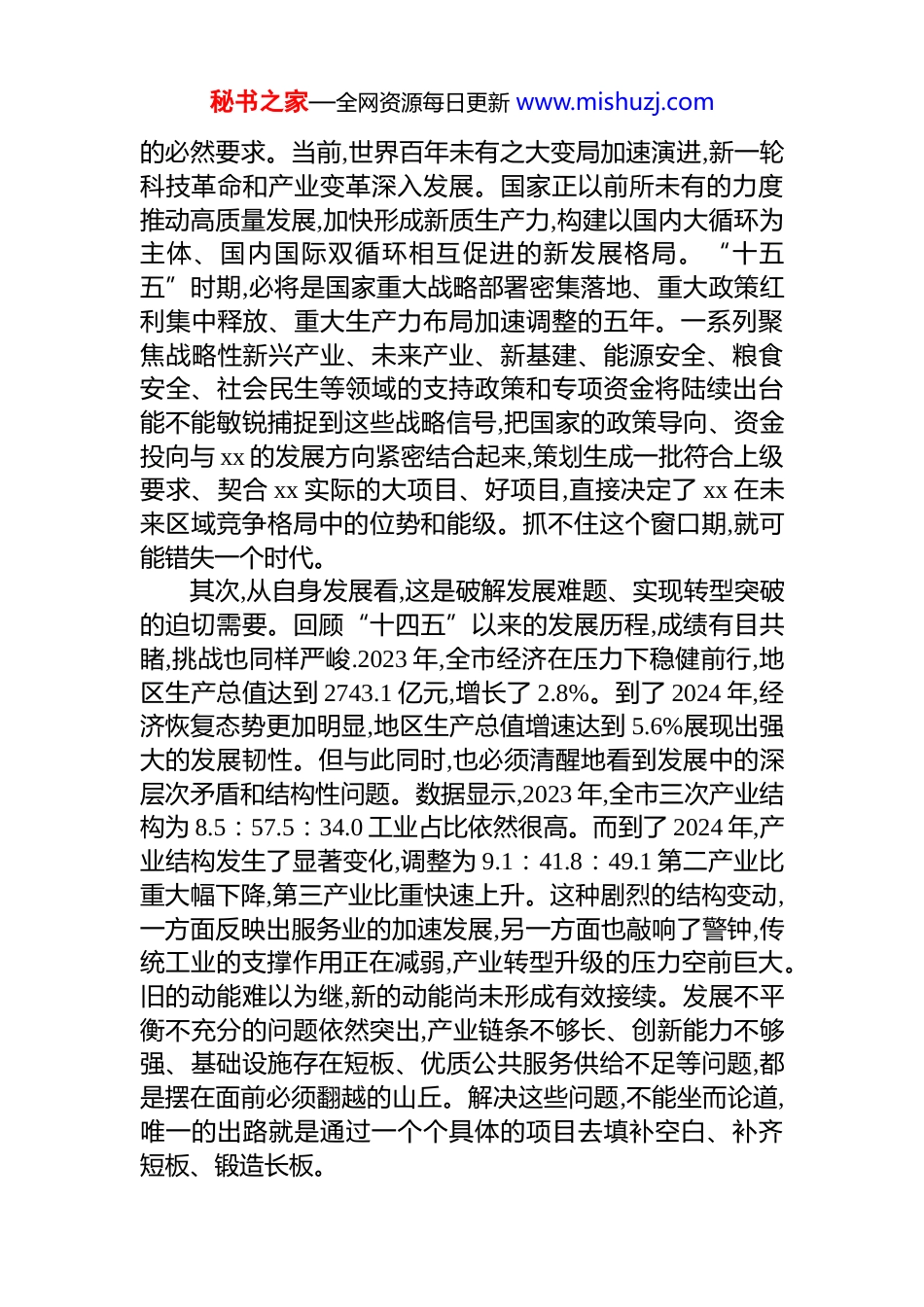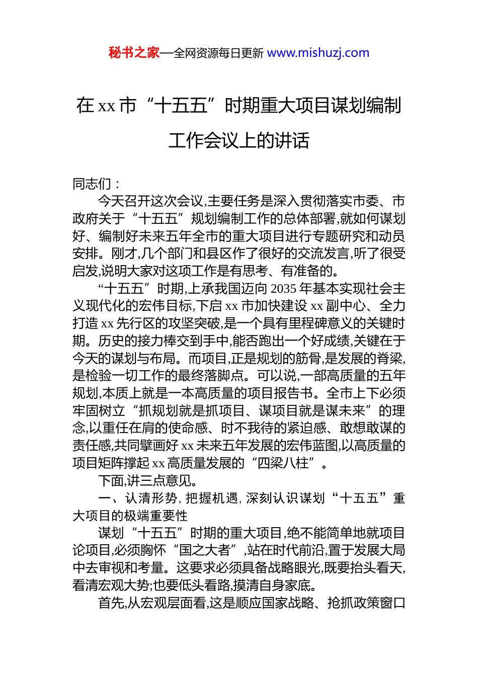 秘书之家—全网资源每日更新 www.mishuzj.com在 xx 市“十五五”时期重大项目谋划编制工作会议上的讲话同志们:今天召开这次会议,主要任务是深入贯彻落实市委、市政府关于“十五五”规划编制工作的总体部署,就如何谋划好、编制好未来五年全市的重大项目进行专题研究和动员安排。刚才,几个部门和县区作了很好的交流发言,听了很受启发,说明大家对这项工作是有思考、有准备的。“十五五”时期,上承我国迈向 2035 年基本实现社会主义现代化的宏伟目标,下启 xx 市加快建设 xx 副中心、全力打造 xx 先行区的攻坚突破,是一个具有里程碑意义的关键时期。历史的接力棒交到手中,能否跑出一个好成绩,关键在于今天的谋划与布局。而项目,正是规划的筋骨,是发展的脊梁,是检验一切工作的最终落脚点。可以说,一部高质量的五年规划,本质上就是一本高质量的项目报告书。全市上下必须牢固树立“抓规划就是抓项目、谋项目就是谋未来”的理念,以重任在肩的使命感、时不我待的紧迫感、敢想敢谋的责任感,共同擘画好 xx 未来五年发展的宏伟蓝图,以高质量的项目矩阵撑起 xx 高质量发展的“四梁八柱”。下面,讲三点意见。一、认清形势,把握机遇,深刻认识谋划“十五五”重大项目的极端重要性谋划“十五五”时期的重大项目,绝不能简单地就项目论项目,必须胸怀“国之大者”,站在时代前沿,置于发展大局中去审视和考量。这要求必须具备战略眼光,既要抬头看天,看清宏观大势;也要低头看路,摸清自身家底。首先,从宏观层面看,这是顺应国家战略、抢抓政策窗口秘书之家—全网资源每日更新 www.mishuzj.com的必然要求。当前,世界百年未有之大变局加速演进,新一轮科技革命和产业变革深入发展。国家正以前所未有的力度推动高质量发展,加快形成新质生产力,构建以国内大循环为主体、国内国际双循环相互促进的新发展格局。“十五五”时期,必将是国家重大战略部署密集落地、重大政策红利集中释放、重大生产力布局加速调整的五年。一系列聚焦战略性新兴产业、未来产业、新基建、能源安全、粮食安全、社会民生等领域的支持政策和专项资金将陆续出台能不能敏锐捕捉到这些战略信号,把国家的政策导向、资金投向与 xx 的发展方向紧密结合起来,策划生成一批符合上级要求、契合 xx 实际的大项目、好项目,直接决定了 xx 在未来区域竞争格局中的位势和能级。抓不住这个窗口期,就可能错失一个时代。其次,从自身发展看,这是破解发展难题、实现转型突破的迫切需要。回顾“十四五”以来的发展历程,成绩有目共睹,挑战也同样严峻.2023 年,全市经济在压力下稳健前行,地区生产总值达到 2743.1 亿元,增长了 2.8%。到了 2024 年,经济恢复态势更加明显,地区生产总值增速达到 5.6%展现出强大的发展韧性。但与此同时,也必须清醒地看到发展中的深层次矛盾和结构性问题。数据显示,2023 年,全市三次产业结构为 8.5:57.5:34.0 工业占比依然很高。而到了 2024 年,产业结构发生了显著变化,调整为 9.1:41.8:49.1 第二产业比重大幅下降,第三产业比重快速上升。这种剧烈的结构变动,一方面反映出服务业的加速发展,另一方面也敲响了警钟,传统工业的支撑作用正在减弱,产业转型升级的压力空前巨大。旧的动能难以为继,新的动能尚未形成有效接续。发展不平衡不充分的问题依然突出,产业链条不够长、创新能力不够强、基础设施存在短板、优质公共服务供给不足等问题,都是摆在面前必须翻越的山丘。解决这些问题,不能坐而论道,唯一的出路就是通过一个个具体的项目去填补空白、补齐短板、锻造长板。秘书之家—全网资源每日更新 www.mishuzj.com最后,从未来愿景看,这是奠定长远优势、实现宏伟蓝图的坚实根基。市委、市政府提出的建设 xx 副中心、打造 xx先行区的目标,不是轻轻松松、敲锣打鼓就能实现的。宏伟蓝图的实现,需要坚实的物质基础和强大的实体支撑。未来五年,xx 能不能在区域发展中脱颖而出,能不能在产业竞争中占据一席之地,能不能让人民群众的获得感、幸福感、安全感更加充实,归根结底要靠一批具有全局性、基础性、引领性的重大项目来驱动和保障。今天谋划的一个重大产业项目,可能就是五年后一个新的经济增长极;今天布...
