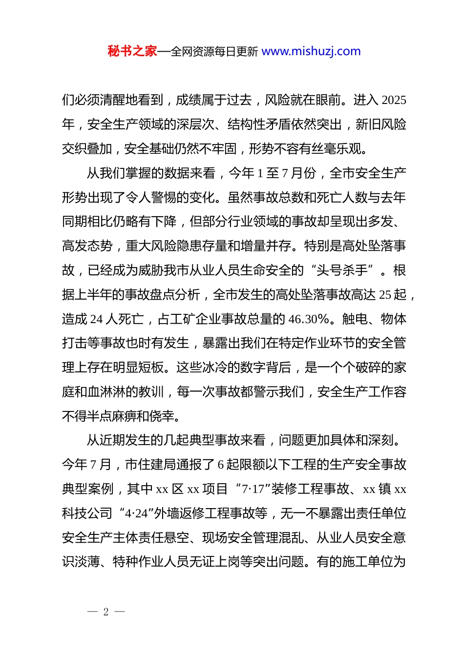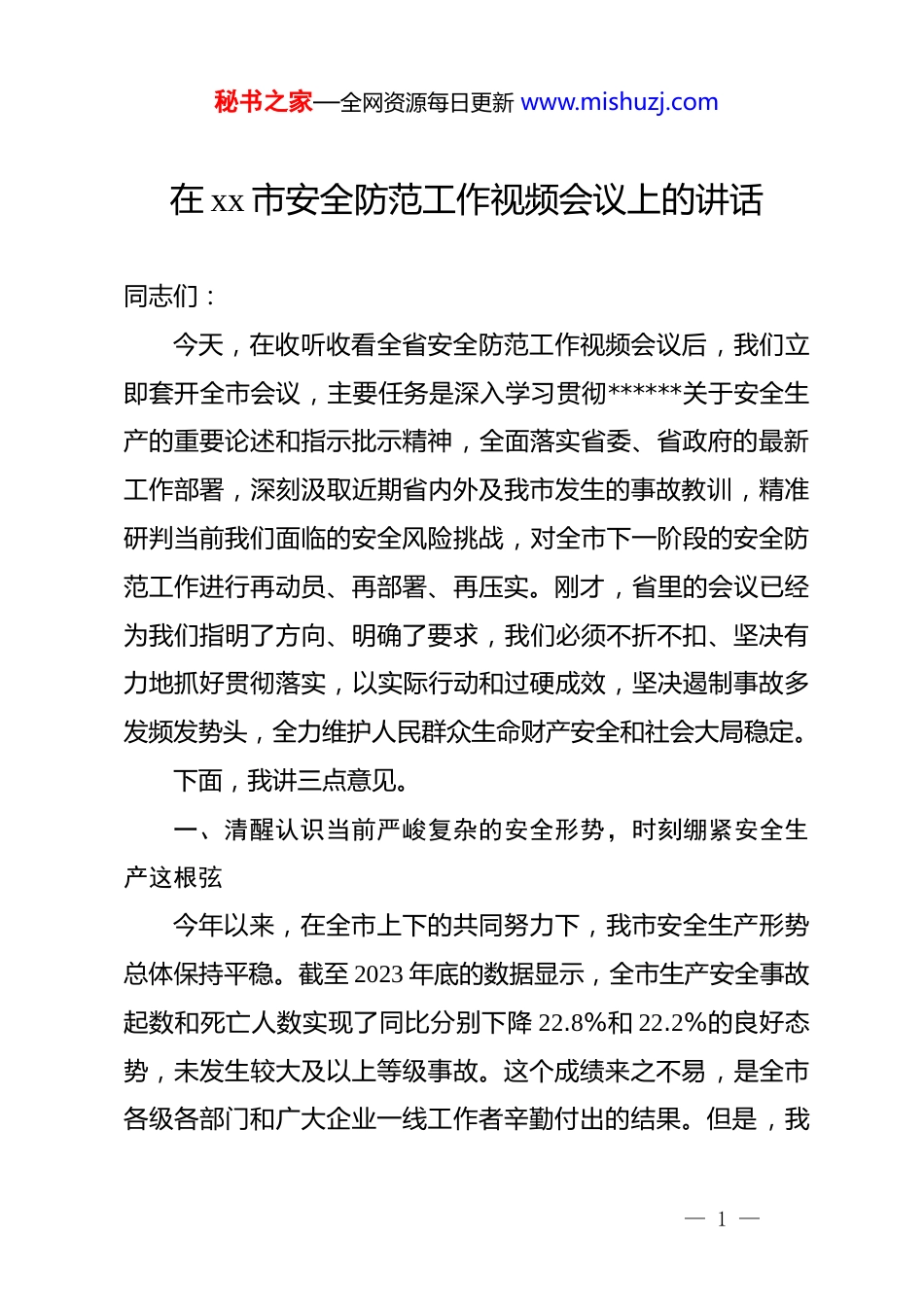 秘书之家—全网资源每日更新 www.mishuzj.com在 xx 市安全防范工作视频会议上的讲话同志们:今天,在收听收看全省安全防范工作视频会议后,我们立即套开全市会议,主要任务是深入学习贯彻******关于安全生产的重要论述和指示批示精神,全面落实省委、省政府的最新工作部署,深刻汲取近期省内外及我市发生的事故教训,精准研判当前我们面临的安全风险挑战,对全市下一阶段的安全防范工作进行再动员、再部署、再压实。刚才,省里的会议已经为我们指明了方向、明确了要求,我们必须不折不扣、坚决有力地抓好贯彻落实,以实际行动和过硬成效,坚决遏制事故多发频发势头,全力维护人民群众生命财产安全和社会大局稳定。下面,我讲三点意见。一、清醒认识当前严峻复杂的安全形势,时刻绷紧安全生产这根弦今年以来,在全市上下的共同努力下,我市安全生产形势总体保持平稳。截至 2023 年底的数据显示,全市生产安全事故起数和死亡人数实现了同比分别下降 22.8%和 22.2%的良好态势,未发生较大及以上等级事故。这个成绩来之不易,是全市各级各部门和广大企业一线工作者辛勤付出的结果。但是,我— 1 —秘书之家—全网资源每日更新 www.mishuzj.com们必须清醒地看到,成绩属于过去,风险就在眼前。进入 2025年,安全生产领域的深层次、结构性矛盾依然突出,新旧风险交织叠加,安全基础仍然不牢固,形势不容有丝毫乐观。从我们掌握的数据来看,今年 1 至 7 月份,全市安全生产形势出现了令人警惕的变化。虽然事故总数和死亡人数与去年同期相比仍略有下降,但部分行业领域的事故却呈现出多发、高发态势,重大风险隐患存量和增量并存。特别是高处坠落事故,已经成为威胁我市从业人员生命安全的“头号杀手”。根据上半年的事故盘点分析,全市发生的高处坠落事故高达 25 起,造成 24 人死亡,占工矿企业事故总量的 46.30%。触电、物体打击等事故也时有发生,暴露出我们在特定作业环节的安全管理上存在明显短板。这些冰冷的数字背后,是一个个破碎的家庭和血淋淋的教训,每一次事故都警示我们,安全生产工作容不得半点麻痹和侥幸。从近期发生的几起典型事故来看,问题更加具体和深刻。今年 7 月,市住建局通报了 6 起限额以下工程的生产安全事故典型案例,其中 xx 区 xx 项目“7·17”装修工程事故、xx 镇 xx科技公司“4·24”外墙返修工程事故等,无一不暴露出责任单位安全生产主体责任悬空、现场安全管理混乱、从业人员安全意识淡薄、特种作业人员无证上岗等突出问题。有的施工单位为— 2 —秘书之家—全网资源每日更新 www.mishuzj.com了赶工期、降成本,甚至连最基本的安全防护措施都未落实,安全带不挂、防护网不设,视安全生产法规为一纸空文,最终导致了不可挽回的悲剧,相关责任单位和责任人也因此受到了最高达 85 万元的顶格处罚。这些案例充分说明,安全生产的责任压力在向基层传导过程中,存在着“上热、中温、下冷”的现象,一些企业负责人“人民至上、生命至上”的理念树得不牢,安全生产的红线意识和底线思维没有真正入脑入心。从我们面临的外部环境来看,挑战同样严峻。当前正值主汛期、台风季,极端天气事件多发频发,强降雨、雷电、大风等灾害性天气,极易引发山体滑坡、城市内涝、建筑倒塌等次生灾害。同时,我市经济社会活动全面恢复,各类生产经营建设活动繁忙,人流、物流、车流高度集中,加之“工业上楼”等新业态、新模式不断涌现,带来了许多前所未有的新型安全风险。这些都对我们的监管能力、应急处置能力提出了更高的要求。同志们,安全生产大于天,责任重于泰山。我们必须始终保持“时时放心不下”的责任感和“睁眼睡觉”的警觉性,深刻认识到抓安全生产就是抓发展、抓民生、抓稳定。全市各级各部门、各单位要立即从思想上、行动上紧张起来,把问题想得更复杂一些,把困难估计得更充分一些,以最坚决的态度、— 3 —秘书之家—全网资源每日更新 www.mishuzj.com最严格的要求、最扎实的举措,全力以赴投入到安全防范工作中去。二、深入贯彻上级决策部署,坚决打好安全生产治本攻坚之战省委、省政府高度重视安全生产工作,近期专...