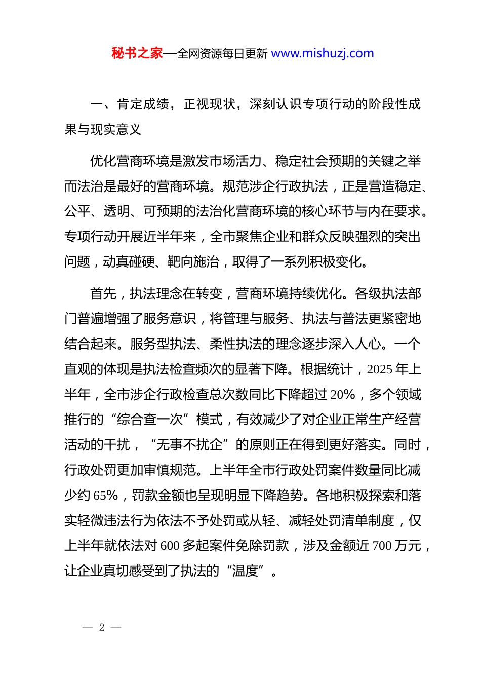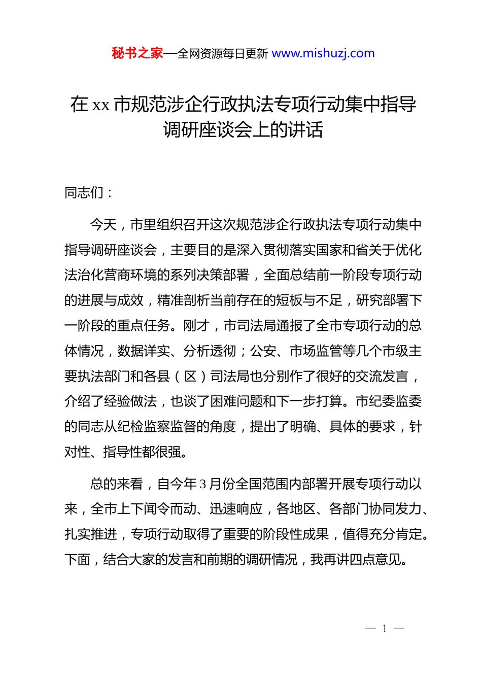 秘书之家—全网资源每日更新 www.mishuzj.com在 xx 市规范涉企行政执法专项行动集中指导调研座谈会上的讲话同志们:今天,市里组织召开这次规范涉企行政执法专项行动集中指导调研座谈会,主要目的是深入贯彻落实国家和省关于优化法治化营商环境的系列决策部署,全面总结前一阶段专项行动的进展与成效,精准剖析当前存在的短板与不足,研究部署下一阶段的重点任务。刚才,市司法局通报了全市专项行动的总体情况,数据详实、分析透彻;公安、市场监管等几个市级主要执法部门和各县(区)司法局也分别作了很好的交流发言,介绍了经验做法,也谈了困难问题和下一步打算。市纪委监委的同志从纪检监察监督的角度,提出了明确、具体的要求,针对性、指导性都很强。总的来看,自今年 3 月份全国范围内部署开展专项行动以来,全市上下闻令而动、迅速响应,各地区、各部门协同发力、扎实推进,专项行动取得了重要的阶段性成果,值得充分肯定。下面,结合大家的发言和前期的调研情况,我再讲四点意见。— 1 —秘书之家—全网资源每日更新 www.mishuzj.com一、肯定成绩,正视现状,深刻认识专项行动的阶段性成果与现实意义优化营商环境是激发市场活力、稳定社会预期的关键之举而法治是最好的营商环境。规范涉企行政执法,正是营造稳定、公平、透明、可预期的法治化营商环境的核心环节与内在要求。专项行动开展近半年来,全市聚焦企业和群众反映强烈的突出问题,动真碰硬、靶向施治,取得了一系列积极变化。首先,执法理念在转变,营商环境持续优化。各级执法部门普遍增强了服务意识,将管理与服务、执法与普法更紧密地结合起来。服务型执法、柔性执法的理念逐步深入人心。一个直观的体现是执法检查频次的显著下降。根据统计,2025 年上半年,全市涉企行政检查总次数同比下降超过 20%,多个领域推行的“综合查一次”模式,有效减少了对企业正常生产经营活动的干扰,“无事不扰企”的原则正在得到更好落实。同时,行政处罚更加审慎规范。上半年全市行政处罚案件数量同比减少约 65%,罚款金额也呈现明显下降趋势。各地积极探索和落实轻微违法行为依法不予处罚或从轻、减轻处罚清单制度,仅上半年就依法对 600 多起案件免除罚款,涉及金额近 700 万元,让企业真切感受到了执法的“温度”。— 2 —秘书之家—全网资源每日更新 www.mishuzj.com其次,突出问题在整治,企业获得感不断增强。专项行动聚焦乱检查、乱罚款、乱收费等顽瘴痼疾,开展集中整治。通过在政务服务平台、工商联等渠道设立问题线索征集专区,累计收到各类问题线索超过百条,目前办结率已达 90%以上。针对一些企业反映的个别单位违规设立收费项目、转嫁成本等问题,相关部门迅速核查、坚决纠正,为企业挽回经济损失数千万元。通过专项整治,过去一些领域存在的执法不公、标准不一、畸轻畸重等现象得到了有效遏制,市场主体的公平感和安全感有了实质性提升。最后,制度机制在完善,长效常治基础更加牢固。各地各部门以专项行动为契机,把解决具体问题与推进制度建设结合起来,边查边改、边改边建。市级层面,正在加快制定和完善重点领域行政裁量权基准,力求消除执法尺度不统一的问题。各县(区)也结合实际,出台了关于进一步规范行政检查、完善执法协作机制等一系列制度文件。同时,执法监督的协同性显著增强。司法行政部门的法治监督,与纪检监察监督、人大监督、舆论监督等贯通协同,形成了一张覆盖事前、事中、事后的严密监督网络,推动执法行为在阳光下运行。在肯定成绩的同时,也必须清醒地看到,对照国家和省里— 3 —秘书之家—全网资源每日更新 www.mishuzj.com的更高要求,对照企业和群众的更高期待,工作中仍然存在一些不容忽视的短板和弱项。一是思想认识存在“温差”。少数单位和执法人员对专项行动的极端重要性认识还不够深刻,没有完全从优化全市营商环境、推动高质量发展的战略高度来审视和推进这项工作。有的还停留在“就执法谈执法”的层面,认为规范执法会“束手束脚”,影响执法权威;有的存在“一阵风”思想,缺乏久久为功的韧劲;有的对服务型执法理念理解不深不透,行动上仍然习惯于...