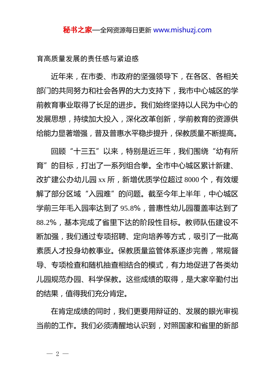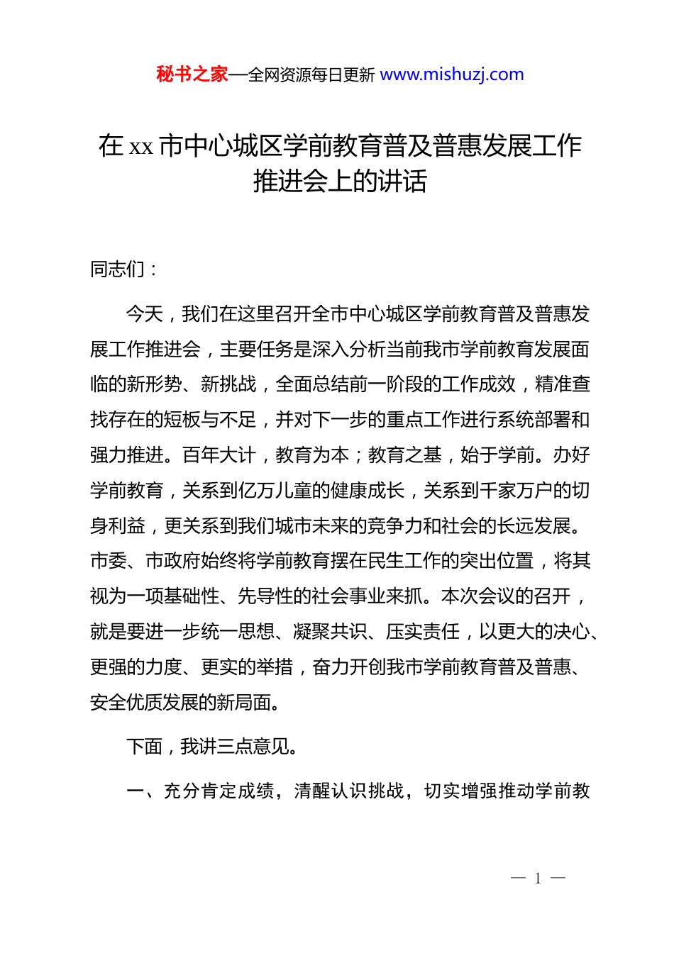 秘书之家—全网资源每日更新 www.mishuzj.com在 xx 市中心城区学前教育普及普惠发展工作推进会上的讲话同志们:今天,我们在这里召开全市中心城区学前教育普及普惠发展工作推进会,主要任务是深入分析当前我市学前教育发展面临的新形势、新挑战,全面总结前一阶段的工作成效,精准查找存在的短板与不足,并对下一步的重点工作进行系统部署和强力推进。百年大计,教育为本;教育之基,始于学前。办好学前教育,关系到亿万儿童的健康成长,关系到千家万户的切身利益,更关系到我们城市未来的竞争力和社会的长远发展。市委、市政府始终将学前教育摆在民生工作的突出位置,将其视为一项基础性、先导性的社会事业来抓。本次会议的召开,就是要进一步统一思想、凝聚共识、压实责任,以更大的决心、更强的力度、更实的举措,奋力开创我市学前教育普及普惠、安全优质发展的新局面。下面,我讲三点意见。一、充分肯定成绩,清醒认识挑战,切实增强推动学前教— 1 —秘书之家—全网资源每日更新 www.mishuzj.com育高质量发展的责任感与紧迫感近年来,在市委、市政府的坚强领导下,在各区、各相关部门的共同努力和社会各界的大力支持下,我市中心城区的学前教育事业取得了长足的进步。我们始终坚持以人民为中心的发展思想,持续加大投入,深化改革创新,学前教育的资源供给能力显著增强,普及普惠水平稳步提升,保教质量不断提高。回顾“十三五”以来,特别是近三年,我们围绕“幼有所育”的目标,打出了一系列组合拳。全市中心城区累计新建、改扩建公办幼儿园 xx 所,新增优质学位超过 8000 个,有效缓解了部分区域“入园难”的问题。截至今年上半年,中心城区学前三年毛入园率达到了 95.8%,普惠性幼儿园覆盖率达到了88.2%,基本完成了省里下达的阶段性目标。教师队伍建设不断加强,我们通过专项招聘、定向培养等方式,吸引了一批高素质人才投身幼教事业。保教质量监管体系逐步完善,常规督导、专项检查和随机抽查相结合的模式,有力地促进了各类幼儿园规范办园、科学保教。这些成绩的取得,是大家辛勤付出的结果,值得我们充分肯定。在肯定成绩的同时,我们更要用辩证的、发展的眼光审视当前的工作。我们必须清醒地认识到,对照国家和省里的新部— 2 —秘书之家—全网资源每日更新 www.mishuzj.com署、新要求,对照人民群众对“幼有优育”的新期盼,我市中心城区的学前教育发展仍然面临着不少亟待解决的突出问题和深层次矛盾。第一,普惠性资源的结构性矛盾依然突出。虽然我们的普惠性幼儿园覆盖率达到了 88.2%,但距离国家提出的到 2025 年全国学前教育普惠性幼儿园覆盖率超过 90%的目标仍有差距。更重要的是,资源布局不均衡的问题日益凸显。老城区由于空间限制,新增公办园难度大;而 xx 新区、xx 新城等新建城区,随着大量人口迁入,学前教育学位缺口正在快速放大,配套幼儿园建设滞后于住宅项目开发和居民入住速度的问题屡见不鲜。部分小区配套幼儿园移交不及时、不规范,甚至被挪作他用,导致公共教育资源流失,群众反映强烈。第二,保教队伍的整体素质有待进一步提升。教师是立教之本、兴教之源。目前,我们的幼师队伍在数量上基本能够满足需求,但在质量上还存在短板。一方面,公办园教师编制紧张,导致大量优秀的非在编教师与在编教师同工不同酬,影响了队伍的稳定性和积极性。另一方面,部分民办幼儿园出于成本控制的考虑,教师薪酬待遇偏低,专业发展支持不足,导致高水平教师引不进、留不住。教师的专业能力、教研水平参差— 3 —秘书之家—全网资源每日更新 www.mishuzj.com不齐,一些幼儿园的课程设置仍然存在“小学化”倾向,违背了幼儿身心发展规律,这些都直接影响了保教质量的提升。第三,保障和监管的体制机制还不够健全。学前教育的健康发展,离不开强有力的制度保障。目前,我们的投入保障机制仍需完善,财政性学前教育经费占同级财政性教育经费的比例有待提高,成本分担机制尚未完全理顺,对普惠性民办园的扶持力度和精准度需要加强。在监管方面,跨部门协同的合力尚未完全形成。教育、卫健、市场监管、住建等部门在信息共享、联合执法等方...
