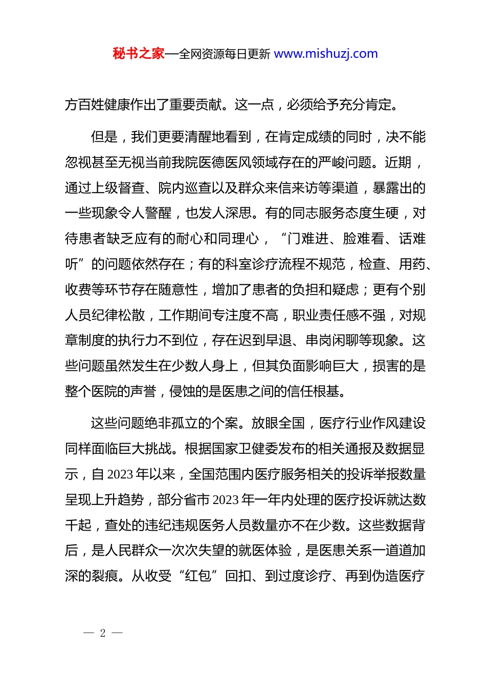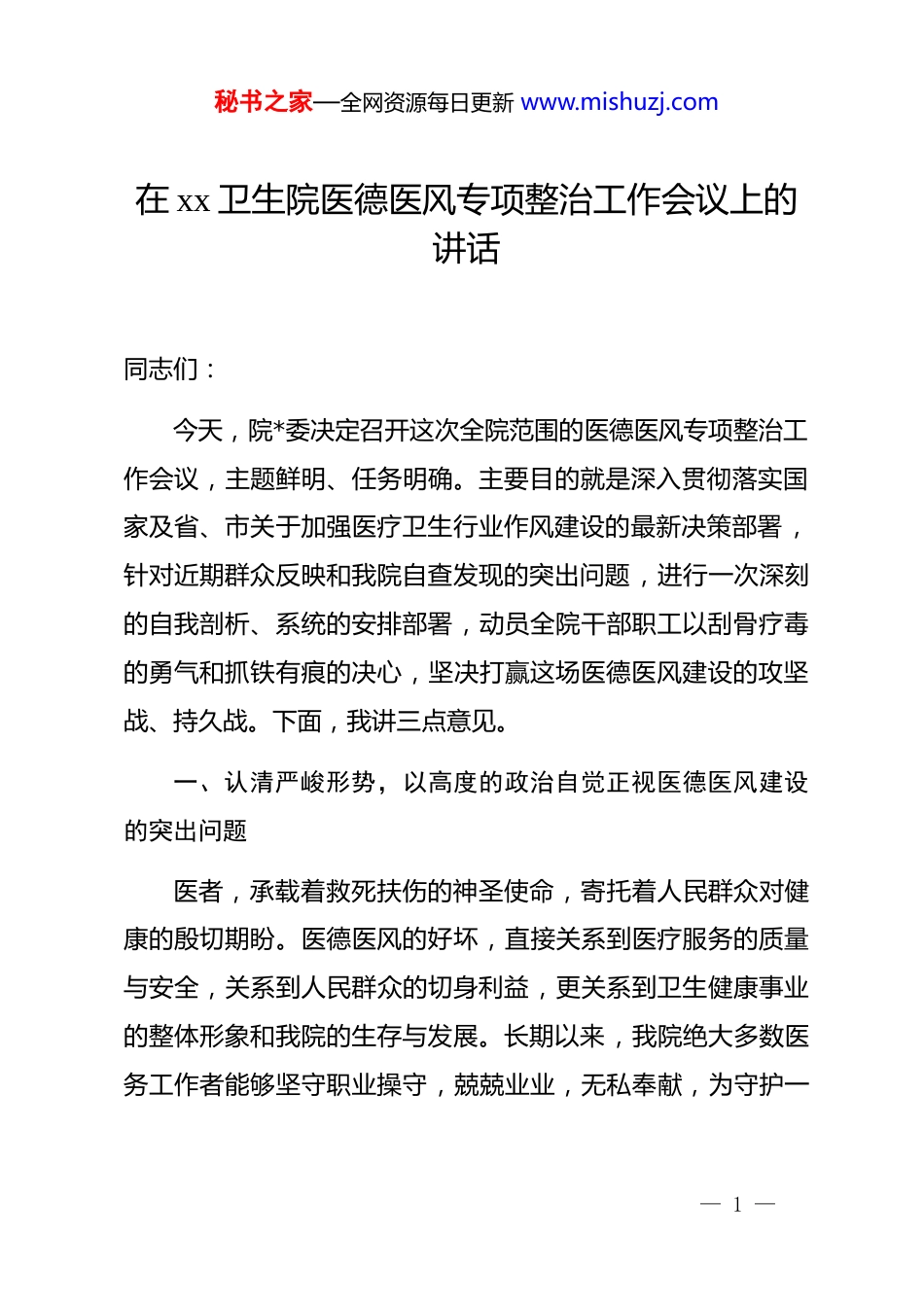 秘书之家—全网资源每日更新 www.mishuzj.com在 xx 卫生院医德医风专项整治工作会议上的讲话同志们:今天,院*委决定召开这次全院范围的医德医风专项整治工作会议,主题鲜明、任务明确。主要目的就是深入贯彻落实国家及省、市关于加强医疗卫生行业作风建设的最新决策部署,针对近期群众反映和我院自查发现的突出问题,进行一次深刻的自我剖析、系统的安排部署,动员全院干部职工以刮骨疗毒的勇气和抓铁有痕的决心,坚决打赢这场医德医风建设的攻坚战、持久战。下面,我讲三点意见。一、认清严峻形势,以高度的政治自觉正视医德医风建设的突出问题医者,承载着救死扶伤的神圣使命,寄托着人民群众对健康的殷切期盼。医德医风的好坏,直接关系到医疗服务的质量与安全,关系到人民群众的切身利益,更关系到卫生健康事业的整体形象和我院的生存与发展。长期以来,我院绝大多数医务工作者能够坚守职业操守,兢兢业业,无私奉献,为守护一— 1 —秘书之家—全网资源每日更新 www.mishuzj.com方百姓健康作出了重要贡献。这一点,必须给予充分肯定。但是,我们更要清醒地看到,在肯定成绩的同时,决不能忽视甚至无视当前我院医德医风领域存在的严峻问题。近期,通过上级督查、院内巡查以及群众来信来访等渠道,暴露出的一些现象令人警醒,也发人深思。有的同志服务态度生硬,对待患者缺乏应有的耐心和同理心,“门难进、脸难看、话难听”的问题依然存在;有的科室诊疗流程不规范,检查、用药、收费等环节存在随意性,增加了患者的负担和疑虑;更有个别人员纪律松散,工作期间专注度不高,职业责任感不强,对规章制度的执行力不到位,存在迟到早退、串岗闲聊等现象。这些问题虽然发生在少数人身上,但其负面影响巨大,损害的是整个医院的声誉,侵蚀的是医患之间的信任根基。这些问题绝非孤立的个案。放眼全国,医疗行业作风建设同样面临巨大挑战。根据国家卫健委发布的相关通报及数据显示,自 2023 年以来,全国范围内医疗服务相关的投诉举报数量呈现上升趋势,部分省市 2023 年一年内处理的医疗投诉就达数千起,查处的违纪违规医务人员数量亦不在少数。这些数据背后,是人民群众一次次失望的就医体验,是医患关系一道道加深的裂痕。从收受“红包”回扣、到过度诊疗、再到伪造医疗— 2 —秘书之家—全网资源每日更新 www.mishuzj.com文书等典型案例的曝光无一不在警示我们,医德医风滑坡的风险现实存在,作风建设稍有松懈就可能反弹回潮。剖析我院问题的深层次根源,主要在于三个“弱化”:一是理想信念的“总开关”拧得不紧,部分人员对“以患者为中心”的服务理念理解不深、践行不力,忘记了从医的初心与誓言;二是制度执行的“高压线”通电不足,相关考核评价机制未能完全发挥“指挥棒”作用,对违规行为的惩戒力度和威慑力不够;三是监督管理的“防火墙”筑得不牢,日常监督失之于宽、失之于软,未能做到抓早抓小、防微杜渐。全院上下必须对这些问题有足够清醒的认识,决不能讳疾忌医,更不能麻木不仁。必须深刻反思,这些问题若不加以根治,小则影响个人前途,中则败坏医院风气,大则动摇卫生健康事业的根基。二、提高政治站位,以坚定的思想自觉领悟医德医风建设的极端重要性加强医德医风建设,不是一项权宜之计,而是一项必须常抓不懈的战略性、基础性工作。其重要性,可以从以下三个层面来深刻理解。第一,加强医德医风建设是践行初心使命、厚植执政根基— 3 —秘书之家—全网资源每日更新 www.mishuzj.com的政治要求。医疗卫生事业是重要的民生事业,承载着*和政府对人民群众的庄严承诺。作为公立医疗机构,我们的第一属性是政治属性,讲政治是首要原则。医德医风问题,本质上是工作作风问题,更是政治立场问题。能否为群众提供优质、高效、温暖的医疗服务,直接体现了我们的宗旨意识和为民情怀。如果医德失范、行为失矩,伤害的不仅仅是患者的身心,更是*和政府在人民群众心中的形象。因此,必须把加强医德医风建设提升到巩固*的执政基础、赢得民心所向的政治高度来认识和把握,以实际行动诠释“人民至上、生命至上”的价值理念。要将 dj 工作的引领作用贯穿始...