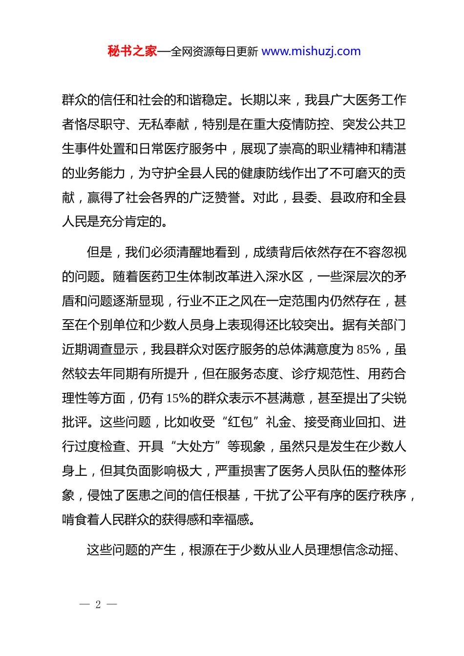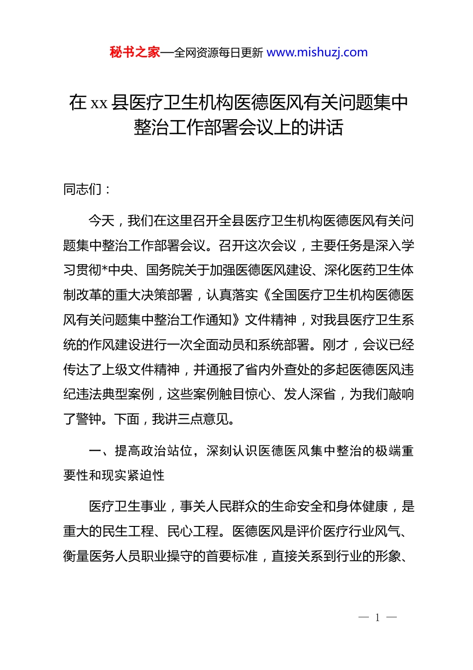 秘书之家—全网资源每日更新 www.mishuzj.com在 xx 县医疗卫生机构医德医风有关问题集中整治工作部署会议上的讲话同志们:今天,我们在这里召开全县医疗卫生机构医德医风有关问题集中整治工作部署会议。召开这次会议,主要任务是深入学习贯彻*中央、国务院关于加强医德医风建设、深化医药卫生体制改革的重大决策部署,认真落实《全国医疗卫生机构医德医风有关问题集中整治工作通知》文件精神,对我县医疗卫生系统的作风建设进行一次全面动员和系统部署。刚才,会议已经传达了上级文件精神,并通报了省内外查处的多起医德医风违纪违法典型案例,这些案例触目惊心、发人深省,为我们敲响了警钟。下面,我讲三点意见。一、提高政治站位,深刻认识医德医风集中整治的极端重要性和现实紧迫性医疗卫生事业,事关人民群众的生命安全和身体健康,是重大的民生工程、民心工程。医德医风是评价医疗行业风气、衡量医务人员职业操守的首要标准,直接关系到行业的形象、— 1 —秘书之家—全网资源每日更新 www.mishuzj.com群众的信任和社会的和谐稳定。长期以来,我县广大医务工作者恪尽职守、无私奉献,特别是在重大疫情防控、突发公共卫生事件处置和日常医疗服务中,展现了崇高的职业精神和精湛的业务能力,为守护全县人民的健康防线作出了不可磨灭的贡献,赢得了社会各界的广泛赞誉。对此,县委、县政府和全县人民是充分肯定的。但是,我们必须清醒地看到,成绩背后依然存在不容忽视的问题。随着医药卫生体制改革进入深水区,一些深层次的矛盾和问题逐渐显现,行业不正之风在一定范围内仍然存在,甚至在个别单位和少数人员身上表现得还比较突出。据有关部门近期调查显示,我县群众对医疗服务的总体满意度为 85%,虽然较去年同期有所提升,但在服务态度、诊疗规范性、用药合理性等方面,仍有 15%的群众表示不甚满意,甚至提出了尖锐批评。这些问题,比如收受“红包”礼金、接受商业回扣、进行过度检查、开具“大处方”等现象,虽然只是发生在少数人身上,但其负面影响极大,严重损害了医务人员队伍的整体形象,侵蚀了医患之间的信任根基,干扰了公平有序的医疗秩序,啃食着人民群众的获得感和幸福感。这些问题的产生,根源在于少数从业人员理想信念动摇、— 2 —秘书之家—全网资源每日更新 www.mishuzj.com宗旨意识淡薄、纪律观念缺失,在于部分医疗机构管*治*主体责任虚化、制度执行不力、日常监管缺位。对此,我们必须有刮骨疗毒的勇气和壮士断腕的决心。开展此次集中整治,绝非一时兴起,更不是一阵风。这是贯彻落实全面从严治*向纵深发展、向基层延伸的必然要求,是深化医药卫生体制改革、解决群众“看病难、看病贵”问题的关键举撮,是回应社会关切、切实维护人民群众健康权益的庄严承诺。全县各医疗卫生机构和全体医务工作者,务必从政治和全局的高度,深刻认识此次集中整治工作的重要意义,切实把思想和行动统一到中央、省、市和县委的决策部署上来,以最坚决的态度、最迅速的行动、最有力的措施,打好这场正风肃纪的攻坚战。二、坚持问题导向,聚焦重点领域和关键环节精准发力、务求实效本次集中整治工作,任务明确,重点突出,就是要聚焦群众反映最强烈、行业感受最深切的突出问题,动真格、出重拳,确保整治工作靶向精准、落地见效。各单位要对照上级文件要求,结合自身实际,全面开展自查自纠,确保不留死角、不留盲区。要重点围绕以下几个方面,进行深入排查和整治:第一,要严厉整治“红包”、回扣等行贿受贿行为。这是— 3 —秘书之家—全网资源每日更新 www.mishuzj.com医德医风建设中最为敏感、群众最为痛恨的问题。要紧盯药品、耗材、设备采购等关键环节,以及临床、药剂、采购等重点岗位,坚决斩断医疗领域存在的“黑色利益链”。对于利用执业之便,索取或收受患者及其亲友的“红包”、礼金,以及接受医药企业、经销商给予的各类名义的回扣、提成的行为,必须发现一起、查处一起,绝不姑息。第二,要坚决纠正过度诊疗、不合理用药等违规行为。要严格落实各项诊疗规范和临床路径管理要求,规范医务人员的诊疗行为。针对分解住院、重复检查、超范围检查、无指...