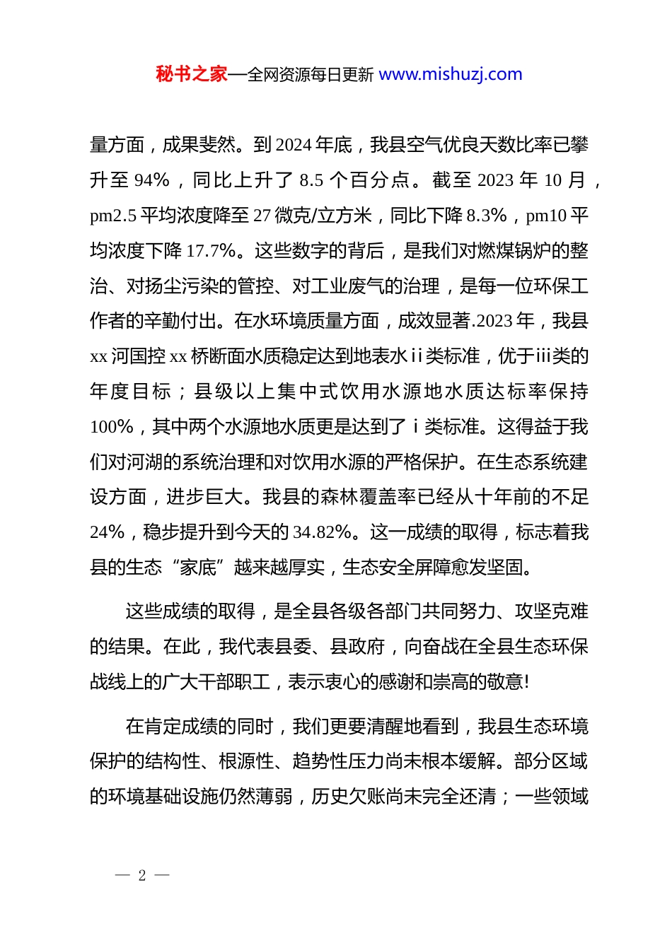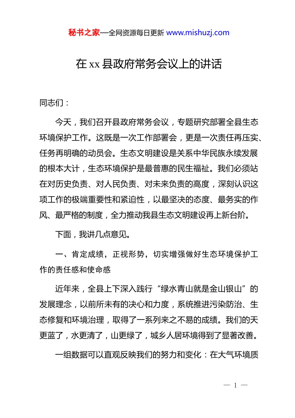 秘书之家—全网资源每日更新 www.mishuzj.com在 xx 县政府常务会议上的讲话同志们:今天,我们召开县政府常务会议,专题研究部署全县生态环境保护工作。这既是一次工作部署会,更是一次责任再压实、任务再明确的动员会。生态文明建设是关系中华民族永续发展的根本大计,生态环境保护是最普惠的民生福祉。我们必须站在对历史负责、对人民负责、对未来负责的高度,深刻认识这项工作的极端重要性和紧迫性,以最坚决的态度、最务实的作风、最严格的制度,全力推动我县生态文明建设再上新台阶。下面,我讲几点意见。一、肯定成绩,正视形势,切实增强做好生态环境保护工作的责任感和使命感近年来,全县上下深入践行“绿水青山就是金山银山”的发展理念,以前所未有的决心和力度,系统推进污染防治、生态修复和环境治理,取得了一系列来之不易的成绩。我们的天更蓝了,水更清了,山更绿了,城乡人居环境得到了显著改善。一组数据可以直观反映我们的努力和变化:在大气环境质— 1 —秘书之家—全网资源每日更新 www.mishuzj.com量方面,成果斐然。到 2024 年底,我县空气优良天数比率已攀升至 94%,同比上升了 8.5 个百分点。截至 2023 年 10 月,pm2.5 平均浓度降至 27 微克/立方米,同比下降 8.3%,pm10 平均浓度下降 17.7%。这些数字的背后,是我们对燃煤锅炉的整治、对扬尘污染的管控、对工业废气的治理,是每一位环保工作者的辛勤付出。在水环境质量方面,成效显著.2023 年,我县xx 河国控 xx 桥断面水质稳定达到地表水ⅱ类标准,优于ⅲ类的年 度 目 标 ; 县 级 以 上 集 中 式 饮 用 水 源 地 水 质 达 标 率 保 持100%,其中两个水源地水质更是达到了ⅰ类标准。这得益于我们对河湖的系统治理和对饮用水源的严格保护。在生态系统建设方面,进步巨大。我县的森林覆盖率已经从十年前的不足24%,稳步提升到今天的 34.82%。这一成绩的取得,标志着我县的生态“家底”越来越厚实,生态安全屏障愈发坚固。这些成绩的取得,是全县各级各部门共同努力、攻坚克难的结果。在此,我代表县委、县政府,向奋战在全县生态环保战线上的广大干部职工,表示衷心的感谢和崇高的敬意!在肯定成绩的同时,我们更要清醒地看到,我县生态环境保护的结构性、根源性、趋势性压力尚未根本缓解。部分区域的环境基础设施仍然薄弱,历史欠账尚未完全还清;一些领域— 2 —秘书之家—全网资源每日更新 www.mishuzj.com的污染治理深度和广度还有待加强;随着经济社会的发展和人民群众对优美生态环境需求的日益增长,我们肩上的担子更重、责任更大。我们绝不能有丝毫的松懈和自满,必须以“归零”的心态,重新审视问题,以“冲刺”的姿态,迎接新的挑战。二、深化认识,强化担当,全面压实生态环境保护的政治责任前不久,中央印发了《地方*政领导干部生态环境保护责任制规定》,这为我们地方*政领导干部履职尽责立起了“标尺”,划出了“红线”,打通了责任落实的“最后一公里”。全县各级领导干部要深刻学习领会,把思想和行动统一到中央和省、州决策部署上来。第一,要深刻理解“*政同责、一岗双责”的核心要义。生态环境保护不是环保部门一家的事,而是各级*委、政府的共同责任。各乡镇、各部门的“一把手”是本辖区、本领域生态环境保护的第一责任人,分管领导要严格履行“一岗双责”。要坚持管发展必须管环保、管生产必须管环保、管行业必须管环保,将生态环境保护的要求融入到经济社会发展的各方面和全过程,做到守土有责、守土负责、守土尽责。— 3 —秘书之家—全网资源每日更新 www.mishuzj.com第二,要建立健全“明责、履责、考责、追责”的闭环体系。制度的生命力在于执行。我们将结合我县实际,尽快制定出台贯彻落实《责任制规定》的具体实施细则。一要制定责任清单。要逐级、逐部门、逐岗位明确生态环境保护的具体职责,确保事事有人管、人人有专责,消除责任盲区。二要强化考核评价。要将生态环境保护工作纳入领导班子和领导干部目标责任考核体系,加大考核权重,将资源消耗、环境损害、生态效益等指标作为评价的重要内容。考核结果要与干部...