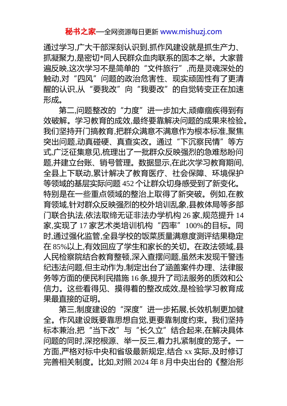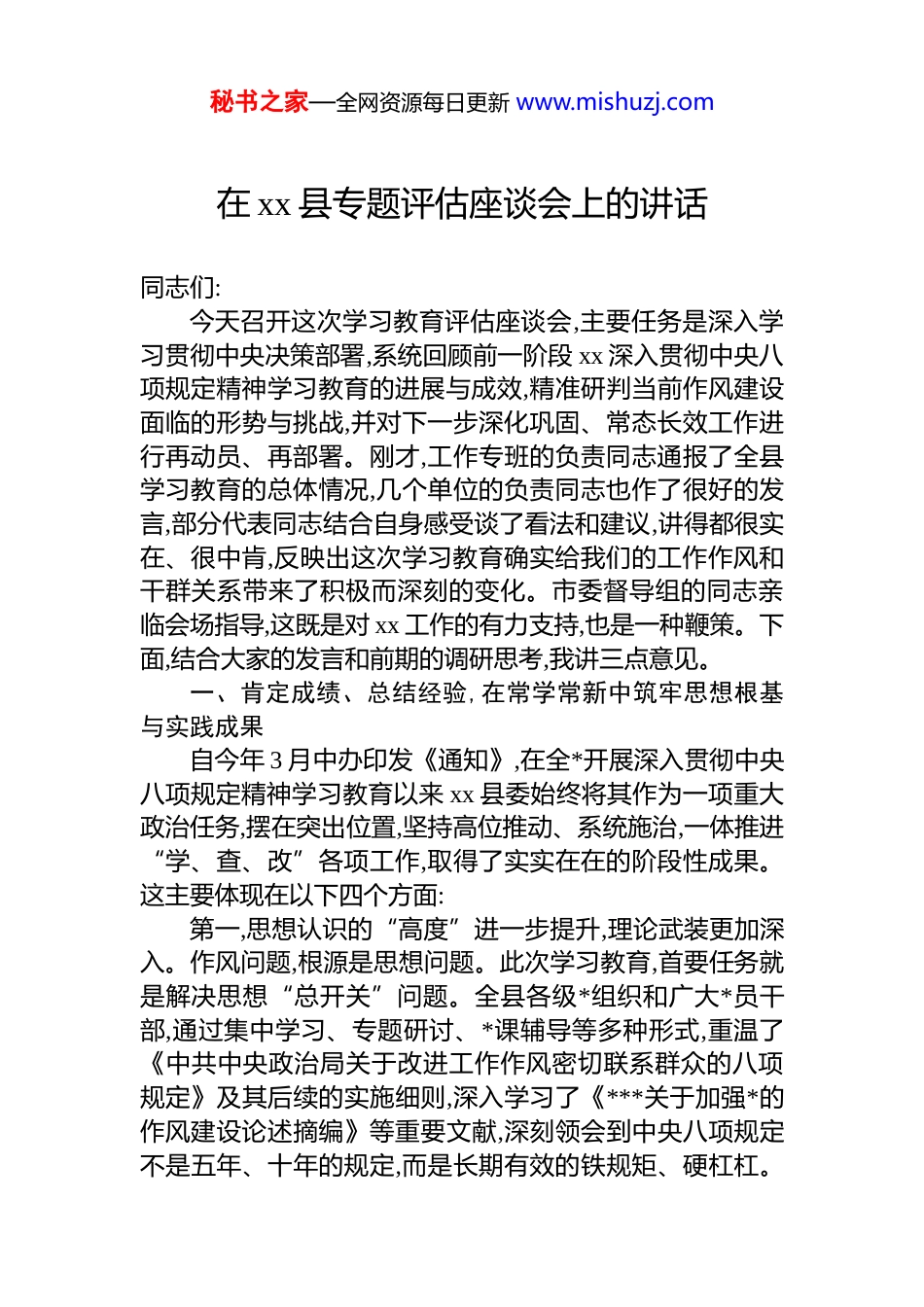 秘书之家—全网资源每日更新 www.mishuzj.com在 xx 县专题评估座谈会上的讲话同志们:今天召开这次学习教育评估座谈会,主要任务是深入学习贯彻中央决策部署,系统回顾前一阶段 xx 深入贯彻中央八项规定精神学习教育的进展与成效,精准研判当前作风建设面临的形势与挑战,并对下一步深化巩固、常态长效工作进行再动员、再部署。刚才,工作专班的负责同志通报了全县学习教育的总体情况,几个单位的负责同志也作了很好的发言,部分代表同志结合自身感受谈了看法和建议,讲得都很实在、很中肯,反映出这次学习教育确实给我们的工作作风和干群关系带来了积极而深刻的变化。市委督导组的同志亲临会场指导,这既是对 xx 工作的有力支持,也是一种鞭策。下面,结合大家的发言和前期的调研思考,我讲三点意见。一、肯定成绩、总结经验,在常学常新中筑牢思想根基与实践成果自今年 3 月中办印发《通知》,在全*开展深入贯彻中央八项规定精神学习教育以来 xx 县委始终将其作为一项重大政治任务,摆在突出位置,坚持高位推动、系统施治,一体推进“学、查、改”各项工作,取得了实实在在的阶段性成果。这主要体现在以下四个方面:第一,思想认识的“高度”进一步提升,理论武装更加深入。作风问题,根源是思想问题。此次学习教育,首要任务就是解决思想“总开关”问题。全县各级*组织和广大*员干部,通过集中学习、专题研讨、*课辅导等多种形式,重温了《中共中央政治局关于改进工作作风密切联系群众的八项规定》及其后续的实施细则,深入学习了《***关于加强*的作风建设论述摘编》等重要文献,深刻领会到中央八项规定不是五年、十年的规定,而是长期有效的铁规矩、硬杠杠。秘书之家—全网资源每日更新 www.mishuzj.com通过学习,广大干部深刻认识到,抓作风建设就是抓生产力、抓凝聚力,是密切*同人民群众血肉联系的固本之举。大家普遍反映,这次学习不是简单的“文件旅行”,而是灵魂深处的触动,对“四风”问题的政治危害性、现实顽固性有了更清醒的认识,从“要我改”向“我要改”的自觉转变正在加速形成。第二,问题整改的“力度”进一步加大,顽瘴痼疾得到有效破解。学习教育的成效,最终要靠解决问题的成果来检验。我们坚持开门搞教育,把群众满意不满意作为根本标准,聚焦突出问题,动真碰硬、真查实改。通过“下沉察民情”等方式,广泛征集意见,梳理出了一批群众反映强烈的急难愁盼问题,并建立台账、销号管理。数据显示,在此次学习教育期间,全县上下联动,累计解决了教育医疗、社会保障、环境保护等领域的基层实际问题 452 个让群众切身感受到了新变化。特别是在一些重点领域的整治上取得了新突破。例如,在教育领域,针对群众反映强烈的校外培训乱象,县教体局等多部门联合执法,依法取缔无证非法办学机构 26 家,规范提升 14家,实现了 17 家艺术类培训机构“四率”100%的目标。同时,通过强化监管,全县学校的饭菜质量满意度测评结果稳定在 85%以上,有效回应了学生和家长的关切。在政法领域,县人民检察院结合教育整顿,深入查摆问题,虽然未发现干警违纪违法问题,但主动作为,制定出台了涵盖案件办理、法律服务等方面的便民利民措施 16 条,提升了司法服务的质效和公信力。这些看得见、摸得着的整改成效,是检验学习教育成果最直接的证明。第三,制度建设的“深度”进一步拓展,长效机制更加健全。作风建设既要靠思想自觉,更要靠制度约束。我们坚持标本兼治,把“当下改”与“长久立”结合起来,在解决具体问题的同时,深挖根源、举一反三,着力扎紧制度的笼子。一方面,严格对标中央和省级最新规定,结合 xx 实际,及时修订完善相关制度。比如,对照 2024 年 8 月中央出台的《整治形秘书之家—全网资源每日更新 www.mishuzj.com式主义为基层减负若干规定》,以及关于防治“指尖上的形式主义”的若干意见,我们对内部的文山会海、督查检查考核等事项进行了全面审视和优化,切实为基层松绑减负。另一方面,针对整治中发现的制度漏洞,及时建章立制。县人民检察院在教育整顿中,就围绕案件管理、队伍建设等方面建立了 7 个长效工作机制;县纪委监委在查处农村“三资”管理突出问题后,推动相关部门完善了集体资产监管制度,从源头上...