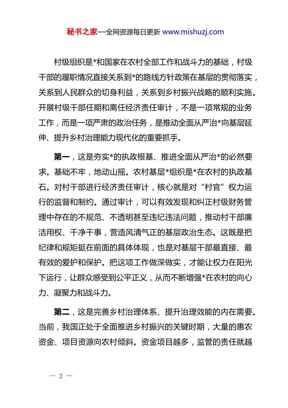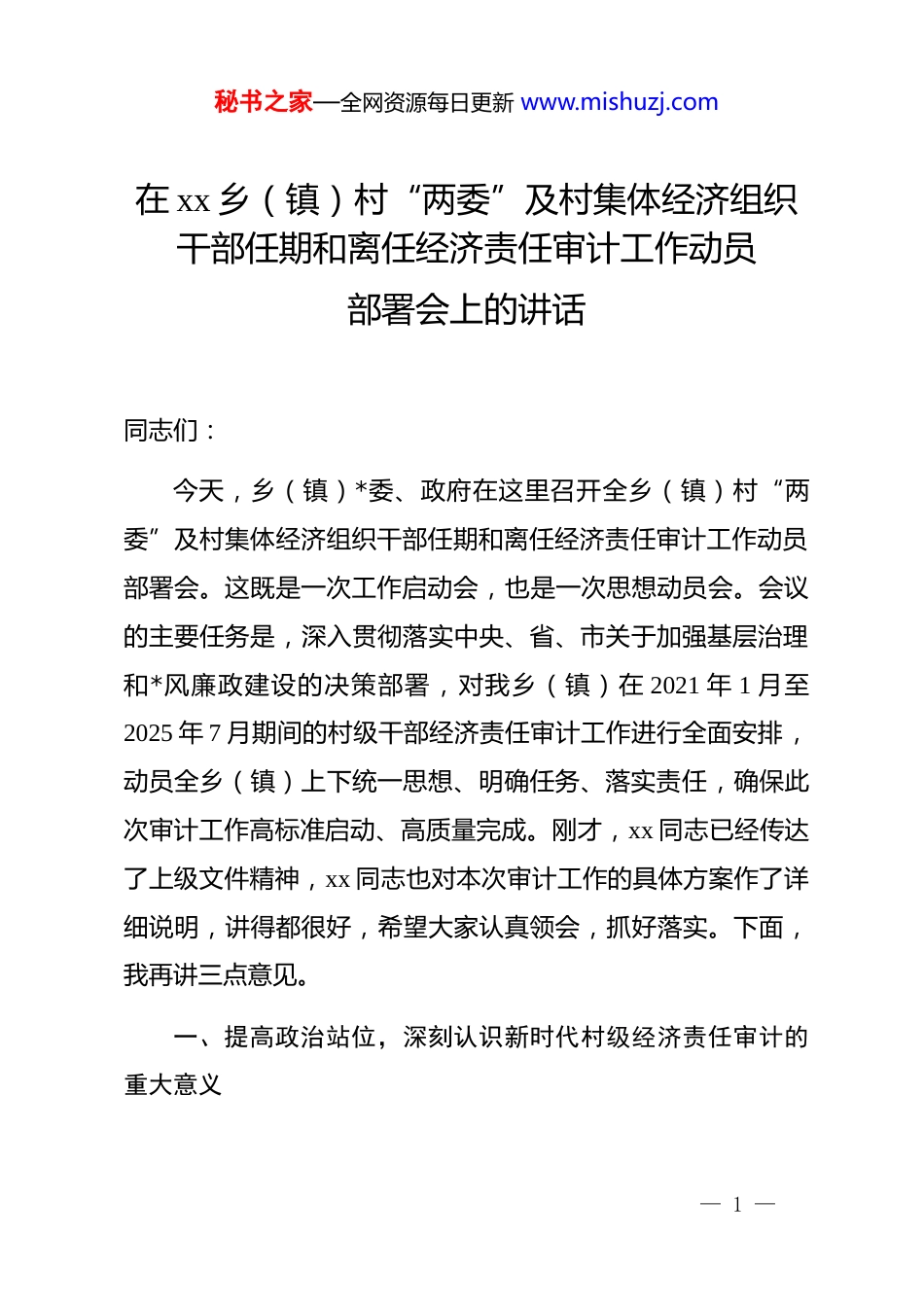 秘书之家—全网资源每日更新 www.mishuzj.com在 xx 乡(镇)村“两委”及村集体经济组织干部任期和离任经济责任审计工作动员部署会上的讲话同志们:今天,乡(镇)*委、政府在这里召开全乡(镇)村“两委”及村集体经济组织干部任期和离任经济责任审计工作动员部署会。这既是一次工作启动会,也是一次思想动员会。会议的主要任务是,深入贯彻落实中央、省、市关于加强基层治理和*风廉政建设的决策部署,对我乡(镇)在 2021 年 1 月至2025 年 7 月期间的村级干部经济责任审计工作进行全面安排,动员全乡(镇)上下统一思想、明确任务、落实责任,确保此次审计工作高标准启动、高质量完成。刚才,xx 同志已经传达了上级文件精神,xx 同志也对本次审计工作的具体方案作了详细说明,讲得都很好,希望大家认真领会,抓好落实。下面,我再讲三点意见。一、提高政治站位,深刻认识新时代村级经济责任审计的重大意义— 1 —秘书之家—全网资源每日更新 www.mishuzj.com村级组织是*和国家在农村全部工作和战斗力的基础,村级干部的履职情况直接关系到*的路线方针政策在基层的贯彻落实,关系到人民群众的切身利益,关系到乡村振兴战略的顺利实施。开展村级干部任期和离任经济责任审计,不是一项常规的业务工作,而是一项严肃的政治任务,是推动全面从严治*向基层延伸、提升乡村治理能力现代化的重要抓手。第一,这是夯实*的执政根基、推进全面从严治*的必然要求。基础不牢,地动山摇。农村基层*组织是*在农村的执政基石。对村干部进行经济责任审计,核心就是对“村官”权力运行的监督和制约。通过审计,可以有效发现和纠正村级财务管理中存在的不规范、不透明甚至违纪违法问题,推动村干部廉洁用权、干净干事,营造风清气正的基层政治生态。这既是把纪律和规矩挺在前面的具体体现,也是对基层干部最直接、最有效的爱护和保护。把这项工作做深做实,才能让权力在阳光下运行,让群众感受到公平正义,从而不断增强*在农村的向心力、凝聚力和战斗力。第二,这是完善乡村治理体系、提升治理效能的内在需要。当前,我国正处于全面推进乡村振兴的关键时期,大量的惠农资金、项目资源向农村倾斜。资金项目越多,监管的责任就越— 2 —秘书之家—全网资源每日更新 www.mishuzj.com大,廉政的风险也越高。经济责任审计就像一把“探照灯”和“显微镜”,能够全面审视村级集体“三资”的管理使用状况,揭示管理漏洞和潜在风险。通过以审促改、以审促建,可以推动建立健全权责清晰、程序规范、监管有力的村级财务管理制度和内部控制体系,从源头上预防和减少腐败问题的发生。这不仅是对集体家底的一次全面盘点,更是推动乡村治理从“经验式”向“制度化”、从“模糊化”向“精细化”转变的关键一环。第三,这是维护群众根本利益、促进农村和谐稳定的重要保障。村级集体经济的“家底”殷实不殷实,每一笔钱花得明不明白,是广大村民最关心、最直接、最现实的利益问题。一些地方之所以出现干群关系紧张、信访矛盾多发,根源往往就在于村务、财务不公开、不透明。开展经济责任审计,并将审计结果依法依规向全体村民公开,就是要给群众一个“明白账”,还干部一个“清白身”。这不仅保障了村民的知情权、参与权和监督权,更是化解基层矛盾、密切*群干群关系的有效途径。一个财务清晰、管理规范、群众信赖的村集体,必然是一个团结稳定、充满活力的战斗堡垒。第四,这是客观评价干部业绩、激励干部担当作为的有效— 3 —秘书之家—全网资源每日更新 www.mishuzj.com手段。审计工作坚持实事求是、客观公正的原则。它既能查处问题、揭示不足,也能客观反映干部在任期内所做的工作和取得的成绩。对于那些在发展集体经济、带领群众致富、改善人居环境等方面敢于担当、积极作为的干部,审计结果就是一份有力的“成绩单”;对于那些不作为、慢作为甚至乱作为的干部,审计结果也是一记响亮的“警示钟”。通过审计评价,可以为组织部门选拔任用干部提供重要依据,形成能者上、优者奖、庸者下、劣者汰的鲜明导向,激励广大村干部在新征程上展现新担当、新作为。二、聚焦关键环节,准确把握本次经济...