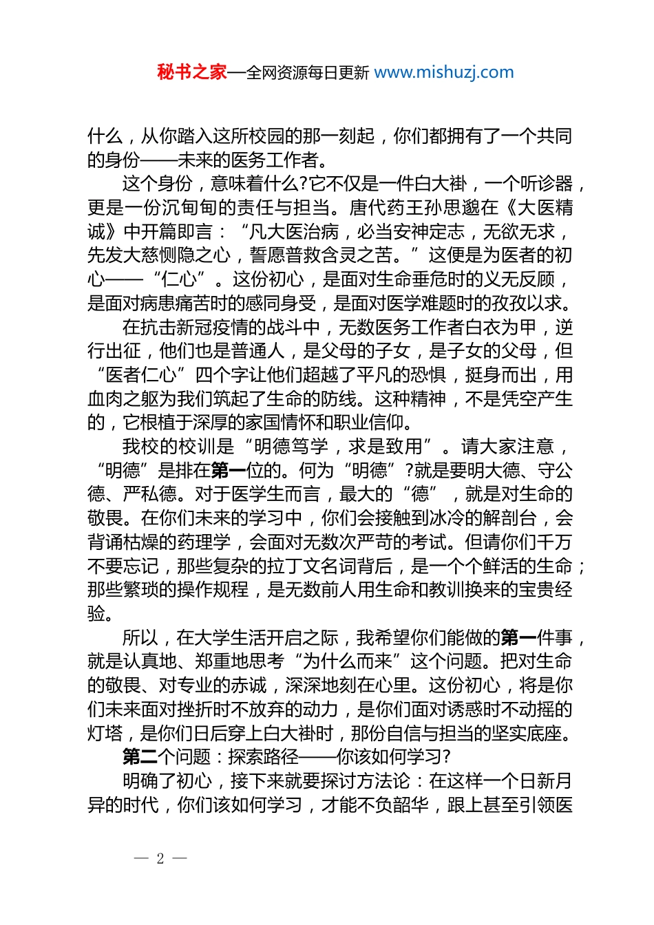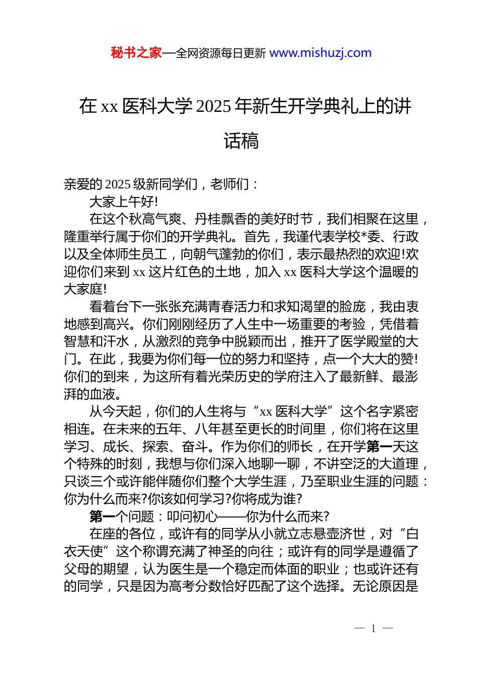 秘书之家—全网资源每日更新 www.mishuzj.com在 xx 医科大学 2025 年新生开学典礼上的讲话稿亲爱的 2025 级新同学们,老师们:大家上午好!在这个秋高气爽、丹桂飘香的美好时节,我们相聚在这里,隆重举行属于你们的开学典礼。首先,我谨代表学校*委、行政以及全体师生员工,向朝气蓬勃的你们,表示最热烈的欢迎!欢迎你们来到 xx 这片红色的土地,加入 xx 医科大学这个温暖的大家庭!看着台下一张张充满青春活力和求知渴望的脸庞,我由衷地感到高兴。你们刚刚经历了人生中一场重要的考验,凭借着智慧和汗水,从激烈的竞争中脱颖而出,推开了医学殿堂的大门。在此,我要为你们每一位的努力和坚持,点一个大大的赞!你们的到来,为这所有着光荣历史的学府注入了最新鲜、最澎湃的血液。从今天起,你们的人生将与“xx 医科大学”这个名字紧密相连。在未来的五年、八年甚至更长的时间里,你们将在这里学习、成长、探索、奋斗。作为你们的师长,在开学第一天这个特殊的时刻,我想与你们深入地聊一聊,不讲空泛的大道理,只谈三个或许能伴随你们整个大学生涯,乃至职业生涯的问题:你为什么而来?你该如何学习?你将成为谁?第一个问题:叩问初心——你为什么而来?在座的各位,或许有的同学从小就立志悬壶济世,对“白衣天使”这个称谓充满了神圣的向往;或许有的同学是遵循了父母的期望,认为医生是一个稳定而体面的职业;也或许还有的同学,只是因为高考分数恰好匹配了这个选择。无论原因是— 1 —秘书之家—全网资源每日更新 www.mishuzj.com什么,从你踏入这所校园的那一刻起,你们都拥有了一个共同的身份——未来的医务工作者。这个身份,意味着什么?它不仅是一件白大褂,一个听诊器,更是一份沉甸甸的责任与担当。唐代药王孙思邈在《大医精诚》中开篇即言:“凡大医治病,必当安神定志,无欲无求,先发大慈恻隐之心,誓愿普救含灵之苦。”这便是为医者的初心——“仁心”。这份初心,是面对生命垂危时的义无反顾,是面对病患痛苦时的感同身受,是面对医学难题时的孜孜以求。在抗击新冠疫情的战斗中,无数医务工作者白衣为甲,逆行出征,他们也是普通人,是父母的子女,是子女的父母,但“医者仁心”四个字让他们超越了平凡的恐惧,挺身而出,用血肉之躯为我们筑起了生命的防线。这种精神,不是凭空产生的,它根植于深厚的家国情怀和职业信仰。我校的校训是“明德笃学,求是致用”。请大家注意,“明德”是排在第一位的。何为“明德”?就是要明大德、守公德、严私德。对于医学生而言,最大的“德”,就是对生命的敬畏。在你们未来的学习中,你们会接触到冰冷的解剖台,会背诵枯燥的药理学,会面对无数次严苛的考试。但请你们千万不要忘记,那些复杂的拉丁文名词背后,是一个个鲜活的生命;那些繁琐的操作规程,是无数前人用生命和教训换来的宝贵经验。所以,在大学生活开启之际,我希望你们能做的第一件事,就是认真地、郑重地思考“为什么而来”这个问题。把对生命的敬畏、对专业的赤诚,深深地刻在心里。这份初心,将是你们未来面对挫折时不放弃的动力,是你们面对诱惑时不动摇的灯塔,是你们日后穿上白大褂时,那份自信与担当的坚实底座。第二个问题:探索路径——你该如何学习?明确了初心,接下来就要探讨方法论:在这样一个日新月异的时代,你们该如何学习,才能不负韶华,跟上甚至引领医— 2 —秘书之家—全网资源每日更新 www.mishuzj.com学发展的潮流?或许你们认为,学医就是背熟《系统解剖学》《诊断学》,在实验室里做好每一次实验。这当然很重要,是基本功。但如果仅仅停留于此,是远远不够的。当下的世界,正经历着前所未有的大变局,新的科技革命和产业变革正在深刻地重塑着各行各业,医疗健康领域首当其冲。我想给大家分享几个正在发生的、与你们未来息息相关的趋势和数据。第一个趋势,是人口结构变化带来的巨大需求。根据相关预测,到 2025 年,中国 60 岁以上的老年人口比例将持续增长,突破 25%。这意味着什么?这意味着与老龄化相关的医疗、康复、护理、健康管理等领域,将迎来爆发式的增长。社会对老年医学、康复医学、长期照护、安宁疗护等方面...