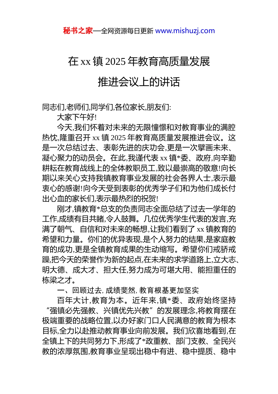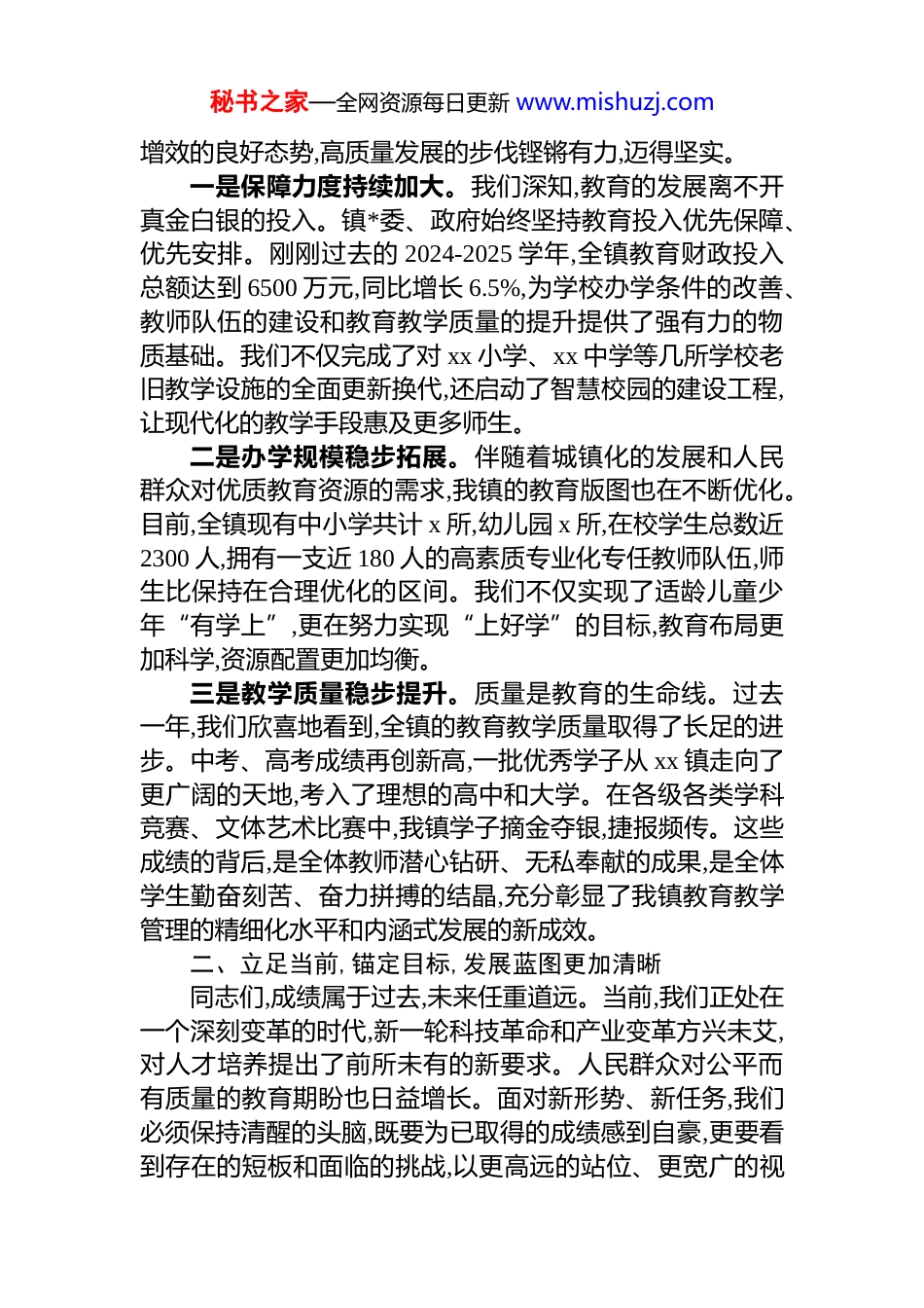 秘书之家—全网资源每日更新 www.mishuzj.com在 xx 镇 2025 年教育高质量发展推进会议上的讲话同志们,老师们,同学们,各位家长,朋友们:大家下午好!今天,我们怀着对未来的无限憧憬和对教育事业的满腔热忱,隆重召开 xx 镇 2025 年教育高质量发展推进会议。这是一次总结过去、表彰先进的庆功会,更是一次擘画未来、凝心聚力的动员会。在此,我谨代表 xx 镇*委、政府,向辛勤耕耘在教育战线上的全体教职员工,致以最崇高的敬意!向长期以来关心支持我镇教育事业发展的社会各界人士,表示最衷心的感谢!向今天受到表彰的优秀学子们和为他们成长付出心血的家长们,表示最热烈的祝贺!刚才,镇教育*总支的负责同志全面总结了过去一学年的工作,成绩有目共睹,令人鼓舞。几位优秀学生代表的发言,充满了朝气、自信和对未来的畅想,让我们看到了 xx 镇教育的希望和力量。你们的优异表现,是个人努力的结果,是家庭教育的成功,更是全镇教育成果的生动缩写。希望你们戒骄戒躁,把今天的荣誉作为新的起点,在未来的求学道路上,立大志、明大德、成大才、担大任,努力成为可堪大用、能担重任的栋梁之才。一、回顾过去,成绩斐然,教育根基更加坚实百年大计,教育为本。近年来,镇*委、政府始终坚持“强镇必先强教、兴镇优先兴教”的发展理念,将教育摆在极端重要的战略位置,以办好家门口人民满意的教育为根本目标,全力以赴推动教育事业向前发展。我们欣喜地看到,在全镇上下的共同努力下,形成了*政重教、部门支教、全民兴教的浓厚氛围,教育事业呈现出稳中有进、稳中提质、稳中秘书之家—全网资源每日更新 www.mishuzj.com增效的良好态势,高质量发展的步伐铿锵有力,迈得坚实。一是保障力度持续加大。我们深知,教育的发展离不开真金白银的投入。镇*委、政府始终坚持教育投入优先保障、优先安排。刚刚过去的 2024-2025 学年,全镇教育财政投入总额达到 6500 万元,同比增长 6.5%,为学校办学条件的改善、教师队伍的建设和教育教学质量的提升提供了强有力的物质基础。我们不仅完成了对 xx 小学、xx 中学等几所学校老旧教学设施的全面更新换代,还启动了智慧校园的建设工程,让现代化的教学手段惠及更多师生。二是办学规模稳步拓展。伴随着城镇化的发展和人民群众对优质教育资源的需求,我镇的教育版图也在不断优化。目前,全镇现有中小学共计 x 所,幼儿园 x 所,在校学生总数近2300 人,拥有一支近 180 人的高素质专业化专任教师队伍,师生比保持在合理优化的区间。我们不仅实现了适龄儿童少年“有学上”,更在努力实现“上好学”的目标,教育布局更加科学,资源配置更加均衡。三是教学质量稳步提升。质量是教育的生命线。过去一年,我们欣喜地看到,全镇的教育教学质量取得了长足的进步。中考、高考成绩再创新高,一批优秀学子从 xx 镇走向了更广阔的天地,考入了理想的高中和大学。在各级各类学科竞赛、文体艺术比赛中,我镇学子摘金夺银,捷报频传。这些成绩的背后,是全体教师潜心钻研、无私奉献的成果,是全体学生勤奋刻苦、奋力拼搏的结晶,充分彰显了我镇教育教学管理的精细化水平和内涵式发展的新成效。二、立足当前,锚定目标,发展蓝图更加清晰同志们,成绩属于过去,未来任重道远。当前,我们正处在一个深刻变革的时代,新一轮科技革命和产业变革方兴未艾,对人才培养提出了前所未有的新要求。人民群众对公平而有质量的教育期盼也日益增长。面对新形势、新任务,我们必须保持清醒的头脑,既要为已取得的成绩感到自豪,更要看到存在的短板和面临的挑战,以更高远的站位、更宽广的视秘书之家—全网资源每日更新 www.mishuzj.com野、更务实的举措,系统谋划 xx 镇教育的未来。为此,镇*委、政府在深入调研、广泛征求意见的基础上,确立了未来一个时期我镇教育高质量发展的“358”奋斗目标,并明确了当前乃至今后一个阶段的“11236”教育工作思路。这是我们推动 xx 镇教育事业迈向新高峰的路线图和施工图。“358”奋斗目标,是一个分阶段、有层次的战略构想,描绘了我镇教育现代化的宏伟蓝图。第一个数字“3”,是指我们必须牢牢把握三大核心任务。这三大任务是教育工作的“纲”,纲举才能目张。一是“立德树人”,这是教育的根...