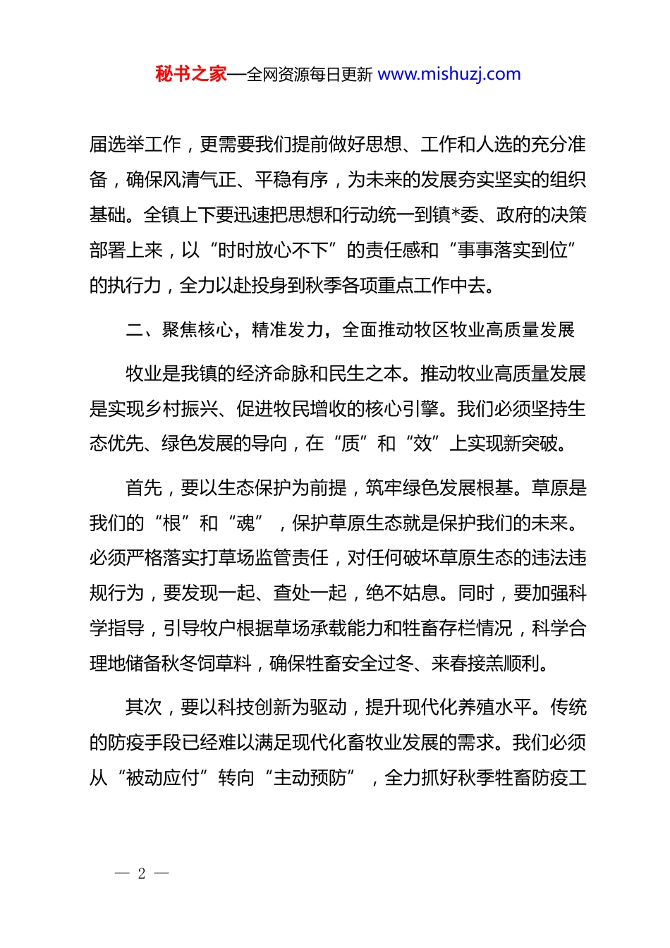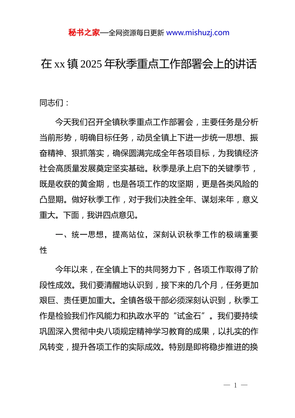 秘书之家—全网资源每日更新 www.mishuzj.com在 xx 镇 2025 年秋季重点工作部署会上的讲话同志们:今天我们召开全镇秋季重点工作部署会,主要任务是分析当前形势,明确目标任务,动员全镇上下进一步统一思想、振奋精神、狠抓落实,确保圆满完成全年各项目标,为我镇经济社会高质量发展奠定坚实基础。秋季是承上启下的关键季节,既是收获的黄金期,也是各项工作的攻坚期,更是各类风险的凸显期。做好秋季工作,对于我们决胜全年、谋划来年,意义重大。下面,我讲四点意见。一、统一思想,提高站位,深刻认识秋季工作的极端重要性今年以来,在全镇上下的共同努力下,各项工作取得了阶段性成效。我们要清醒地认识到,接下来的几个月,任务更加艰巨、责任更加重大。全镇各级干部必须深刻认识到,秋季工作是检验我们作风能力和执政水平的“试金石”。我们要持续巩固深入贯彻中央八项规定精神学习教育的成果,以扎实的作风转变,提升各项工作的实际成效。特别是即将稳步推进的换— 1 —秘书之家—全网资源每日更新 www.mishuzj.com届选举工作,更需要我们提前做好思想、工作和人选的充分准备,确保风清气正、平稳有序,为未来的发展夯实坚实的组织基础。全镇上下要迅速把思想和行动统一到镇*委、政府的决策部署上来,以“时时放心不下”的责任感和“事事落实到位”的执行力,全力以赴投身到秋季各项重点工作中去。二、聚焦核心,精准发力,全面推动牧区牧业高质量发展牧业是我镇的经济命脉和民生之本。推动牧业高质量发展是实现乡村振兴、促进牧民增收的核心引擎。我们必须坚持生态优先、绿色发展的导向,在“质”和“效”上实现新突破。首先,要以生态保护为前提,筑牢绿色发展根基。草原是我们的“根”和“魂”,保护草原生态就是保护我们的未来。必须严格落实打草场监管责任,对任何破坏草原生态的违法违规行为,要发现一起、查处一起,绝不姑息。同时,要加强科学指导,引导牧户根据草场承载能力和牲畜存栏情况,科学合理地储备秋冬饲草料,确保牲畜安全过冬、来春接羔顺利。其次,要以科技创新为驱动,提升现代化养殖水平。传统的防疫手段已经难以满足现代化畜牧业发展的需求。我们必须从“被动应付”转向“主动预防”,全力抓好秋季牲畜防疫工— 2 —秘书之家—全网资源每日更新 www.mishuzj.com作,严防重大动物疫病发生。这不仅要求我们做好常规的疫苗接种,更要大力推广和应用数字化、智能化防疫技术。例如,内蒙古一些地区已经开始应用“牧场管家”系统,通过自动化防疫流程、为牲畜建立不可篡改的区块链电子档案、利用传感器实时监控养殖环境等手段,构建起一道道数字防线。我们要积极学习借鉴这些先进经验,推动建立覆盖全镇的 rfid 养殖健康档案和疫病评估大数据分析平台,实现对疫病的精准诊断和智能预警。各嘎查社区要组织防疫员和养殖大户,积极参加相关技术培训,熟练掌握“xx 牧运通”等新系统的操作流程,让科技真正赋能我们的畜牧业生产。最后,要以市场开拓为导向,拓宽牧民增收渠道。酒香也怕巷子深,好的畜产品必须要有好的销路。我们要充分发挥集体经济合作社“联盟”的平台作用,主动对接外部市场。今年5 月,我们成功推动全镇 12 个嘎查的 278 户牧民与 xx 羊区域品牌签约,仅此一项,8.24 万只羊羔的出栏合同就预计能为牧民直接增收 130 余万元。这是一个非常好的开端,证明了我们发展订单牧业、品牌牧业的道路是完全正确的。接下来,要继续深化这种合作模式,探索肉牛、奶制品等更多领域的合作可能,让我们的优质畜产品走出 xx,走向更广阔的市场,实实在在为— 3 —秘书之家—全网资源每日更新 www.mishuzj.com牧民群众增加收入。三、守土有责,筑牢防线,全力确保社会大局安全稳定安全稳定是发展的一切前提和保障。秋季天干物燥,历来是火灾高发期;同时,局地强对流天气也可能引发洪涝风险。我们必须时刻绷紧安全这根弦,以最高标准、最严要求、最实举措,坚决守住安全稳定底线。一方面,要构建立体化安全防护网。在防汛工作上,要坚决克服麻痹思想,扎实开展隐患排查,对排查出的河道、低洼地带、危旧房屋等风险点,要建立...