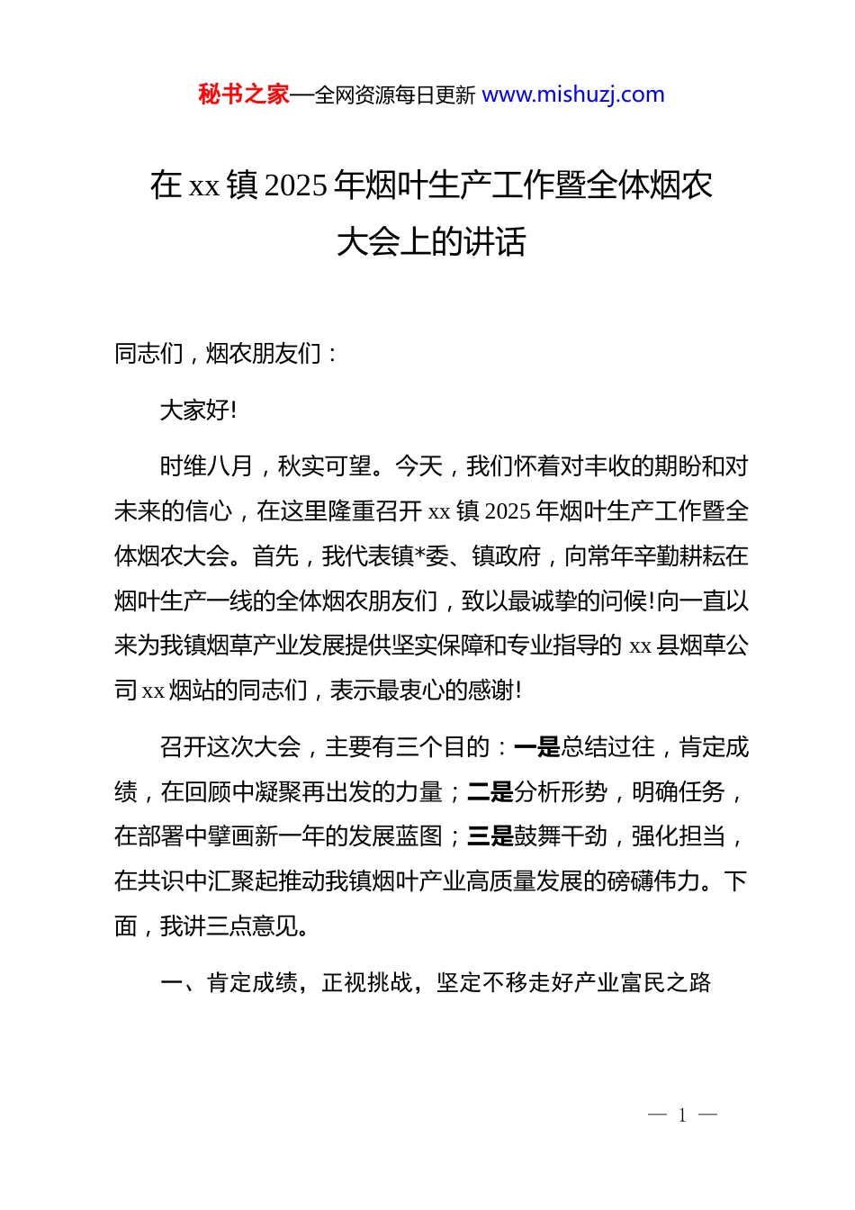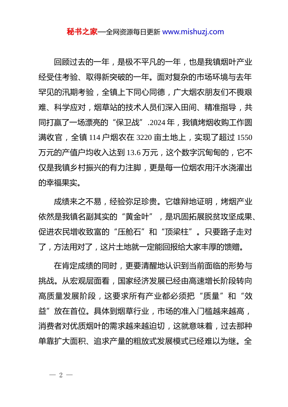 秘书之家—全网资源每日更新 www.mishuzj.com在 xx 镇 2025 年烟叶生产工作暨全体烟农大会上的讲话同志们,烟农朋友们:大家好!时维八月,秋实可望。今天,我们怀着对丰收的期盼和对未来的信心,在这里隆重召开 xx 镇 2025 年烟叶生产工作暨全体烟农大会。首先,我代表镇*委、镇政府,向常年辛勤耕耘在烟叶生产一线的全体烟农朋友们,致以最诚挚的问候!向一直以来为我镇烟草产业发展提供坚实保障和专业指导的 xx 县烟草公司 xx 烟站的同志们,表示最衷心的感谢!召开这次大会,主要有三个目的:一是总结过往,肯定成绩,在回顾中凝聚再出发的力量;二是分析形势,明确任务,在部署中擘画新一年的发展蓝图;三是鼓舞干劲,强化担当,在共识中汇聚起推动我镇烟叶产业高质量发展的磅礴伟力。下面,我讲三点意见。一、肯定成绩,正视挑战,坚定不移走好产业富民之路— 1 —秘书之家—全网资源每日更新 www.mishuzj.com回顾过去的一年,是极不平凡的一年,也是我镇烟叶产业经受住考验、取得新突破的一年。面对复杂的市场环境与去年罕见的汛期考验,全镇上下同心同德,广大烟农朋友们不畏艰难、科学应对,烟草站的技术人员们深入田间、精准指导,共同打赢了一场漂亮的“保卫战”.2024 年,我镇烤烟收购工作圆满收官,全镇 114 户烟农在 3220 亩土地上,实现了超过 1550万元的产值户均收入达到 13.6 万元,这个数字沉甸甸的,它不仅是我镇乡村振兴的有力注脚,更是每一位烟农用汗水浇灌出的幸福果实。成绩来之不易,经验弥足珍贵。它雄辩地证明,烤烟产业依然是我镇名副其实的“黄金叶”,是巩固拓展脱贫攻坚成果、促进农民增收致富的“压舱石”和“顶梁柱”。只要路子走对了,方法用对了,这片土地就一定能回报给大家丰厚的馈赠。在肯定成绩的同时,更要清醒地认识到当前面临的形势与挑战。从宏观层面看,国家经济发展已经由高速增长阶段转向高质量发展阶段,这要求所有产业都必须把“质量”和“效益”放在首位。具体到烟草行业,市场的准入门槛越来越高,消费者对优质烟叶的需求越来越迫切,这就意味着,过去那种单靠扩大面积、追求产量的粗放式发展模式已经难以为继。全— 2 —秘书之家—全网资源每日更新 www.mishuzj.com球范围内的烟草生产也面临成本上升、利润空间受到挤压的共同压力。未来的竞争,必将是品质的竞争、品牌的竞争、绿色生态的竞争。谁能产出更优质、更安全、更具特色的烟叶,谁就能在市场中掌握主动权,赢得定价权。立足我镇实际,挑战同样存在。部分烟农的生产方式还比较传统,标准化、规范化操作水平有待进一步提升;基础设施,特别是烘烤设施的现代化水平还需要持续升级;产业的组织化程度和抵御自然风险、市场风险的能力也需要不断加强。这些都是摆在我们面前,必须下大力气解决的“短板”问题。面对机遇与挑战,我们不能有丝毫的懈怠和彷徨。镇*委、镇政府的态度是明确的、坚定的,那就是必须毫不动摇地把烟叶产业作为我镇的战略性支柱产业来抓。今年,全镇的烤烟生产任务是 10300 担,合同面积扩展到 3570 亩,涉及 5 个村、10个组的 117 户烟农,预计总产值将向 1800 余万元的新台阶迈进。这既是压力,更是动力。希望大家能深刻认识到,抓好烟叶生产,不仅是完成一项经济指标,更是关系到上百个家庭的生计与福祉,关系到全镇经济社会发展的根基与未来。必须坚定信心、下定决心,全力以赴推动我镇烟叶产业在新的起点上实现更高质量的发展。— 3 —秘书之家—全网资源每日更新 www.mishuzj.com二、聚焦核心,精准施策,全力推动烟叶产业实现新跃升推动高质量发展,不能停留在口号上,必须落实到具体的行动中。围绕“提技能、稳烟农、促增收”这一核心目标,接下来全镇的烟叶生产工作,要重点在以下三个方面下功夫、求突破。第一,以技术革新为根本动力,筑牢提质增效的坚实基础。烟叶的品质,七分靠种,三分靠烤,每一个环节的技术水平,都直接决定着最终的收入。产量是基础,质量是生命。要实现从“种上烟”到“种好烟”的跨越,关键就在于技术的革新与普及。一要抓好全流程的标准化生产。标准是质量的保障。烟站和技...