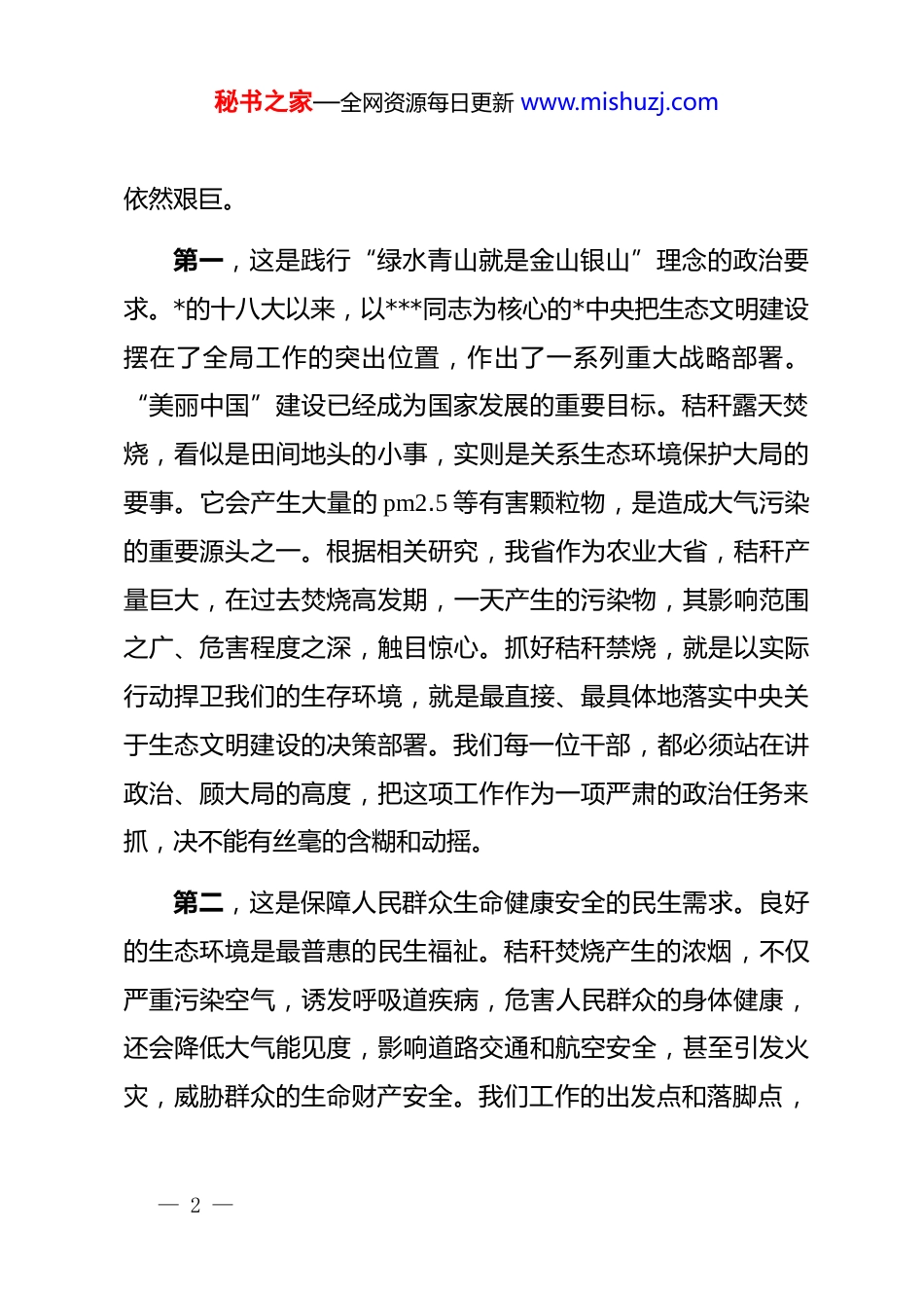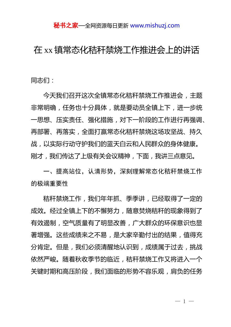 秘书之家—全网资源每日更新 www.mishuzj.com在 xx 镇常态化秸秆禁烧工作推进会上的讲话同志们:今天我们召开这次全镇常态化秸秆禁烧工作推进会,主题非常明确,任务也十分具体,就是要动员全镇上下,进一步统一思想、压实责任、强化措施,对下一阶段的工作进行再强调、再部署、再落实,全面打赢常态化秸秆禁烧这场攻坚战、持久战,以实际行动守护我们的蓝天白云和人民群众的身体健康。刚才,我们传达了上级有关会议精神,下面,我讲三点意见。一、提高站位,认清形势,深刻理解常态化秸秆禁烧工作的极端重要性秸秆禁烧工作,我们年年抓、季季讲,已经取得了一定的成效。经过全镇上下的不懈努力,随意焚烧秸秆的现象得到了有效遏制,空气质量有了明显改善,广大群众的环保意识也显著增强。这些成绩来之不易,是大家辛勤付出的结果,值得充分肯定。但是,我们必须清醒地认识到,成绩属于过去,挑战依然严峻。随着秋收季节的临近,秸秆禁烧工作又将进入一个关键时期和高压阶段,我们面临的形势不容乐观,肩负的任务— 1 —秘书之家—全网资源每日更新 www.mishuzj.com依然艰巨。第一,这是践行“绿水青山就是金山银山”理念的政治要求。*的十八大以来,以***同志为核心的*中央把生态文明建设摆在了全局工作的突出位置,作出了一系列重大战略部署。“美丽中国”建设已经成为国家发展的重要目标。秸秆露天焚烧,看似是田间地头的小事,实则是关系生态环境保护大局的要事。它会产生大量的 pm2.5 等有害颗粒物,是造成大气污染的重要源头之一。根据相关研究,我省作为农业大省,秸秆产量巨大,在过去焚烧高发期,一天产生的污染物,其影响范围之广、危害程度之深,触目惊心。抓好秸秆禁烧,就是以实际行动捍卫我们的生存环境,就是最直接、最具体地落实中央关于生态文明建设的决策部署。我们每一位干部,都必须站在讲政治、顾大局的高度,把这项工作作为一项严肃的政治任务来抓,决不能有丝毫的含糊和动摇。第二,这是保障人民群众生命健康安全的民生需求。良好的生态环境是最普惠的民生福祉。秸秆焚烧产生的浓烟,不仅严重污染空气,诱发呼吸道疾病,危害人民群众的身体健康,还会降低大气能见度,影响道路交通和航空安全,甚至引发火灾,威胁群众的生命财产安全。我们工作的出发点和落脚点,— 2 —秘书之家—全网资源每日更新 www.mishuzj.com就是为了让人民群众生活得更美好。如果我们的天是灰的,空气是呛的,群众的健康受到了威胁,那我们一切的发展成果都将大打折扣。因此,把秸秆禁烧工作抓实抓好,就是为全镇人民办的一件大实事、大好事,是回应群众对优美生态环境热切期盼的必然选择,是一项必须完成的民生工程。第三,这是推动我镇农业高质量发展和乡村全面振兴的现实需求。秸秆是重要的农业资源,而不是农业废弃物。简单的“一烧了之”,不仅污染了环境,更是对宝贵资源的巨大浪费。推动秸秆的肥料化、饲料化、燃料化、基料化和原料化利用,不仅可以从源头上解决焚烧问题,更是发展循环农业、绿色农业,延长农业产业链、提升农业附加值的有效途径。这对于促进农业增效、农民增收,加快我镇农业现代化步伐,建设宜居宜业和美乡村具有深远的意义。我们必须转变观念,把禁烧的过程,转变为推动秸秆综合利用、促进农业转型升级的过程,化压力为动力,变被动为主动。二、正视问题,补齐短板,清醒认识当前工作存在的薄弱环节在肯定成绩的同时,我们更要用“放大镜”来审视工作中存在的问题和不足。只有敢于直面问题,才能有效解决问题。— 3 —秘书之家—全网资源每日更新 www.mishuzj.com从近期督查和日常掌握的情况看,我镇的秸秆禁烧工作还存在一些不容忽视的薄弱环节,主要体现在以下几个方面:一是思想认识上存在“疲劳松懈”的倾向。部分干部和群众认为,秸秆禁烧工作年年抓,已经抓成了“老常态”,产生了“审美疲劳”和“厌战情绪”。有的干部觉得工作压力大、难度高,存在歇歇脚、松口气的想法;有的群众则心存侥幸,认为“烧一点没关系”、“晚上偷偷烧没人发现”,禁烧的自觉性和主动性还没有真正内化于心、外化于行。这种思想上的麻痹,是禁烧工作最大...