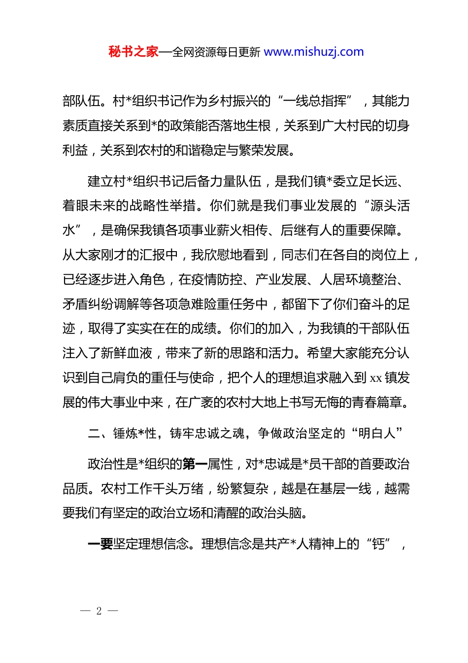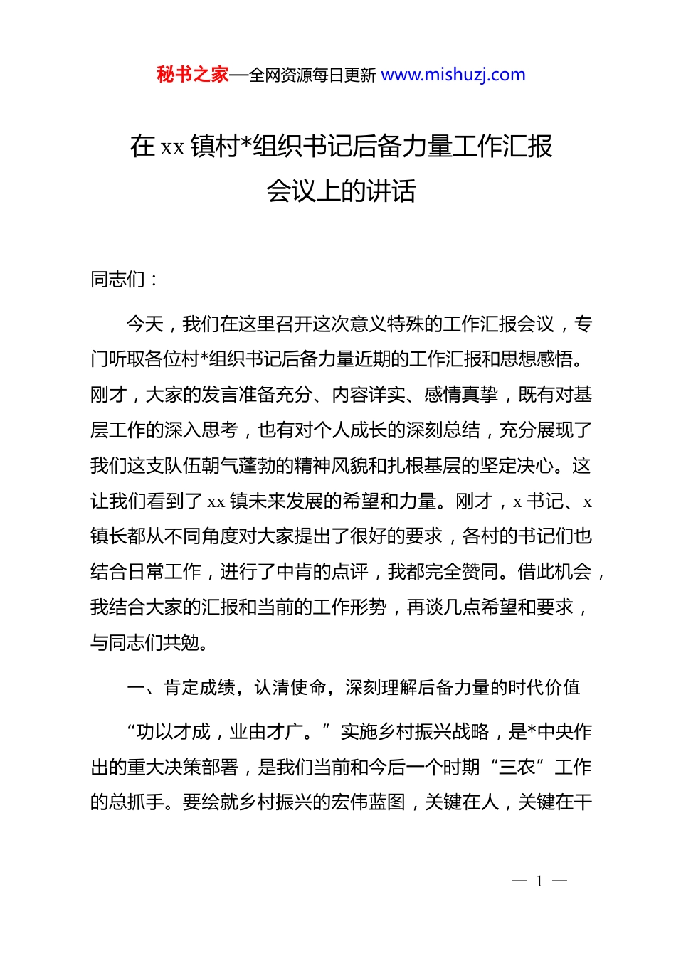 秘书之家—全网资源每日更新 www.mishuzj.com在 xx 镇村*组织书记后备力量工作汇报会议上的讲话同志们:今天,我们在这里召开这次意义特殊的工作汇报会议,专门听取各位村*组织书记后备力量近期的工作汇报和思想感悟。刚才,大家的发言准备充分、内容详实、感情真挚,既有对基层工作的深入思考,也有对个人成长的深刻总结,充分展现了我们这支队伍朝气蓬勃的精神风貌和扎根基层的坚定决心。这让我们看到了 xx 镇未来发展的希望和力量。刚才,x 书记、x镇长都从不同角度对大家提出了很好的要求,各村的书记们也结合日常工作,进行了中肯的点评,我都完全赞同。借此机会,我结合大家的汇报和当前的工作形势,再谈几点希望和要求,与同志们共勉。一、肯定成绩,认清使命,深刻理解后备力量的时代价值“功以才成,业由才广。”实施乡村振兴战略,是*中央作出的重大决策部署,是我们当前和今后一个时期“三农”工作的总抓手。要绘就乡村振兴的宏伟蓝图,关键在人,关键在干— 1 —秘书之家—全网资源每日更新 www.mishuzj.com部队伍。村*组织书记作为乡村振兴的“一线总指挥”,其能力素质直接关系到*的政策能否落地生根,关系到广大村民的切身利益,关系到农村的和谐稳定与繁荣发展。建立村*组织书记后备力量队伍,是我们镇*委立足长远、着眼未来的战略性举措。你们就是我们事业发展的“源头活水”,是确保我镇各项事业薪火相传、后继有人的重要保障。从大家刚才的汇报中,我欣慰地看到,同志们在各自的岗位上,已经逐步进入角色,在疫情防控、产业发展、人居环境整治、矛盾纠纷调解等各项急难险重任务中,都留下了你们奋斗的足迹,取得了实实在在的成绩。你们的加入,为我镇的干部队伍注入了新鲜血液,带来了新的思路和活力。希望大家能充分认识到自己肩负的重任与使命,把个人的理想追求融入到 xx 镇发展的伟大事业中来,在广袤的农村大地上书写无悔的青春篇章。二、锤炼*性,铸牢忠诚之魂,争做政治坚定的“明白人”政治性是*组织的第一属性,对*忠诚是*员干部的首要政治品质。农村工作千头万绪,纷繁复杂,越是在基层一线,越需要我们有坚定的政治立场和清醒的政治头脑。一要坚定理想信念。理想信念是共产*人精神上的“钙”,— 2 —秘书之家—全网资源每日更新 www.mishuzj.com没有理想信念,或者理想信念不坚定,精神上就会“缺钙”,就会得“软骨病”。大家要坚持用*的创新理论武装头脑,深入学习领会**************思想,深刻领悟“两个确立”的决定性意义,增强“四个意识”、坚定“四个自信”、做到“两个维护”。要把学习成果转化为指导实践、推动工作的强大动力,确保在任何时候、任何情况下都同*中央保持高度一致。二要站稳人民立场。我们*的根基在人民、血脉在人民、力量在人民。作为基层干部,离群众最近,要始终把群众的安危冷暖放在心上。要牢记自己“从哪里来、到哪里去”,始终与人民群众想在一起、干在一起,风雨同舟、同甘共苦。要在大是大非面前旗帜鲜明,在风浪考验面前无所畏惧,在各种诱惑面前立场坚定,真正做到权为民所用、情为民所系、利为民所谋。三、扎根沃土,厚植为民之情,争做服务群众的“贴心人”基层是最好的课堂,群众是最好的老师。作为后备力量,必须把根深深地扎在 xx 这片沃土里,与群众建立起血浓于水的深厚感情。— 3 —秘书之家—全网资源每日更新 www.mishuzj.com一要脚步勤快,深入群众。“坐在办公室碰到的都是问题,深入基层看到的全是办法。”大家要坚决克服“机关化”倾向,多到田间地头走一走,多到百姓炕头坐一坐,用脚步丈量民情,用真心倾听民声。要学会说群众听得懂的话,办群众盼着办的事,真正从“身入”基层转变为“心入”基层,成为群众愿意交心、信得过的自己人。二要用心用情,服务群众。服务群众不能停留在口号上,必须体现在具体行动中。要聚焦群众的“急难愁盼”问题,从解决一件件具体的小事入手,比如帮助解决邻里纠纷、协助办理医保社保、关心关爱留守儿童和孤寡老人等,用专业的服务赢得民意,用真挚的情感温暖民心。要通过自己的努力,让群众切实感受到*的关怀和温暖,不断增强他们的获得感...