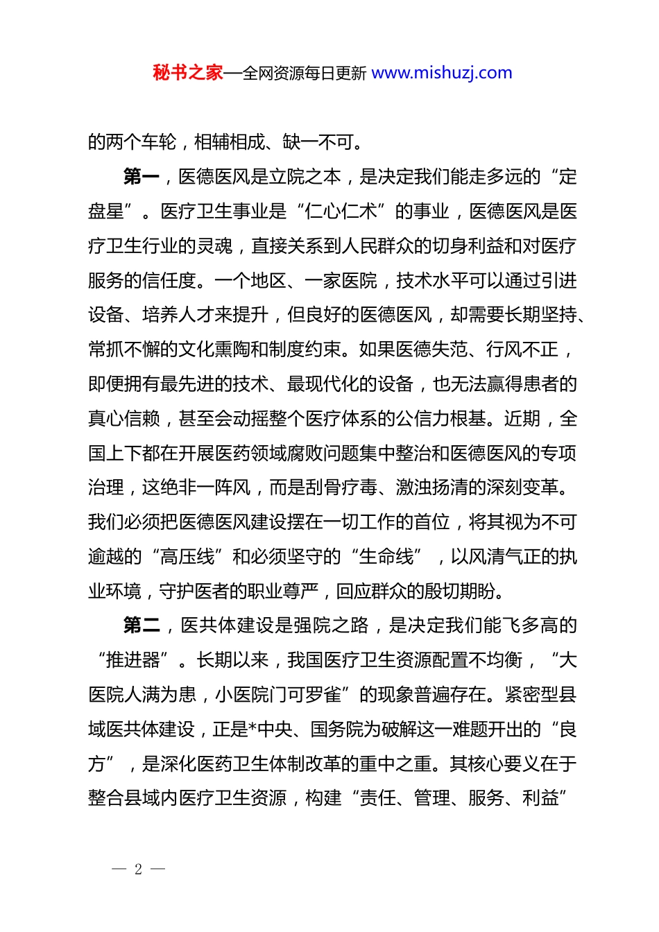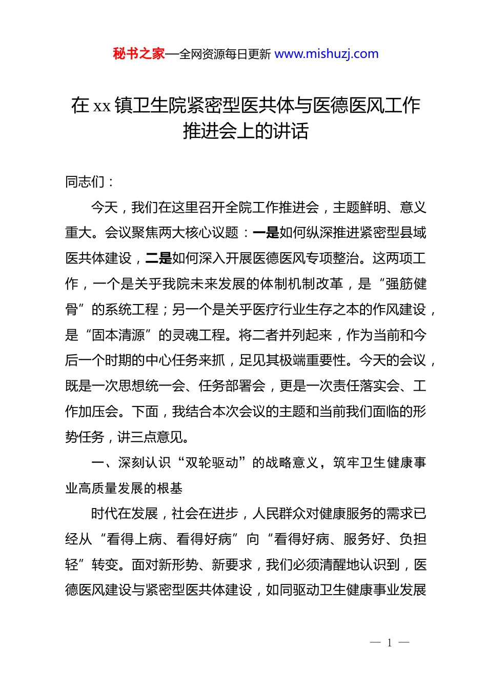 秘书之家—全网资源每日更新 www.mishuzj.com在 xx 镇卫生院紧密型医共体与医德医风工作推进会上的讲话同志们:今天,我们在这里召开全院工作推进会,主题鲜明、意义重大。会议聚焦两大核心议题:一是如何纵深推进紧密型县域医共体建设,二是如何深入开展医德医风专项整治。这两项工作,一个是关乎我院未来发展的体制机制改革,是“强筋健骨”的系统工程;另一个是关乎医疗行业生存之本的作风建设,是“固本清源”的灵魂工程。将二者并列起来,作为当前和今后一个时期的中心任务来抓,足见其极端重要性。今天的会议,既是一次思想统一会、任务部署会,更是一次责任落实会、工作加压会。下面,我结合本次会议的主题和当前我们面临的形势任务,讲三点意见。一、深刻认识“双轮驱动”的战略意义,筑牢卫生健康事业高质量发展的根基时代在发展,社会在进步,人民群众对健康服务的需求已经从“看得上病、看得好病”向“看得好病、服务好、负担轻”转变。面对新形势、新要求,我们必须清醒地认识到,医德医风建设与紧密型医共体建设,如同驱动卫生健康事业发展— 1 —秘书之家—全网资源每日更新 www.mishuzj.com的两个车轮,相辅相成、缺一不可。第一,医德医风是立院之本,是决定我们能走多远的“定盘星”。医疗卫生事业是“仁心仁术”的事业,医德医风是医疗卫生行业的灵魂,直接关系到人民群众的切身利益和对医疗服务的信任度。一个地区、一家医院,技术水平可以通过引进设备、培养人才来提升,但良好的医德医风,却需要长期坚持、常抓不懈的文化熏陶和制度约束。如果医德失范、行风不正,即便拥有最先进的技术、最现代化的设备,也无法赢得患者的真心信赖,甚至会动摇整个医疗体系的公信力根基。近期,全国上下都在开展医药领域腐败问题集中整治和医德医风的专项治理,这绝非一阵风,而是刮骨疗毒、激浊扬清的深刻变革。我们必须把医德医风建设摆在一切工作的首位,将其视为不可逾越的“高压线”和必须坚守的“生命线”,以风清气正的执业环境,守护医者的职业尊严,回应群众的殷切期盼。第二,医共体建设是强院之路,是决定我们能飞多高的“推进器”。长期以来,我国医疗卫生资源配置不均衡,“大医院人满为患,小医院门可罗雀”的现象普遍存在。紧密型县域医共体建设,正是*中央、国务院为破解这一难题开出的“良方”,是深化医药卫生体制改革的重中之重。其核心要义在于整合县域内医疗卫生资源,构建“责任、管理、服务、利益”— 2 —秘书之家—全网资源每日更新 www.mishuzj.com共同体,形成“基层首诊、双向转诊、急慢分治、上下联动”的分级诊疗格局。根据相关规划,到 2025 年,县域内就诊率要力争达到 90%以上,这是一个硬指标。对于我们 xx 镇卫生院而言,作为医共体的重要组成部分,绝不能把自己看作是简单的“卫生院”,而是县域医疗服务体系中承上启下的关键枢纽。我们既要接得住上级医院下沉的优质资源,也要服务好辖区内的居民和村卫生室。建好医共体,不是简单的挂牌子、走形式,而是要通过深度的资源融合、管理协同、服务联动,真正提升我们自身的造血功能和服务能力,让我们在县域医疗卫生体系中找准定位、体现价值,最终实现“大病不出县、小病不出镇”的改革目标。第三,二者相辅相成,是实现协同发展的“动力源”。良好的医德医风是医共体建设顺利推进的“润滑剂”和“催化剂”。只有医务人员廉洁行医、用心服务,才能在群众中建立起信任,患者才愿意相信我们的诊疗建议,接受在基层首诊或由上级医院转诊回基层康复。没有信任,分级诊疗就无从谈起。反过来,紧密型医共体为医德医风建设提供了有力的制度平台和抓手。在医共体内部,可以建立统一的绩效考核、薪酬分配、监督管理体系。通过将医德医风表现与个人收入、职业晋升等直接挂钩,能够更有效地规范医疗行为,形成正向激励。因此,— 3 —秘书之家—全网资源每日更新 www.mishuzj.com我们必须坚持“两手抓、两手都要硬”,以医德医风建设净化医疗生态,以医共体改革激发内生动力,形成“1+1>;2”的叠加效应,共同推动我院乃至全县卫生健康事业迈上新台阶。二、聚焦关键环节,精准发力...