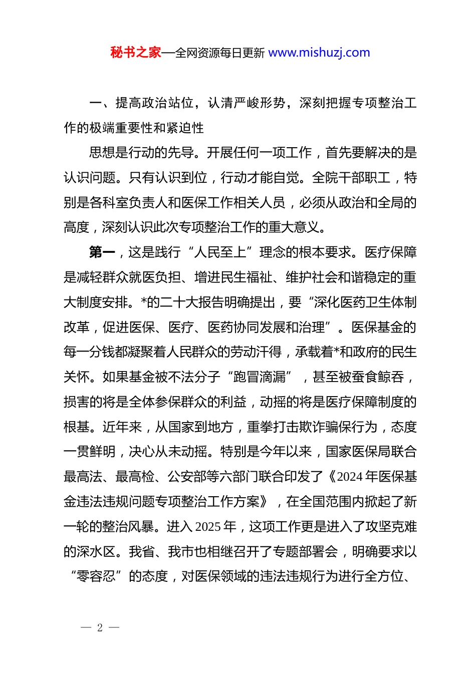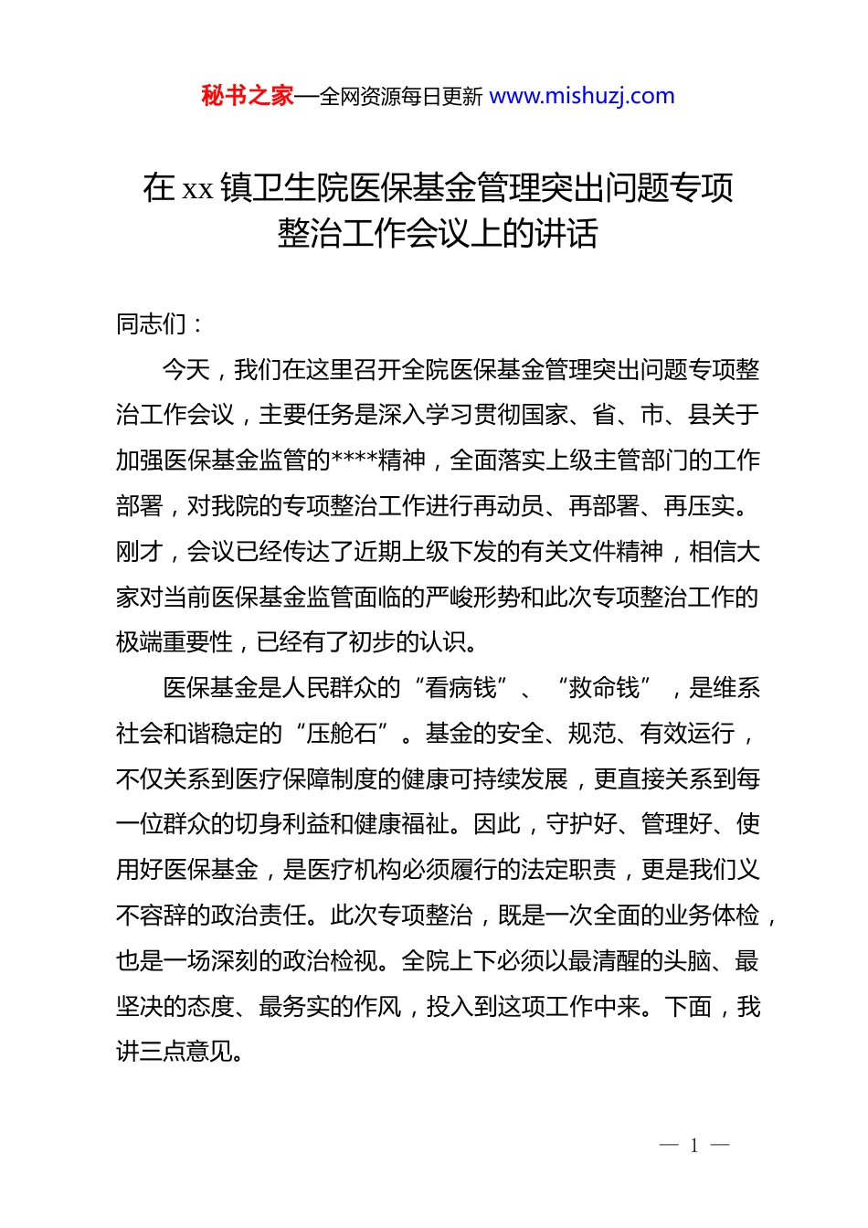 秘书之家—全网资源每日更新 www.mishuzj.com在 xx 镇卫生院医保基金管理突出问题专项整治工作会议上的讲话同志们:今天,我们在这里召开全院医保基金管理突出问题专项整治工作会议,主要任务是深入学习贯彻国家、省、市、县关于加强医保基金监管的****精神,全面落实上级主管部门的工作部署,对我院的专项整治工作进行再动员、再部署、再压实。刚才,会议已经传达了近期上级下发的有关文件精神,相信大家对当前医保基金监管面临的严峻形势和此次专项整治工作的极端重要性,已经有了初步的认识。医保基金是人民群众的“看病钱”、“救命钱”,是维系社会和谐稳定的“压舱石”。基金的安全、规范、有效运行,不仅关系到医疗保障制度的健康可持续发展,更直接关系到每一位群众的切身利益和健康福祉。因此,守护好、管理好、使用好医保基金,是医疗机构必须履行的法定职责,更是我们义不容辞的政治责任。此次专项整治,既是一次全面的业务体检,也是一场深刻的政治检视。全院上下必须以最清醒的头脑、最坚决的态度、最务实的作风,投入到这项工作中来。下面,我讲三点意见。— 1 —秘书之家—全网资源每日更新 www.mishuzj.com一、提高政治站位,认清严峻形势,深刻把握专项整治工作的极端重要性和紧迫性思想是行动的先导。开展任何一项工作,首先要解决的是认识问题。只有认识到位,行动才能自觉。全院干部职工,特别是各科室负责人和医保工作相关人员,必须从政治和全局的高度,深刻认识此次专项整治工作的重大意义。第一,这是践行“人民至上”理念的根本要求。医疗保障是减轻群众就医负担、增进民生福祉、维护社会和谐稳定的重大制度安排。*的二十大报告明确提出,要“深化医药卫生体制改革,促进医保、医疗、医药协同发展和治理”。医保基金的每一分钱都凝聚着人民群众的劳动汗得,承载着*和政府的民生关怀。如果基金被不法分子“跑冒滴漏”,甚至被蚕食鲸吞,损害的将是全体参保群众的利益,动摇的将是医疗保障制度的根基。近年来,从国家到地方,重拳打击欺诈骗保行为,态度一贯鲜明,决心从未动摇。特别是今年以来,国家医保局联合最高法、最高检、公安部等六部门联合印发了《2024 年医保基金违法违规问题专项整治工作方案》,在全国范围内掀起了新一轮的整治风暴。进入 2025 年,这项工作更是进入了攻坚克难的深水区。我省、我市也相继召开了专题部署会,明确要求以“零容忍”的态度,对医保领域的违法违规行为进行全方位、— 2 —秘书之家—全网资源每日更新 www.mishuzj.com无死角的清理整顿。这充分表明,加强基金监管,维护基金安全,已经上升到前所未有的战略高度。我们作为身处一线的基层医疗机构,是医保政策的最终执行者,也是基金使用的直接责任人,必须不折不扣地把思想和行动统一到上级的决策部署上来,以实际行动捍卫人民群众的健康权益。第二,这是维护行业健康发展的内在需要。当前,医保基金监管正面临着前所未有的严峻形势和复杂挑战。从全国范围来看,欺诈骗保手段花样翻新、日益隐蔽,从过去的明目张胆,演变为如今的专业化、团伙化,给监管工作带来了巨大压力。分解住院、挂床住院、虚假诊疗、串换药品、倒卖“回流药”等问题在一些地区屡禁不止,严重污染了行业生态,损害了医务工作者的整体形象。根据国家医保局通报的数据,2024 年全国累计追回医保基金高达 210 多亿元。我省在去年的专项检查中,也处理违规医药机构超过 5000 家,追回基金及罚款总计近8 亿元。具体到我们 xx 县,去年以来,通过飞行检查、专项督查等方式,查处各类违规使用医保基金问题线索近百条,涉及金额超过 300 万元。这些触目惊心的数据,为我们敲响了警钟。我们必须清醒地认识到,虽然我院在历次检查中没有出现重大的违法违规案件,但绝不意味着我们可以高枕无忧。通过前一阶段的初步自查,以及上级部门日常的智能审核监控反馈,— 3 —秘书之家—全网资源每日更新 www.mishuzj.com我们同样发现了一些不容忽视的苗头性、倾向性问题。例如,在 2023 年至 2024 年期间,我院因超量开药、重复检查、不规范收费等问题,被医保经办机构核查并追回的基...
