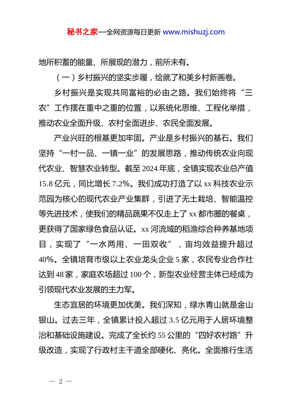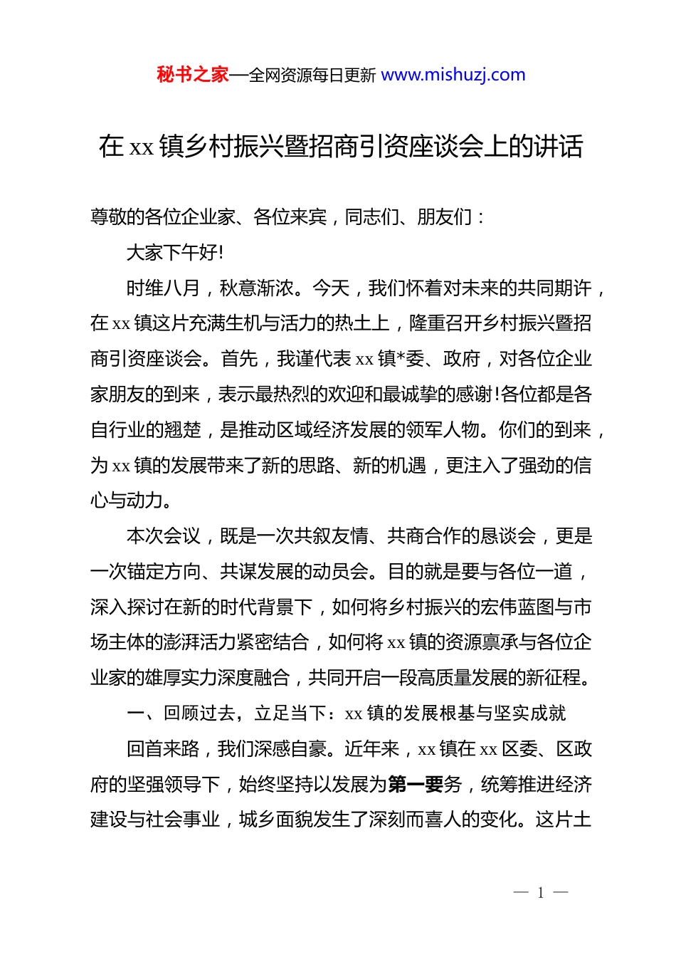 秘书之家—全网资源每日更新 www.mishuzj.com在 xx 镇乡村振兴暨招商引资座谈会上的讲话尊敬的各位企业家、各位来宾,同志们、朋友们:大家下午好!时维八月,秋意渐浓。今天,我们怀着对未来的共同期许,在 xx 镇这片充满生机与活力的热土上,隆重召开乡村振兴暨招商引资座谈会。首先,我谨代表 xx 镇*委、政府,对各位企业家朋友的到来,表示最热烈的欢迎和最诚挚的感谢!各位都是各自行业的翘楚,是推动区域经济发展的领军人物。你们的到来,为 xx 镇的发展带来了新的思路、新的机遇,更注入了强劲的信心与动力。本次会议,既是一次共叙友情、共商合作的恳谈会,更是一次锚定方向、共谋发展的动员会。目的就是要与各位一道,深入探讨在新的时代背景下,如何将乡村振兴的宏伟蓝图与市场主体的澎湃活力紧密结合,如何将 xx 镇的资源禀承与各位企业家的雄厚实力深度融合,共同开启一段高质量发展的新征程。一、回顾过去,立足当下:xx 镇的发展根基与坚实成就回首来路,我们深感自豪。近年来,xx 镇在 xx 区委、区政府的坚强领导下,始终坚持以发展为第一要务,统筹推进经济建设与社会事业,城乡面貌发生了深刻而喜人的变化。这片土— 1 —秘书之家—全网资源每日更新 www.mishuzj.com地所积蓄的能量、所展现的潜力,前所未有。(一)乡村振兴的坚实步履,绘就了和美乡村新画卷。乡村振兴是实现共同富裕的必由之路。我们始终将“三农”工作摆在重中之重的位置,以系统化思维、工程化举措,推动农业全面升级、农村全面进步、农民全面发展。产业兴旺的根基更加牢固。产业是乡村振兴的基石。我们坚持“一村一品、一镇一业”的发展思路,推动传统农业向现代农业、智慧农业转型。截至 2024 年底,全镇实现农业总产值15.8 亿元,同比增长 7.2%。我们成功打造了以 xx 科技农业示范园为核心的现代农业产业集群,引进了无土栽培、智能温控等先进技术,使我们的精品蔬果不仅走上了 xx 都市圈的餐桌,更获得了国家绿色食品认证。xx 河流域的稻渔综合种养基地项目,实现了“一水两用、一田双收”,亩均效益提升超过40%。全镇培育市级以上农业龙头企业 5 家,农民专业合作社达到 48 家,家庭农场超过 100 个,新型农业经营主体已经成为引领现代农业发展的主力军。生态宜居的环境更加优美。我们深知,绿水青山就是金山银山。过去三年,全镇累计投入超过 3.5 亿元用于人居环境整治和基础设施建设。完成了全长约 55 公里的“四好农村路”升级改造,实现了行政村主干道全部硬化、亮化。全面推行生活— 2 —秘书之家—全网资源每日更新 www.mishuzj.com垃圾分类处理,建成 3 座现代化垃圾中转站,无害化处理率达到 100%。xx 河生态廊道修复工程顺利竣工,再现了“水清、岸绿、景美”的江南风光。全镇森林覆盖率达到 38.5%,空气质量优良天数比例常年保持在 85%以上,xx 镇成功入选“xx 省生态文明建设示范镇”。乡风文明的底色更加鲜明。我们坚持物质文明和精神文明“两手抓、两手硬”。深入开展文明村镇、文明家庭创建活动,建成新时代文明实践所(站)22 个,实现了全覆盖。挖掘和弘扬本地的 xx 耕读文化、xx 民俗文化,修缮了一批历史建筑,打造了 xx 村史馆等文化地标,让乡愁有寄托,让文化有传承。农民生活的福祉更加殷实。发展的最终目的是为了人民。通过产业带动、就业帮扶、政策兜底,农民的“钱袋子”越来越鼓.2024 年,我镇农村居民人均可支配收入达到 42,500 元,同比增长 8.1%,增速连续三年领跑全区。我们持续巩固拓展脱贫攻坚成果,对所有脱贫户和监测户实行动态管理,“一户一策”精准帮扶,确保不发生一例返贫现象。(二)经济发展的蓬勃态势,积蓄了转型跨越新动能。在扎实推进乡村振兴的同时,我们坚持以高质量发展为统揽,经济运行稳中有进、稳中向好,为未来发展奠定了坚实的物质基础。— 3 —秘书之家—全网资源每日更新 www.mishuzj.com经济总量实现新跨越。面对复杂多变的外部环境,xx 镇的经济展现出强大的韧性和活力。2024 年,全镇实现地区生产总值(gdp)125.6 亿元,同比增长 6.8%。固定资产投资完成...