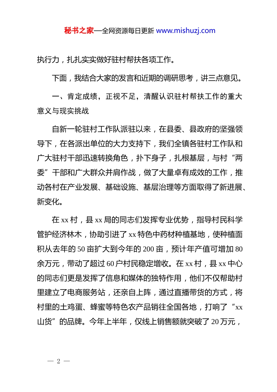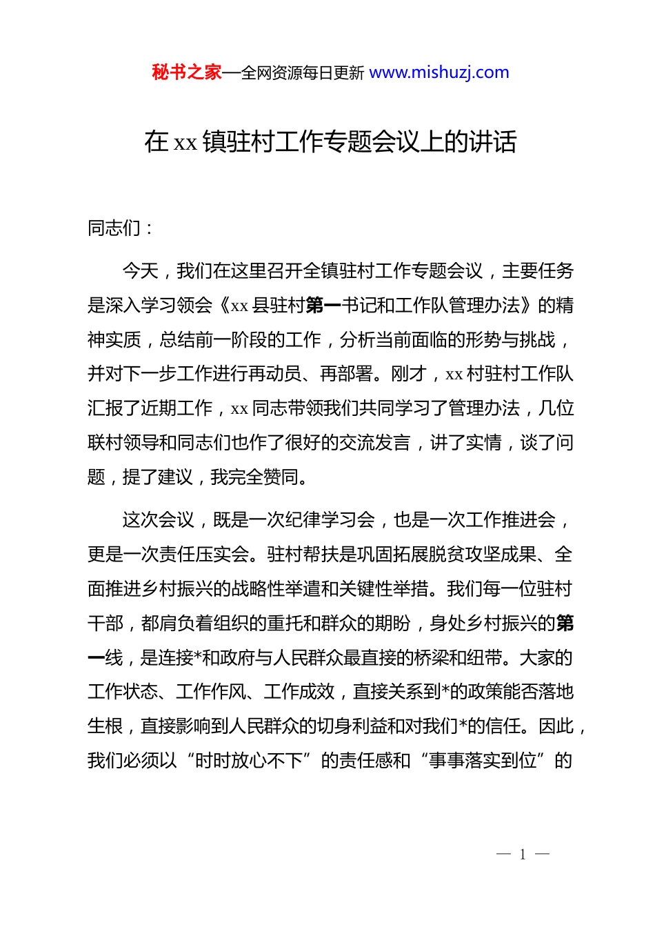 秘书之家—全网资源每日更新 www.mishuzj.com在 xx 镇驻村工作专题会议上的讲话同志们:今天,我们在这里召开全镇驻村工作专题会议,主要任务是深入学习领会《xx 县驻村第一书记和工作队管理办法》的精神实质,总结前一阶段的工作,分析当前面临的形势与挑战,并对下一步工作进行再动员、再部署。刚才,xx 村驻村工作队汇报了近期工作,xx 同志带领我们共同学习了管理办法,几位联村领导和同志们也作了很好的交流发言,讲了实情,谈了问题,提了建议,我完全赞同。这次会议,既是一次纪律学习会,也是一次工作推进会,更是一次责任压实会。驻村帮扶是巩固拓展脱贫攻坚成果、全面推进乡村振兴的战略性举遣和关键性举措。我们每一位驻村干部,都肩负着组织的重托和群众的期盼,身处乡村振兴的第一线,是连接*和政府与人民群众最直接的桥梁和纽带。大家的工作状态、工作作风、工作成效,直接关系到*的政策能否落地生根,直接影响到人民群众的切身利益和对我们*的信任。因此,我们必须以“时时放心不下”的责任感和“事事落实到位”的— 1 —秘书之家—全网资源每日更新 www.mishuzj.com执行力,扎扎实实做好驻村帮扶各项工作。下面,我结合大家的发言和近期的调研思考,讲三点意见。一、肯定成绩,正视不足,清醒认识驻村帮扶工作的重大意义与现实挑战自新一轮驻村工作队派驻以来,在县委、县政府的坚强领导下,在各派出单位的大力支持下,我们全镇各驻村工作队和广大驻村干部迅速转换角色,扑下身子,扎根基层,与村“两委”干部和广大群众并肩作战,做了大量卓有成效的工作,推动各村在产业发展、基础设施、基层治理等方面取得了新进展、新变化。在 xx 村,县 xx 局的同志们发挥专业优势,指导村民科学管护经济林木,协助引进了 xx 特色中药材种植基地,使种植面积从去年的 50 亩扩大到今年的 200 亩,预计年产值可增加 80余万元,带动了超过 60 户村民稳定增收。在 xx 村,县 xx 中心的同志们更是发挥了信息和媒体的独特作用,他们不仅帮助村里建立了电商服务站,还亲自上阵,通过直播带货的方式,将村里的土鸡蛋、蜂蜜等特色农产品销往全国各地,打响了“xx山货”的品牌。今年上半年,仅线上销售额就突破了 20 万元,— 2 —秘书之家—全网资源每日更新 www.mishuzj.com为村集体经济注入了新的活力。回顾历史,早在 2016 年,得益于国家部委的定点帮扶,xx 村就投入近 300 万元完成了村组道路的硬化工程彻底解决了群众“晴天一身土,雨天一身泥”的出行难题。这些成绩的取得,凝聚着我们历届和在任驻村干部的心血与汗水,大家辛苦了!在肯定成绩的同时,我们更要清醒地看到工作中存在的不足和面临的严峻挑战。从刚才 xx 村工作队的汇报和我们日常掌握的情况来看,一些共性问题依然存在,需要我们高度重视。比如,有的同志“身在心不在”,满足于开会签到、填表报数,下村入户“蜻蜓点水”,对群众的急难愁盼了解不深、掌握不透;有的同志工作思路不清,面对复杂的村情民意,找不到切入点和着力点,工作推进缓慢,成效不彰;还有的同志存在“歇歇脚、松口气”的懈怠思想,认为脱贫攻坚已经完成,乡村振兴可以慢慢来,工作标准有所下降,纪律要求有所放松。这些问题虽然发生在少数人身上,但其负面影响不可小觑,它不仅会削弱帮扶工作的实际效果,更会损害*和政府在群众心中的形象。当前,我们的工作已经进入了全面推进乡村振兴的新阶段。与脱贫攻坚时期相比,我们的任务更重、要求更高、涉及面也— 3 —秘书之家—全网资源每日更新 www.mishuzj.com更广。我们面对的不再是单一的“两不愁三保障”问题,而是产业、人才、文化、生态、组织“五个振兴”的系统工程。这要求我们必须有更宽的视野、更高的标准、更实的作风。我们必须深刻认识到,驻村工作不是“镀金”,而是“炼钢”;不是“过客”,而是“主人”。每一天都是一场考验,每一项工作都是一份答卷。我们唯有以“归零”的心态,以“冲刺”的姿态,才能在新征程上跑出好成绩,交出让组织放心、让群众满意的合格答卷。二、严守纪律,严格管理,筑牢驻村帮扶工作的作风保障与制度根基俗...