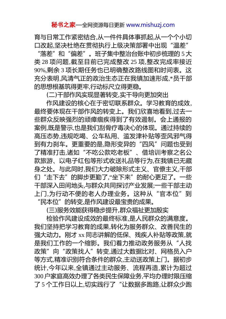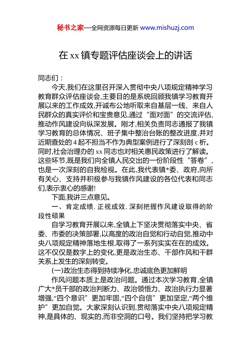 秘书之家—全网资源每日更新 www.mishuzj.com在 xx 镇专题评估座谈会上的讲话同志们:今天,我们在这里召开深入贯彻中央八项规定精神学习教育群众评估座谈会,主要目的是系统回顾我镇学习教育开展以来的工作成效,开诚布公地听取来自基层一线、来自人民群众的真实评价和宝贵意见,通过“面对面”的交流评估,推动作风建设向纵深发展。刚才,相关负责同志通报了我镇学习教育的总体情况、班子集中整治台账的整改进度,并对近期查处的 4 起不担当不作为典型案例进行了深刻剖 c 析。同时,社会治理办的 xx 同志也对相关惠民政策进行了解读。这些环节,既是我们向全镇人民交出的一份阶段性“答卷”,也是一次深刻的自我检视。在此,我代表镇*委、政府,向所有关心、支持并积极参与我镇作风建设的各位代表和同志们,表示衷心的感谢!下面,我讲三点意见。一、肯定成绩,正视成效,深刻把握作风建设取得的阶段性硕果自学习教育开展以来,全镇上下坚决贯彻落实中央、省委、市委的决策部署,以高度的政治自觉和行动自觉,推动中央八项规定精神落地生根,取得了一系列实实在在的成效。这不仅仅是数字上的变化,更是政治生态、干部作风和干群关系上发生的深刻转变。(一)政治生态得到持续净化,忠诚底色更加鲜明作风问题本质上是政治问题。通过本次学习教育,全镇广大*员干部的政治判断力、政治领悟力、政治执行力显著增强,“四个意识”更加牢固,“四个自信”更加坚定,“两个维护”更加自觉。大家深刻认识到,贯彻落实中央八项规定精神,是具体的、现实的,而非空洞的口号。我们坚持把学习教秘书之家—全网资源每日更新 www.mishuzj.com育与日常工作紧密结合,从一件件具体事抓起,从一个个小切口改起,坚决杜绝在贯彻执行上级决策部署中出现“温差”“落差”和“偏差”。班子集中整治台账中初步梳理的 5 大类 28 项问题,截至目前已完成整改 25 项,整改完成率接近90%,剩余 3 项长期任务也已明确整改路线图和时间表。这充分表明,风清气正的政治生态正在我镇加速形成,*员干部的思想根基筑得更牢,行动标尺立得更稳。(二)干部作风实现显著转变,实干导向更加突出作风建设的核心在于密切联系群众。学习教育的成效,最终要体现在干部作风的转变上。我们欣喜地看到,过去一些群众反映强烈的顽瘴痼疾得到了有效遏制。会上通报的案例,既是警示,也是我们刮骨疗毒决心的体现。通过持续的高压态势,违规吃喝、公车私用、滥发津补贴等歪风邪气得到有力刹车。更重要的是,隐形变异的“四风”问题也受到了精准打击,诸如“不吃公款吃老板”、借培训考察之名公款旅游、以电子红包等形式收送礼品等行为,在我镇已无藏身之处。与此同时,我们大力破除形式主义、官僚主义,干部们“走下去”的脚步更勤了,“坐下来”的耐心更足了。一些干部深入田间地头,与群众共同探讨产业发展;一些干部主动上门,为行动不便的老人办理业务。这种从“官本位”到“民本位”的转变,是作风建设最宝贵的成果。(三)服务效能获得稳步提升,群众福祉更加殷实检验作风建设成效的最终标准,是人民群众的满意度。我们坚持把学习教育的成果,转化为服务群众、改善民生的强大动力。刚才 xx 同志讲解的低保、残疾人补贴等政策,就是我们工作的一个缩影。我们着力推动政务服务从“人找政策”向“政策找人”转变,通过大数据比对、网格员入户等方式,精准识别符合条件的群众,主动送政策上门。据初步统计,今年以来,全镇通过主动服务、流程再造,累计为超过300 户家庭高效办理了各类民生保障业务,平均办理时限压缩了 5 个工作日以上,切实践行了“让数据多跑路,让群众少跑秘书之家—全网资源每日更新 www.mishuzj.com腿”的服务承诺。根据国家统计局 2024 年的调查数据,全国有 94.9%的受访群众对中央八项规定精神贯彻落实的成效表示肯定。今天,我们现场发放的评估表回收结果显示,与会代表对我镇学习教育成果的总体满意度超过了 95%,这给予了我们极大的鼓舞和鞭策。(四)*群关系变得更加密切,执政根基更加牢固民心是最大的政治。通过这次学习教育,我们畅通了群众监督的渠道,搭建了干群连心的桥梁。今天邀请各位群众代表来参加评估会,就是要开门纳谏、自觉接受监督。这本身就...