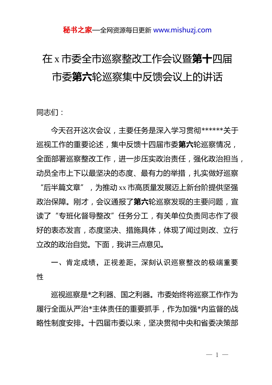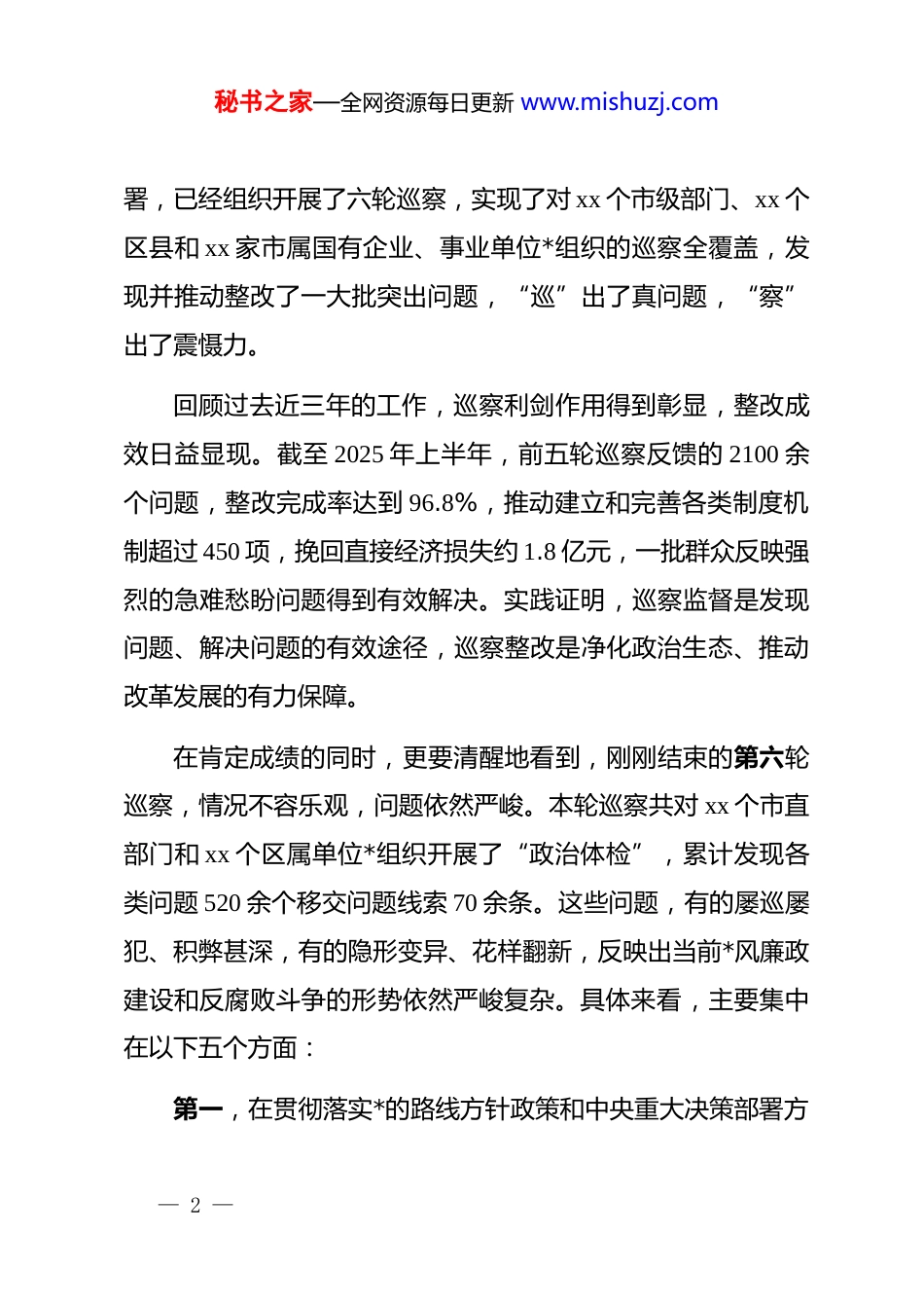 秘书之家—全网资源每日更新 www.mishuzj.com在 x 市委全市巡察整改工作会议暨第十四届市委第六轮巡察集中反馈会议上的讲话同志们:今天召开这次会议,主要任务是深入学习贯彻******关于巡视工作的重要论述,集中反馈十四届市委第六轮巡察情况,全面部署巡察整改工作,进一步压实政治责任,强化政治担当,动员全市上下以最坚决的态度、最有力的举措,扎实做好巡察“后半篇文章”,为推动 xx 市高质量发展迈上新台阶提供坚强政治保障。刚才,会议通报了第六轮巡察发现的主要问题,宣读了“专班化督导整改”任务分工,有关单位负责同志作了很好的表态发言,态度坚决、措施具体,体现了闻过则改、立行立改的政治自觉。下面,我讲三点意见。一、肯定成绩,正视差距,深刻认识巡察整改的极端重要性巡视巡察是*之利器、国之利器。市委始终将巡察工作作为履行全面从严治*主体责任的重要抓手,作为加强*内监督的战略性制度安排。十四届市委以来,坚决贯彻中央和省委决策部— 1 —秘书之家—全网资源每日更新 www.mishuzj.com署,已经组织开展了六轮巡察,实现了对 xx 个市级部门、xx 个区县和 xx 家市属国有企业、事业单位*组织的巡察全覆盖,发现并推动整改了一大批突出问题,“巡”出了真问题,“察”出了震慑力。回顾过去近三年的工作,巡察利剑作用得到彰显,整改成效日益显现。截至 2025 年上半年,前五轮巡察反馈的 2100 余个问题,整改完成率达到 96.8%,推动建立和完善各类制度机制超过 450 项,挽回直接经济损失约 1.8 亿元,一批群众反映强烈的急难愁盼问题得到有效解决。实践证明,巡察监督是发现问题、解决问题的有效途径,巡察整改是净化政治生态、推动改革发展的有力保障。在肯定成绩的同时,更要清醒地看到,刚刚结束的第六轮巡察,情况不容乐观,问题依然严峻。本轮巡察共对 xx 个市直部门和 xx 个区属单位*组织开展了“政治体检”,累计发现各类问题 520 余个移交问题线索 70 余条。这些问题,有的屡巡屡犯、积弊甚深,有的隐形变异、花样翻新,反映出当前*风廉政建设和反腐败斗争的形势依然严峻复杂。具体来看,主要集中在以下五个方面:第一,在贯彻落实*的路线方针政策和中央重大决策部署方— 2 —秘书之家—全网资源每日更新 www.mishuzj.com面存在“温差”。一些单位*组织政治站位不高,对“国之大者”心中无数,学习贯彻新发展理念不坚决、不全面、不到位。有的在推动经济转型升级、优化营商环境、防范化解重大风险等中心工作上,满足于开会发文,实际行动迟缓、效果不彰。有的单位对中央环保督察反馈问题整改不力,存在敷衍整改、表面整改现象,生态环境领域的短板依然突出。这些问题的根源在于政治意识不强、政治担当缺失,未能将“两个维护”真正体现在履职尽责的实际行动中。第二,在落实全面从严治*主体责任和监督责任方面存在“落差”。一些*组织管*治*失之于宽、失之于软,主体责任这根“弦”绷得不紧,“一岗双责”落得不实。*委(*组)书记作为第一责任人,对*风廉政建设工作研究部署多、跟踪问效少,压力传导层层递减。纪检监察机构监督执纪问责力度不够,对苗头性、倾向性问题抓早抓小不够,日常监督存在盲区。在工程建设、政府采购、国有资产管理等重点领域和关键环节,廉洁风险依然较高,违规操作、利益输送问题时有发生。第三,在践行以人民为中心的发展思想方面存在“偏差”。一些单位宗旨意识淡薄,漠视群众利益,形式主义、官僚主义问题顽固存在。有的窗口单位服务意识不强、办事效率不高,— 3 —秘书之家—全网资源每日更新 www.mishuzj.com让群众和企业“多头跑、来回跑”。有的在民生领域投入不足,教育、医疗、养老等公共服务体系仍有短板,群众的获得感、幸福感、安全感有待提升。有的对群众信访反映的突出问题,推诿扯皮、久拖不决,小问题拖成大矛盾。第四,在落实新时代*的组织路线方面存在“温差”。一些*组织 dj 主业意识不强,存在重业务、轻 dj 的倾向,基层*组织建设薄弱。*内政治生活不严肃、不规范,“三会一课”制度执行不到位。选人用人视野不宽、程序不严,干部队伍结构不优、活力不...