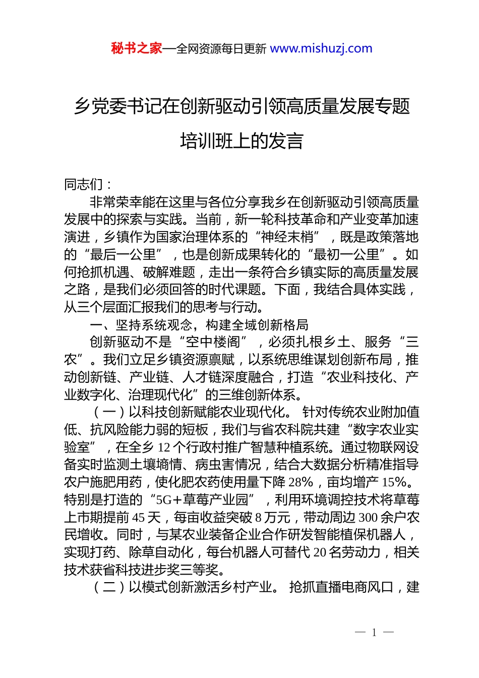 秘书之家—全网资源每日更新 www.mishuzj.com乡党委书记在创新驱动引领高质量发展专题培训班上的发言同志们:非常荣幸能在这里与各位分享我乡在创新驱动引领高质量发展中的探索与实践。当前,新一轮科技革命和产业变革加速演进,乡镇作为国家治理体系的“神经末梢”,既是政策落地的“最后一公里”,也是创新成果转化的“最初一公里”。如何抢抓机遇、破解难题,走出一条符合乡镇实际的高质量发展之路,是我们必须回答的时代课题。下面,我结合具体实践,从三个层面汇报我们的思考与行动。一、坚持系统观念,构建全域创新格局创新驱动不是“空中楼阁”,必须扎根乡土、服务“三农”。我们立足乡镇资源禀赋,以系统思维谋划创新布局,推动创新链、产业链、人才链深度融合,打造“农业科技化、产业数字化、治理现代化”的三维创新体系。(一)以科技创新赋能农业现代化。 针对传统农业附加值低、抗风险能力弱的短板,我们与省农科院共建“数字农业实验室”,在全乡 12 个行政村推广智慧种植系统。通过物联网设备实时监测土壤墒情、病虫害情况,结合大数据分析精准指导农户施肥用药,使化肥农药使用量下降 28%,亩均增产 15%。特别是打造的“5G+草莓产业园”,利用环境调控技术将草莓上市期提前 45 天,每亩收益突破 8 万元,带动周边 300 余户农民增收。同时,与某农业装备企业合作研发智能植保机器人,实现打药、除草自动化,每台机器人可替代 20 名劳动力,相关技术获省科技进步奖三等奖。(二)以模式创新激活乡村产业。 抢抓直播电商风口,建— 1 —秘书之家—全网资源每日更新 www.mishuzj.com设乡镇电商孵化基地,构建“产地仓+直播间+云仓”供应链体系。引进专业运营团队,免费为农户提供短视频拍摄、直播话术培训,培育本土“网红新农人”47 名。2024 年,全乡农产品网络零售额达 1.2 亿元,同比增长 83%,某村通过直播销售手工红薯粉条,单日最高销量突破 5000 单,真正让手机成为“新农具”、流量成为“新农资”。特别是创新“共享车间”模式,将闲置的村小学改造为食品加工厂,为 12 家小微企业提供标准化生产场地,带动集体经济年增收 40 万元。(三)以治理创新提升服务效能。 针对群众办事难、审批慢的痛点,开发“智慧乡镇”管理平台,整合党建、民政、社保等 42 项服务事项,实现“一网通办”。在村级设立“24 小时自助服务终端”,群众刷脸即可办理临时救助、医保缴费等业务。特别是创新“网格化+积分制”治理模式,将环境整治、移风易俗等 15 项工作纳入积分考核,群众凭积分可在“爱心超市”兑换生活用品,激发了村民参与乡村治理的内生动力2024 年,通过该模式解决环境脏乱差问题 87 个,红白事大操大办现象减少 65%,相关经验被《人民日报》报道。二、深化改革开放,激发创新内生动力改革是破解发展难题的“金钥匙”,开放是融入新发展格局的“桥头堡”。我们以刀刃向内的勇气推进改革,以海纳百川的胸怀扩大开放,为高质量发展注入强劲动能。(一)向改革要红利,打造一流营商环境。 针对企业反映强烈的“检查多、审批慢”问题,我们推行“三色管理”制度:对诚信守法企业实行“绿色通道”,除专项检查外每年最多上门 1 次;对一般企业实行“黄色预警”,加强合规指导;对高风险企业实行“红色监管”,严查违法行为。同时,设立“企业服务专员”,为每家规上企业配备 1 名乡镇干部,提供“一对一”全程帮办服务。2024 年,全乡新增市场主体 216 家,其中规上工业企业 3 家,某新材料项目从签约到投产仅用时 6 个— 2 —秘书之家—全网资源每日更新 www.mishuzj.com月,创造了我县项目落地最快纪录。(二)向开放要空间,构建区域协作网络。主动融入长三角一体化发展,与江苏某镇共建“产业飞地”,创新采用“税收分成+GDP 共享”跨区域合作模式,合作建设标准化厂房 12万平方米,配套建设职工公寓、物流仓储等设施,吸引 11 家企业入驻,其中 6 家为高新技术企业,涵盖智能装备制造、新材料等领域。特别是抓住我县被纳入“国家农村产业融合发展示范园”创建名单的机遇,与上海某农业科技集团合作...
