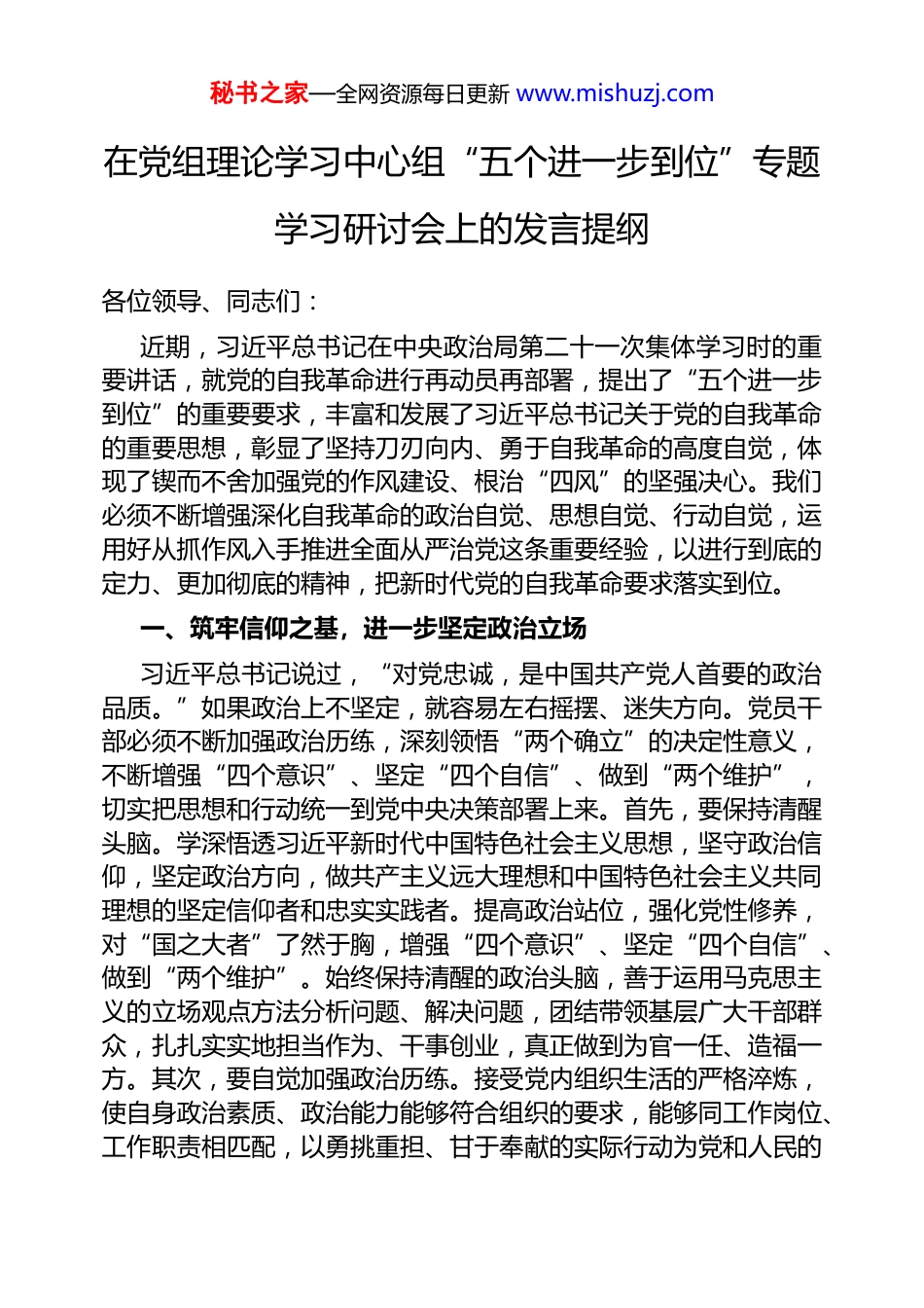 秘书之家—全网资源每日更新 www.mishuzj.com在党组理论学习中心组“五个进一步到位”专题学习研讨会上的发言提纲各位领导、同志们:近期,习近平总书记在中央政治局第二十一次集体学习时的重要讲话,就党的自我革命进行再动员再部署,提出了“五个进一步到位”的重要要求,丰富和发展了习近平总书记关于党的自我革命的重要思想,彰显了坚持刀刃向内、勇于自我革命的高度自觉,体现了锲而不舍加强党的作风建设、根治“四风”的坚强决心。我们必须不断增强深化自我革命的政治自觉、思想自觉、行动自觉,运用好从抓作风入手推进全面从严治党这条重要经验,以进行到底的定力、更加彻底的精神,把新时代党的自我革命要求落实到位。一、筑牢信仰之基,进一步坚定政治立场习近平总书记说过,“对党忠诚,是中国共产党人首要的政治品质。”如果政治上不坚定,就容易左右摇摆、迷失方向。党员干部必须不断加强政治历练,深刻领悟“两个确立”的决定性意义,不断增强“四个意识”、坚定“四个自信”、做到“两个维护”,切实把思想和行动统一到党中央决策部署上来。首先,要保持清醒头脑。学深悟透习近平新时代中国特色社会主义思想,坚守政治信仰,坚定政治方向,做共产主义远大理想和中国特色社会主义共同理想的坚定信仰者和忠实实践者。提高政治站位,强化党性修养,对“国之大者”了然于胸,增强“四个意识”、坚定“四个自信”、做到“两个维护”。始终保持清醒的政治头脑,善于运用马克思主义的立场观点方法分析问题、解决问题,团结带领基层广大干部群众,扎扎实实地担当作为、干事创业,真正做到为官一任、造福一方。其次,要自觉加强政治历练。接受党内组织生活的严格淬炼,使自身政治素质、政治能力能够符合组织的要求,能够同工作岗位、工作职责相匹配,以勇挑重担、甘于奉献的实际行动为党和人民的秘书之家—全网资源每日更新 www.mishuzj.com事业添砖加瓦。在实践中提高本领、增长才干,勇于创新、敢于斗争,在中华民族伟大复兴的征程中,以更大的力度抓好贯彻落实,以更多更好的办法解决发展中的难题。最后,及时校正思想偏差。要以党章为根本遵循,规范言行举止;以党纪为严格标尺,衡量对错得失,不断自省自改。要常省,时刻以“君子检身,常若有过”的态度,以党规党纪为镜,照一照“衣冠”是否端正,量一量德行是否有亏,及时矫正思想航线“偏差角”、拧紧纪律意识“总开关”。要常改,对于发现的问题,要深挖其根源,并及时进行纠正,时刻约束自己言行举止,不断筑牢廉洁自律底线,不越雷池半步、不跨红线一寸,始终保持一身正气。二、夯实为政之魂,进一步强化宗旨意识中国共产党自诞生之日起,就始终坚守“为中国人民谋幸福、为中华民族谋复兴”的初心使命,始终坚持共产主义远大理想,始终以马克思主义作为立党立国的根本指导思想。历史和实践反复证明,党员干部要传承发扬党的优良作风,就必须夯实党性修养这个“压舱石”,强化理论武装,补足精神之“钙”,筑牢思想防线,充分发挥理想信念和道德情操的引领作用,真正做到“正气存内,邪不可干”。首先,在政治上绝对忠诚。当前,面对“四大考验”“四种危险”,个别同志出现作风漂浮、脱离群众等问题,根子在于党性薄弱、德行失范。我们要以“君子检身,常若有过”的态度,把党性修养作为终身课题,在明大德、守公德、严私德中锤炼纯粹品格。其次,在思想上保持坚定。党员干部要始终从讲政治的高度看待作风建设,比如,发生在我们身边的一些干部在落实中央八项规定精神时搞变通、打折扣,表面是行为失范,实质是信仰淡化、宗旨淡漠。我们应该时常叩问“我是谁、为了谁、依靠谁”,从“心”上破除形式主义官僚主义的思想土壤,要结合中央八项规定精神学习教育,带头开展“回头看”,重点查摆调研走过场、履职重形式、凑数量等“四风”隐形变异问题,深挖作风积弊,做到不遮丑、不护短,及时健全完善各项制度,用制度建设堵塞监管漏洞。最后,在行动上果断坚决。要深刻领悟“两个确立”的决定性意义,秘书之家—全网资源每日更新 www.mishuzj.com深刻认识开展本次学习教育的实质精髓,清醒认识到中央八项规定及其...