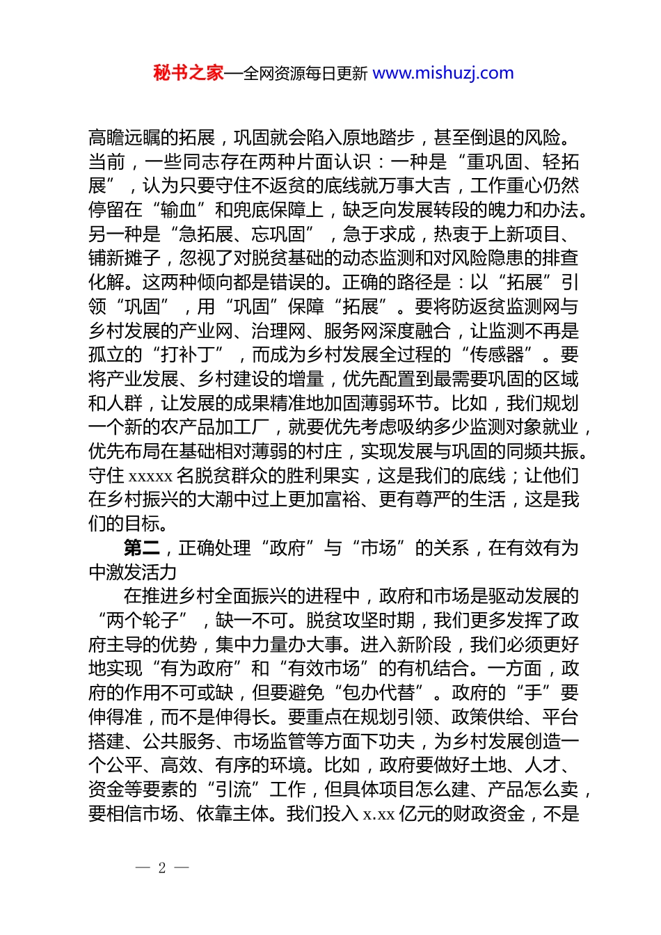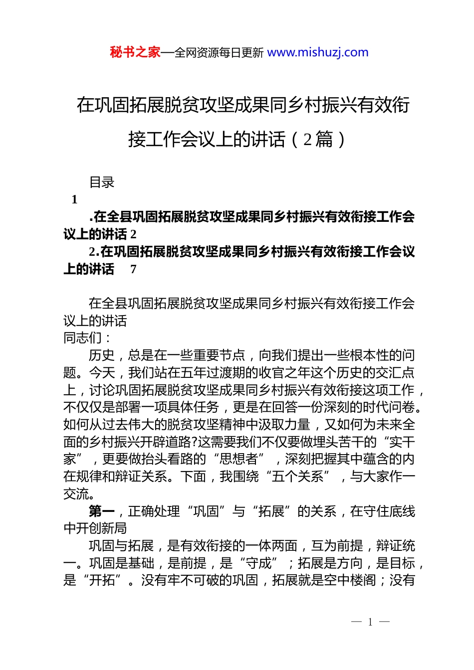 秘书之家—全网资源每日更新 www.mishuzj.com在巩固拓展脱贫攻坚成果同乡村振兴有效衔接工作会议上的讲话(2 篇)目录1.在全县巩固拓展脱贫攻坚成果同乡村振兴有效衔接工作会议上的讲话 22.在巩固拓展脱贫攻坚成果同乡村振兴有效衔接工作会议上的讲话7在全县巩固拓展脱贫攻坚成果同乡村振兴有效衔接工作会议上的讲话同志们:历史,总是在一些重要节点,向我们提出一些根本性的问题。今天,我们站在五年过渡期的收官之年这个历史的交汇点上,讨论巩固拓展脱贫攻坚成果同乡村振兴有效衔接这项工作,不仅仅是部署一项具体任务,更是在回答一份深刻的时代问卷。如何从过去伟大的脱贫攻坚精神中汲取力量,又如何为未来全面的乡村振兴开辟道路?这需要我们不仅要做埋头苦干的“实干家”,更要做抬头看路的“思想者”,深刻把握其中蕴含的内在规律和辩证关系。下面,我围绕“五个关系”,与大家作一交流。第一,正确处理“巩固”与“拓展”的关系,在守住底线中开创新局巩固与拓展,是有效衔接的一体两面,互为前提,辩证统一。巩固是基础,是前提,是“守成”;拓展是方向,是目标,是“开拓”。没有牢不可破的巩固,拓展就是空中楼阁;没有— 1 —秘书之家—全网资源每日更新 www.mishuzj.com高瞻远瞩的拓展,巩固就会陷入原地踏步,甚至倒退的风险。当前,一些同志存在两种片面认识:一种是“重巩固、轻拓展”,认为只要守住不返贫的底线就万事大吉,工作重心仍然停留在“输血”和兜底保障上,缺乏向发展转段的魄力和办法。另一种是“急拓展、忘巩固”,急于求成,热衷于上新项目、铺新摊子,忽视了对脱贫基础的动态监测和对风险隐患的排查化解。这两种倾向都是错误的。正确的路径是:以“拓展”引领“巩固”,用“巩固”保障“拓展”。要将防返贫监测网与乡村发展的产业网、治理网、服务网深度融合,让监测不再是孤立的“打补丁”,而成为乡村发展全过程的“传感器”。要将产业发展、乡村建设的增量,优先配置到最需要巩固的区域和人群,让发展的成果精准地加固薄弱环节。比如,我们规划一个新的农产品加工厂,就要优先考虑吸纳多少监测对象就业,优先布局在基础相对薄弱的村庄,实现发展与巩固的同频共振。守住 xxxxx 名脱贫群众的胜利果实,这是我们的底线;让他们在乡村振兴的大潮中过上更加富裕、更有尊严的生活,这是我们的目标。第二,正确处理“政府”与“市场”的关系,在有效有为中激发活力在推进乡村全面振兴的进程中,政府和市场是驱动发展的“两个轮子”,缺一不可。脱贫攻坚时期,我们更多发挥了政府主导的优势,集中力量办大事。进入新阶段,我们必须更好地实现“有为政府”和“有效市场”的有机结合。一方面,政府的作用不可或缺,但要避免“包办代替”。政府的“手”要伸得准,而不是伸得长。要重点在规划引领、政策供给、平台搭建、公共服务、市场监管等方面下功夫,为乡村发展创造一个公平、高效、有序的环境。比如,政府要做好土地、人才、资金等要素的“引流”工作,但具体项目怎么建、产品怎么卖,要相信市场、依靠主体。我们投入 x.xx 亿元的财政资金,不是— 2 —秘书之家—全网资源每日更新 www.mishuzj.com为了直接生产产品,而是为了撬动几十亿的社会资本,培育出能自主闯市场的经营主体。另一方面,市场的作用是决定性的,但要防止“脱缰失控”。要尊重市场规律,但不能当“甩手掌柜”。特别是对于刚刚起步的乡村产业,市场有其自发性和盲目性,容易出现同质化竞争、损害农民利益等问题。政府要做的,就是通过建立风险预警机制、产业指导目录、品牌标准体系等,为市场“导航”和“护航”。同时,要建立紧密的利益联结机制,引导龙头企业、合作社与小农户形成风险共担、利益共享的共同体,坚决防止资本下乡变成“资本下乡、农民上楼”的异化现象。第三,正确处理“塑形”与“铸魂”的关系,在内外兼修中建设和美乡村乡村振兴,既要振兴经济,也要振兴文化;既要“塑形”,建设美丽宜居的硬件环境,也要“铸魂”,培育文明善治的乡风民情。形神兼备,才是真正的振兴。过去,我们投入大量资金,修路、建房、改厕,村容村貌发生了翻天覆地的变化。...