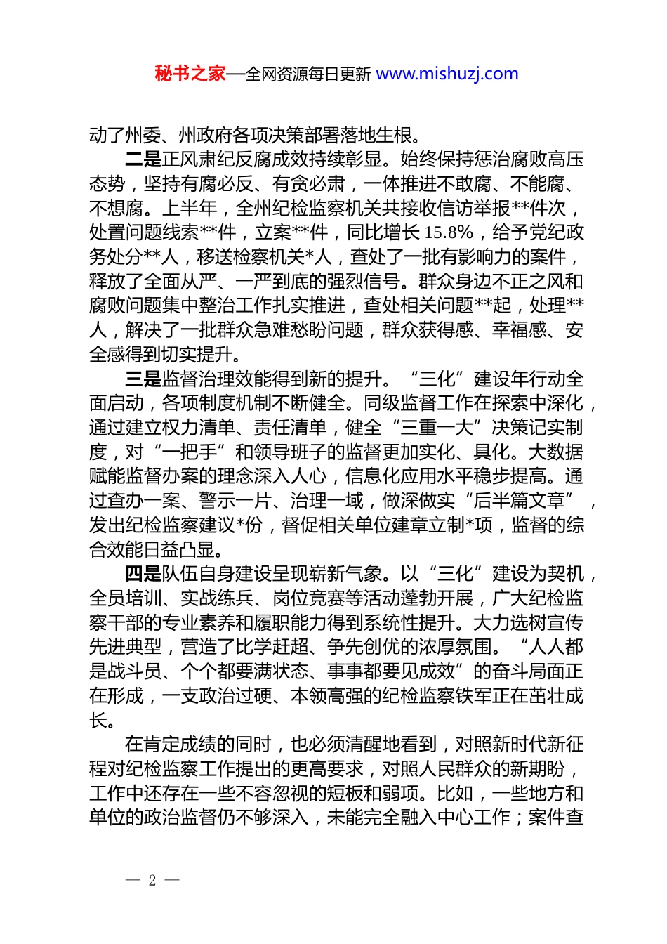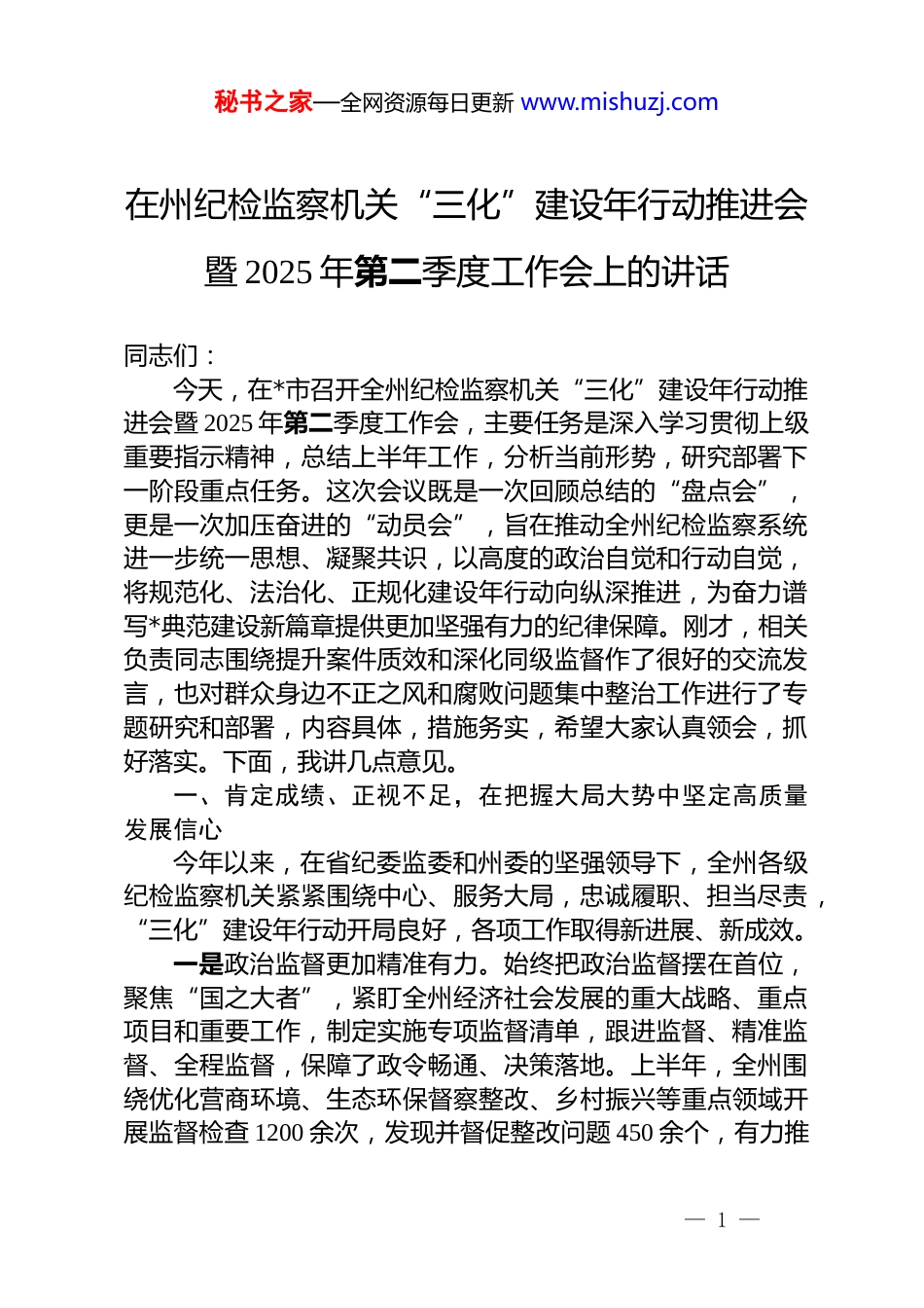 秘书之家—全网资源每日更新 www.mishuzj.com在州纪检监察机关“三化”建设年行动推进会暨 2025 年第二季度工作会上的讲话同志们:今天,在*市召开全州纪检监察机关“三化”建设年行动推进会暨 2025 年第二季度工作会,主要任务是深入学习贯彻上级重要指示精神,总结上半年工作,分析当前形势,研究部署下一阶段重点任务。这次会议既是一次回顾总结的“盘点会”,更是一次加压奋进的“动员会”,旨在推动全州纪检监察系统进一步统一思想、凝聚共识,以高度的政治自觉和行动自觉,将规范化、法治化、正规化建设年行动向纵深推进,为奋力谱写*典范建设新篇章提供更加坚强有力的纪律保障。刚才,相关负责同志围绕提升案件质效和深化同级监督作了很好的交流发言,也对群众身边不正之风和腐败问题集中整治工作进行了专题研究和部署,内容具体,措施务实,希望大家认真领会,抓好落实。下面,我讲几点意见。一、肯定成绩、正视不足,在把握大局大势中坚定高质量发展信心今年以来,在省纪委监委和州委的坚强领导下,全州各级纪检监察机关紧紧围绕中心、服务大局,忠诚履职、担当尽责,“三化”建设年行动开局良好,各项工作取得新进展、新成效。一是政治监督更加精准有力。始终把政治监督摆在首位,聚焦“国之大者”,紧盯全州经济社会发展的重大战略、重点项目和重要工作,制定实施专项监督清单,跟进监督、精准监督、全程监督,保障了政令畅通、决策落地。上半年,全州围绕优化营商环境、生态环保督察整改、乡村振兴等重点领域开展监督检查 1200 余次,发现并督促整改问题 450 余个,有力推— 1 —秘书之家—全网资源每日更新 www.mishuzj.com动了州委、州政府各项决策部署落地生根。二是正风肃纪反腐成效持续彰显。始终保持惩治腐败高压态势,坚持有腐必反、有贪必肃,一体推进不敢腐、不能腐、不想腐。上半年,全州纪检监察机关共接收信访举报**件次,处置问题线索**件,立案**件,同比增长 15.8%,给予党纪政务处分**人,移送检察机关*人,查处了一批有影响力的案件,释放了全面从严、一严到底的强烈信号。群众身边不正之风和腐败问题集中整治工作扎实推进,查处相关问题**起,处理**人,解决了一批群众急难愁盼问题,群众获得感、幸福感、安全感得到切实提升。三是监督治理效能得到新的提升。“三化”建设年行动全面启动,各项制度机制不断健全。同级监督工作在探索中深化,通过建立权力清单、责任清单,健全“三重一大”决策记实制度,对“一把手”和领导班子的监督更加实化、具化。大数据赋能监督办案的理念深入人心,信息化应用水平稳步提高。通过查办一案、警示一片、治理一域,做深做实“后半篇文章”,发出纪检监察建议*份,督促相关单位建章立制*项,监督的综合效能日益凸显。四是队伍自身建设呈现崭新气象。以“三化”建设为契机,全员培训、实战练兵、岗位竞赛等活动蓬勃开展,广大纪检监察干部的专业素养和履职能力得到系统性提升。大力选树宣传先进典型,营造了比学赶超、争先创优的浓厚氛围。“人人都是战斗员、个个都要满状态、事事都要见成效”的奋斗局面正在形成,一支政治过硬、本领高强的纪检监察铁军正在茁壮成长。在肯定成绩的同时,也必须清醒地看到,对照新时代新征程对纪检监察工作提出的更高要求,对照人民群众的新期盼,工作中还存在一些不容忽视的短板和弱项。比如,一些地方和单位的政治监督仍不够深入,未能完全融入中心工作;案件查— 2 —秘书之家—全网资源每日更新 www.mishuzj.com办的质效仍有提升空间,“室组地”联合办案的合力有待进一步增强;运用信息化、大数据等现代化手段开展监督执纪的能力还显不足,精准发现问题的能力需要加强;个别纪检监察干部斗争精神不足、斗争本领不强,存在不愿监督、不敢监督、不善监督的问题。对于这些问题,必须高度重视,坚持问题导向和效果导向,采取有力措施,切实加以解决。二、聚焦主业、精准发力,以“三化”建设新成效推动工作提档升级“三化”建设是贯穿全年工作的主线,是推动纪检监察工作高质量发展的总抓手。全州纪检监察机关必须牢牢牵住这个“牛鼻子”,坚持系统思维、精准理念、...