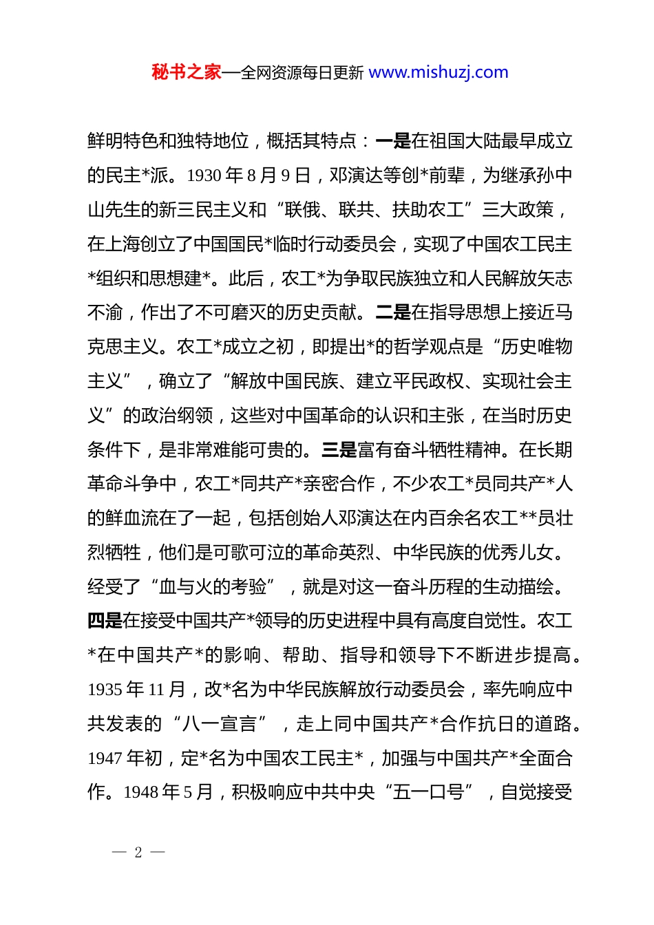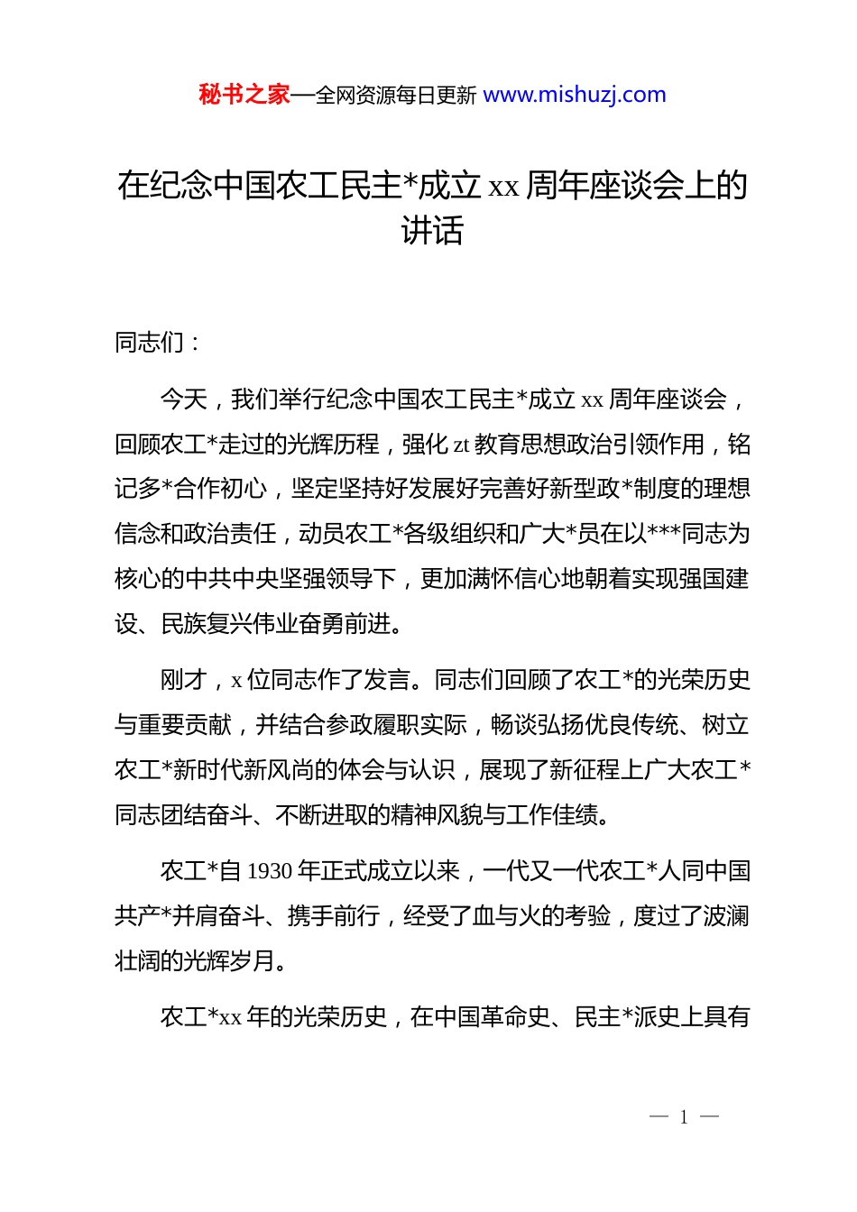 秘书之家—全网资源每日更新 www.mishuzj.com在纪念中国农工民主*成立 xx 周年座谈会上的讲话同志们:今天,我们举行纪念中国农工民主*成立 xx 周年座谈会,回顾农工*走过的光辉历程,强化 zt 教育思想政治引领作用,铭记多*合作初心,坚定坚持好发展好完善好新型政*制度的理想信念和政治责任,动员农工*各级组织和广大*员在以***同志为核心的中共中央坚强领导下,更加满怀信心地朝着实现强国建设、民族复兴伟业奋勇前进。刚才,x 位同志作了发言。同志们回顾了农工*的光荣历史与重要贡献,并结合参政履职实际,畅谈弘扬优良传统、树立农工*新时代新风尚的体会与认识,展现了新征程上广大农工*同志团结奋斗、不断进取的精神风貌与工作佳绩。农工*自 1930 年正式成立以来,一代又一代农工*人同中国共产*并肩奋斗、携手前行,经受了血与火的考验,度过了波澜壮阔的光辉岁月。农工*xx 年的光荣历史,在中国革命史、民主*派史上具有— 1 —秘书之家—全网资源每日更新 www.mishuzj.com鲜明特色和独特地位,概括其特点:一是在祖国大陆最早成立的民主*派。1930 年 8 月 9 日,邓演达等创*前辈,为继承孙中山先生的新三民主义和“联俄、联共、扶助农工”三大政策,在上海创立了中国国民*临时行动委员会,实现了中国农工民主*组织和思想建*。此后,农工*为争取民族独立和人民解放矢志不渝,作出了不可磨灭的历史贡献。二是在指导思想上接近马克思主义。农工*成立之初,即提出*的哲学观点是“历史唯物主义”,确立了“解放中国民族、建立平民政权、实现社会主义”的政治纲领,这些对中国革命的认识和主张,在当时历史条件下,是非常难能可贵的。三是富有奋斗牺牲精神。在长期革命斗争中,农工*同共产*亲密合作,不少农工*员同共产*人的鲜血流在了一起,包括创始人邓演达在内百余名农工**员壮烈牺牲,他们是可歌可泣的革命英烈、中华民族的优秀儿女。经受了“血与火的考验”,就是对这一奋斗历程的生动描绘。四是在接受中国共产*领导的历史进程中具有高度自觉性。农工*在中国共产*的影响、帮助、指导和领导下不断进步提高。1935 年 11 月,改*名为中华民族解放行动委员会,率先响应中共发表的“八一宣言”,走上同中国共产*合作抗日的道路。1947 年初,定*名为中国农工民主*,加强与中国共产*全面合作。1948 年 5 月,积极响应中共中央“五一口号”,自觉接受— 2 —秘书之家—全网资源每日更新 www.mishuzj.com中国共产*领导,参加新政协的筹备和新中国的筹建,庄严宣告:“从此以后,要立下宏愿,要永远跟随着共产*。”中华人民共和国的成立,开辟了中国历史的新纪元。农工*积极参加新中国建设工作,团结和推动广大*员投身中国共产*领导的社会主义革命和建设事业。进入改革开放和社会主义现代化建设的历史新时期,农工*把工作重点转移到为社会主义现代化建设服务上来,尤其是为推动我国医卫科教事业的发展做了大量卓有成效的工作,提出了扶持和振兴中药事业、实施“科技兴国”“西新工程”等建议,深入开展“同心助医工程”、智力支边扶贫和社会服务等工作,成为建设中国特色社会主义的重要力量。中共十八大以来,中国特色社会主义进入了新时代。农工*坚持以**************思想为引领,开展系列中国特色社会主义 zt 教育,继承弘扬优良传统,丰富政治交接内涵,全面加强自身建设;坚持建言资政和凝聚共识双向发力,为推进国家医药卫生体制改革、生态文明体制机制改革,助力打赢污染防治攻坚战,推进健康中国建设、美丽中国建设而不懈努力,为*和政府科学决策提供了重要参考;坚持服务社会助力民生,积极投身于伟大抗疫斗争,为全面建成小康社会作出了积极贡献。— 3 —秘书之家—全网资源每日更新 www.mishuzj.com农工*十七大以来,新一届领导班子认真学习贯彻中共二十大精神,确定了新时代新征程农工*的三大基本任务,即凝聚人心、汇聚力量的政治任务,履行职能、服务大局的履职任务,推进自身建设、赓续优良传统的自身建设任务,形成了以思想政治引领带动履职尽责和自身建设协同推进的总体工作思路,这是对******关于民主*派中央换届和在新时代新征程...