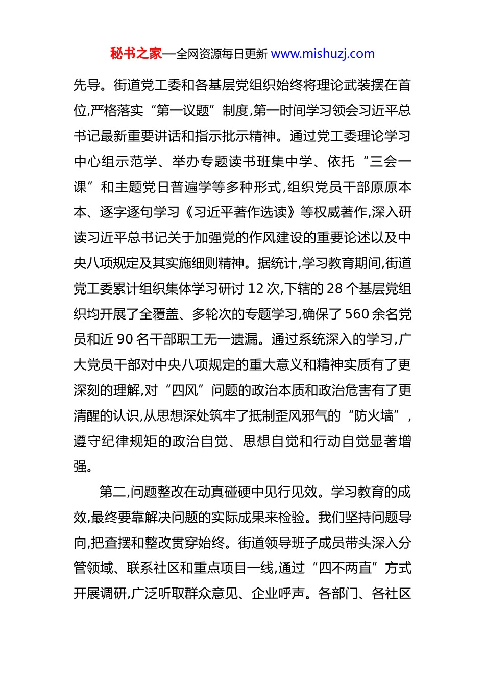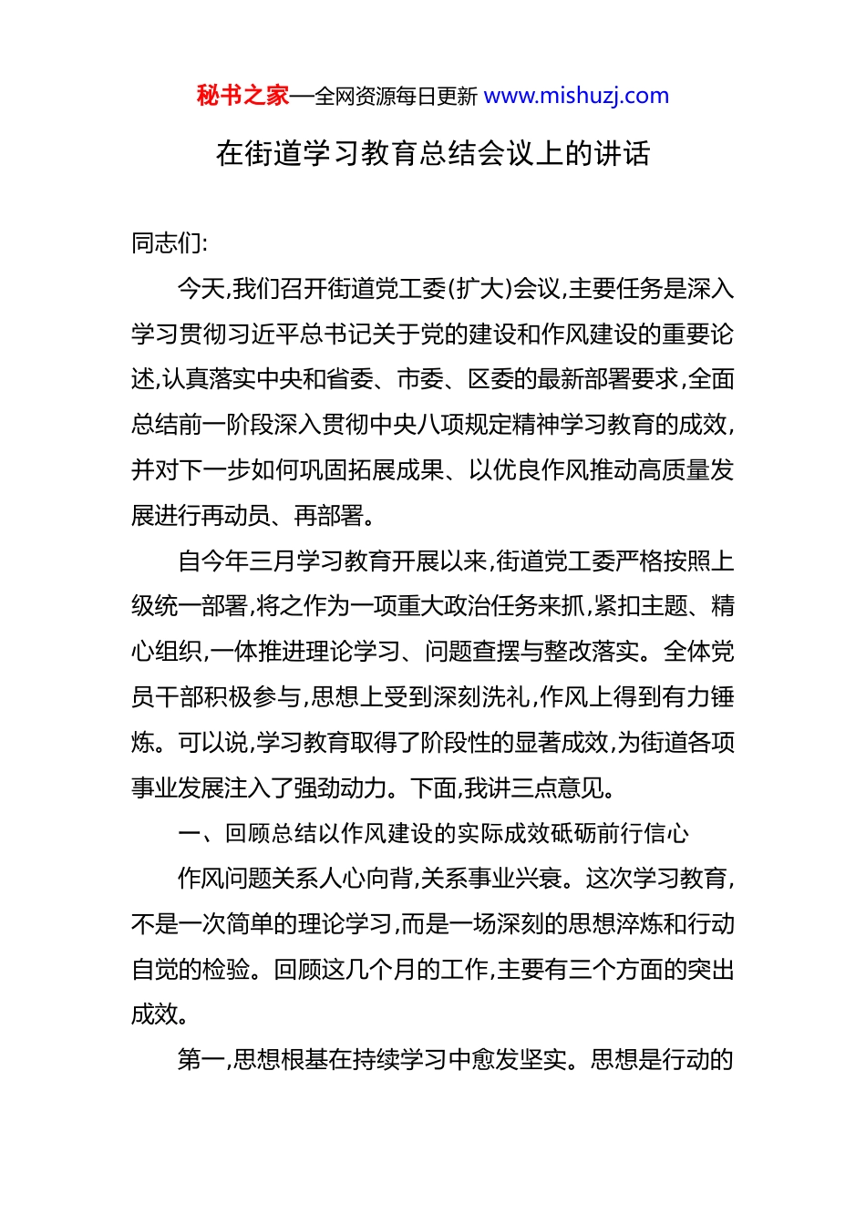 秘书之家—全网资源每日更新 www.mishuzj.com在街道学习教育总结会议上的讲话 同志们:今天,我们召开街道党工委(扩大)会议,主要任务是深入学习贯彻习近平总书记关于党的建设和作风建设的重要论述,认真落实中央和省委、市委、区委的最新部署要求,全面总结前一阶段深入贯彻中央八项规定精神学习教育的成效,并对下一步如何巩固拓展成果、以优良作风推动高质量发展进行再动员、再部署。自今年三月学习教育开展以来,街道党工委严格按照上级统一部署,将之作为一项重大政治任务来抓,紧扣主题、精心组织,一体推进理论学习、问题查摆与整改落实。全体党员干部积极参与,思想上受到深刻洗礼,作风上得到有力锤炼。可以说,学习教育取得了阶段性的显著成效,为街道各项事业发展注入了强劲动力。下面,我讲三点意见。一、回顾总结以作风建设的实际成效砥砺前行信心作风问题关系人心向背,关系事业兴衰。这次学习教育,不是一次简单的理论学习,而是一场深刻的思想淬炼和行动自觉的检验。回顾这几个月的工作,主要有三个方面的突出成效。第一,思想根基在持续学习中愈发坚实。思想是行动的秘书之家—全网资源每日更新 www.mishuzj.com先导。街道党工委和各基层党组织始终将理论武装摆在首位,严格落实“第一议题”制度,第一时间学习领会习近平总书记最新重要讲话和指示批示精神。通过党工委理论学习中心组示范学、举办专题读书班集中学、依托“三会一课”和主题党日普遍学等多种形式,组织党员干部原原本本、逐字逐句学习《习近平著作选读》等权威著作,深入研读习近平总书记关于加强党的作风建设的重要论述以及中央八项规定及其实施细则精神。据统计,学习教育期间,街道党工委累计组织集体学习研讨 12 次,下辖的 28 个基层党组织均开展了全覆盖、多轮次的专题学习,确保了 560 余名党员和近 90 名干部职工无一遗漏。通过系统深入的学习,广大党员干部对中央八项规定的重大意义和精神实质有了更深刻的理解,对“四风”问题的政治本质和政治危害有了更清醒的认识,从思想深处筑牢了抵制歪风邪气的“防火墙”,遵守纪律规矩的政治自觉、思想自觉和行动自觉显著增强。第二,问题整改在动真碰硬中见行见效。学习教育的成效,最终要靠解决问题的实际成果来检验。我们坚持问题导向,把查摆和整改贯穿始终。街道领导班子成员带头深入分管领域、联系社区和重点项目一线,通过“四不两直”方式开展调研,广泛听取群众意见、企业呼声。各部门、各社区秘书之家—全网资源每日更新 www.mishuzj.com聚焦形式主义、官僚主义的新动向新表现,聚焦群众反映强烈的急难愁盼问题,聚焦制约高质量发展的堵点难点,全面开展自查自纠。我们建立问题、任务、责任“三张清单”,共梳理出涉及文山会海、检查考核过多过滥、服务群众“中梗阻”、担当作为不够等 6 大类 60 余个具体问题。针对这些问题,我们逐一明确整改时限、责任单位和责任人,实行销号管理、动态清零。截至目前,已有超过 95%的问题得到彻底整改,其余长期性任务也已制定了持续推进的方案。比如,我们大力精简文件、会议,今年以来街道层面的会议数量同比减少了 20%,文件数量减少了 15%;再比如,针对部分窗口单位服务效率不高的问题,我们通过优化流程、推行“云端”帮办代办服务,群众办事平均用时缩短了 30%以上,满意度显著提升。这种刀刃向内、真查实改的举措,让干部受到了教育,也让群众看到了变化。第三,作风转变在服务大局中驱动发展。检验作风建设成效的最终标准,是看是否推动了中心工作、促进了高质量发展。我们始终坚持围绕中心、服务大局,把学习教育激发的昂扬斗志和务实作风,转化为攻坚克难、干事创业的强大动力。今年以来,全街道上下紧紧围绕区委提出的当好“六个共富”排头兵的目标要求,全力推进“一个中心、三个支撑”活动,以作风的根本性转变,推动各项工作取得突破性进秘书之家—全网资源每日更新 www.mishuzj.com展。在民生服务领域,我们以“办实事、解民忧”为出发点,破解了一批历史遗留难题。面对电动自行车“飞线充电”的严重安全隐患,我们的干部没有回避矛盾,而是主动作为、靠前服务,深入 14 个小区进行勘察、协调,最终在今年上半年全面完成 1234 ...