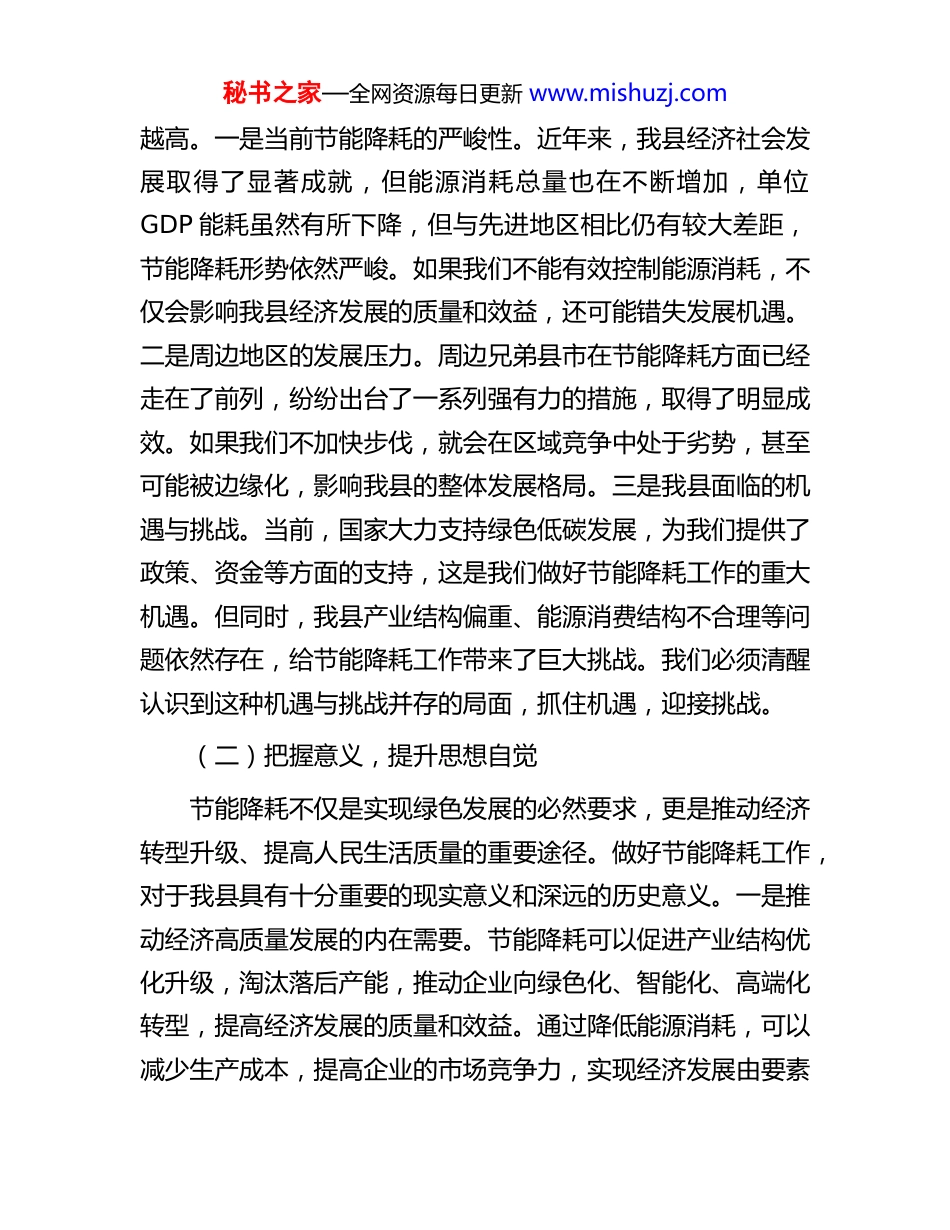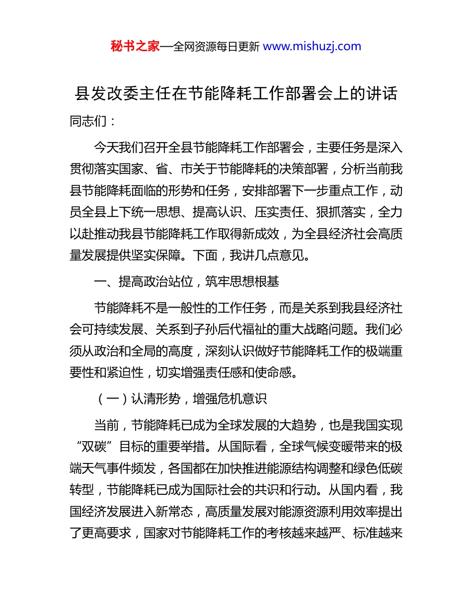 秘书之家—全网资源每日更新 www.mishuzj.com县发改委主任在节能降耗工作部署会上的讲话同志们:今天我们召开全县节能降耗工作部署会,主要任务是深入贯彻落实国家、省、市关于节能降耗的决策部署,分析当前我县节能降耗面临的形势和任务,安排部署下一步重点工作,动员全县上下统一思想、提高认识、压实责任、狠抓落实,全力以赴推动我县节能降耗工作取得新成效,为全县经济社会高质量发展提供坚实保障。下面,我讲几点意见。一、提高政治站位,筑牢思想根基节能降耗不是一般性的工作任务,而是关系到我县经济社会可持续发展、关系到子孙后代福祉的重大战略问题。我们必须从政治和全局的高度,深刻认识做好节能降耗工作的极端重要性和紧迫性,切实增强责任感和使命感。(一)认清形势,增强危机意识当前,节能降耗已成为全球发展的大趋势,也是我国实现“双碳”目标的重要举措。从国际看,全球气候变暖带来的极端天气事件频发,各国都在加快推进能源结构调整和绿色低碳转型,节能降耗已成为国际社会的共识和行动。从国内看,我国经济发展进入新常态,高质量发展对能源资源利用效率提出了更高要求,国家对节能降耗工作的考核越来越严、标准越来秘书之家—全网资源每日更新 www.mishuzj.com越高。一是当前节能降耗的严峻性。近年来,我县经济社会发展取得了显著成就,但能源消耗总量也在不断增加,单位GDP 能耗虽然有所下降,但与先进地区相比仍有较大差距,节能降耗形势依然严峻。如果我们不能有效控制能源消耗,不仅会影响我县经济发展的质量和效益,还可能错失发展机遇。二是周边地区的发展压力。周边兄弟县市在节能降耗方面已经走在了前列,纷纷出台了一系列强有力的措施,取得了明显成效。如果我们不加快步伐,就会在区域竞争中处于劣势,甚至可能被边缘化,影响我县的整体发展格局。三是我县面临的机遇与挑战。当前,国家大力支持绿色低碳发展,为我们提供了政策、资金等方面的支持,这是我们做好节能降耗工作的重大机遇。但同时,我县产业结构偏重、能源消费结构不合理等问题依然存在,给节能降耗工作带来了巨大挑战。我们必须清醒认识到这种机遇与挑战并存的局面,抓住机遇,迎接挑战。(二)把握意义,提升思想自觉节能降耗不仅是实现绿色发展的必然要求,更是推动经济转型升级、提高人民生活质量的重要途径。做好节能降耗工作,对于我县具有十分重要的现实意义和深远的历史意义。一是推动经济高质量发展的内在需要。节能降耗可以促进产业结构优化升级,淘汰落后产能,推动企业向绿色化、智能化、高端化转型,提高经济发展的质量和效益。通过降低能源消耗,可以减少生产成本,提高企业的市场竞争力,实现经济发展由要素秘书之家—全网资源每日更新 www.mishuzj.com驱动向创新驱动转变。二是改善生态环境的重要举措。能源消耗带来的环境污染问题日益突出,影响着人民群众的身体健康和生活质量。节能降耗可以减少污染物排放,改善空气质量和生态环境,让人民群众享受到更优美的环境、更清新的空气,提升幸福感和获得感。三是保障能源安全的战略选择。我县能源资源相对匮乏,对外依存度较高,能源安全问题不容忽视。通过节能降耗,可以减少能源消耗,降低对外部能源的依赖,提高能源自给率,保障我县能源安全。四是践行绿色发展理念的具体行。绿色发展是新时代发展的必然选择,节能降耗是践行绿色发展理念的具体体现。我们要树立和践行绿水青山就是金山银山的理念,把节能降耗贯穿于经济社会发展的全过程和各领域,推动形成绿色低碳的生产生活方式。(三)统一思想,凝聚发展共识做好节能降耗工作,需要全县上下统一思想、形成共识。各级各部门、各企业要深刻认识到,节能降耗不是限制发展,而是为了更好地发展;不是短期行为,而是长期任务。一是摒弃错误观念。要坚决摒弃“重发展、轻环保”“先污染、后治理”的错误观念,克服“节能降耗影响经济增长”的片面认识。要认识到节能降耗与经济发展是相辅相成、相互促进的,只有实现绿色低碳发展,才能实现经济的可持续增长。二是树立正确导向。要树立绿色发展、循环发展、低碳发展的理念,把节能降耗作为衡量经济发展质量和...