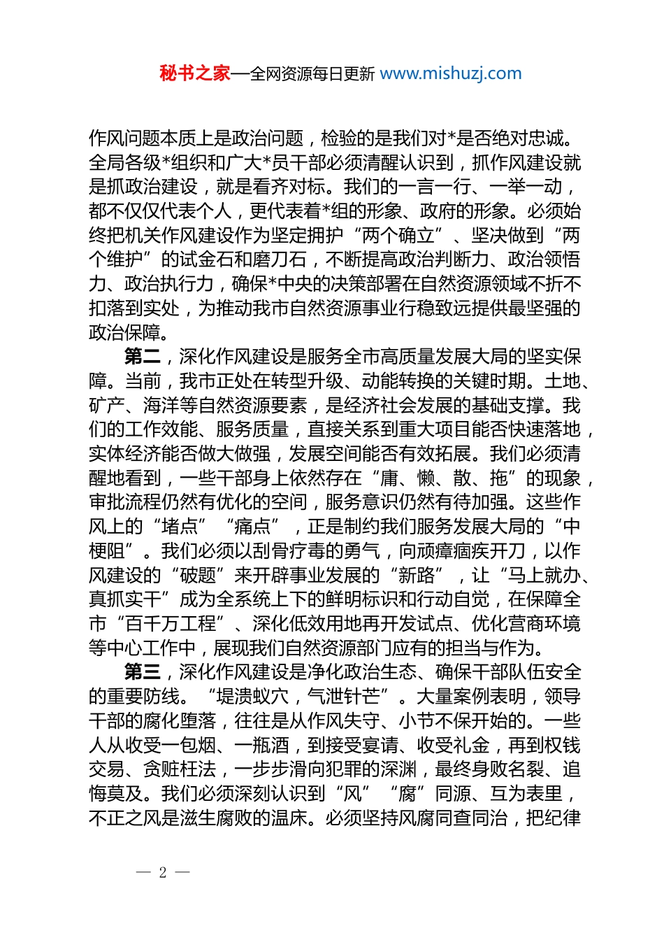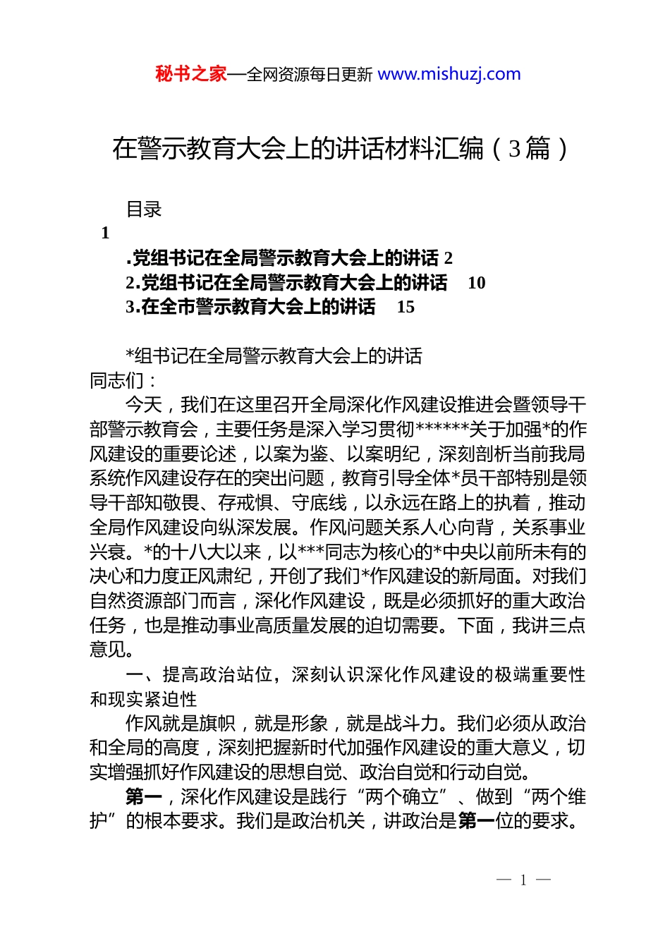 秘书之家—全网资源每日更新 www.mishuzj.com在警示教育大会上的讲话材料汇编(3 篇)目录1.党组书记在全局警示教育大会上的讲话 22.党组书记在全局警示教育大会上的讲话103.在全市警示教育大会上的讲话15*组书记在全局警示教育大会上的讲话同志们:今天,我们在这里召开全局深化作风建设推进会暨领导干部警示教育会,主要任务是深入学习贯彻******关于加强*的作风建设的重要论述,以案为鉴、以案明纪,深刻剖析当前我局系统作风建设存在的突出问题,教育引导全体*员干部特别是领导干部知敬畏、存戒惧、守底线,以永远在路上的执着,推动全局作风建设向纵深发展。作风问题关系人心向背,关系事业兴衰。*的十八大以来,以***同志为核心的*中央以前所未有的决心和力度正风肃纪,开创了我们*作风建设的新局面。对我们自然资源部门而言,深化作风建设,既是必须抓好的重大政治任务,也是推动事业高质量发展的迫切需要。下面,我讲三点意见。一、提高政治站位,深刻认识深化作风建设的极端重要性和现实紧迫性作风就是旗帜,就是形象,就是战斗力。我们必须从政治和全局的高度,深刻把握新时代加强作风建设的重大意义,切实增强抓好作风建设的思想自觉、政治自觉和行动自觉。第一,深化作风建设是践行“两个确立”、做到“两个维护”的根本要求。我们是政治机关,讲政治是第一位的要求。— 1 —秘书之家—全网资源每日更新 www.mishuzj.com作风问题本质上是政治问题,检验的是我们对*是否绝对忠诚。全局各级*组织和广大*员干部必须清醒认识到,抓作风建设就是抓政治建设,就是看齐对标。我们的一言一行、一举一动,都不仅仅代表个人,更代表着*组的形象、政府的形象。必须始终把机关作风建设作为坚定拥护“两个确立”、坚决做到“两个维护”的试金石和磨刀石,不断提高政治判断力、政治领悟力、政治执行力,确保*中央的决策部署在自然资源领域不折不扣落到实处,为推动我市自然资源事业行稳致远提供最坚强的政治保障。第二,深化作风建设是服务全市高质量发展大局的坚实保障。当前,我市正处在转型升级、动能转换的关键时期。土地、矿产、海洋等自然资源要素,是经济社会发展的基础支撑。我们的工作效能、服务质量,直接关系到重大项目能否快速落地,实体经济能否做大做强,发展空间能否有效拓展。我们必须清醒地看到,一些干部身上依然存在“庸、懒、散、拖”的现象,审批流程仍然有优化的空间,服务意识仍然有待加强。这些作风上的“堵点”“痛点”,正是制约我们服务发展大局的“中梗阻”。我们必须以刮骨疗毒的勇气,向顽瘴痼疾开刀,以作风建设的“破题”来开辟事业发展的“新路”,让“马上就办、真抓实干”成为全系统上下的鲜明标识和行动自觉,在保障全市“百千万工程”、深化低效用地再开发试点、优化营商环境等中心工作中,展现我们自然资源部门应有的担当与作为。第三,深化作风建设是净化政治生态、确保干部队伍安全的重要防线。“堤溃蚁穴,气泄针芒”。大量案例表明,领导干部的腐化堕落,往往是从作风失守、小节不保开始的。一些人从收受一包烟、一瓶酒,到接受宴请、收受礼金,再到权钱交易、贪赃枉法,一步步滑向犯罪的深渊,最终身败名裂、追悔莫及。我们必须深刻认识到“风”“腐”同源、互为表里,不正之风是滋生腐败的温床。必须坚持风腐同查同治,把纪律— 2 —秘书之家—全网资源每日更新 www.mishuzj.com和规矩挺在前面,抓早抓小、防微杜渐,对苗头性、倾向性问题及时提醒、坚决纠正。只有守好小事小节,才能筑牢拒腐防变的第一道防线,才能营造风清气正的政治生态,才能真正保护我们的干部,确保大家干成事、不出事。二、以案为鉴、以案明纪,深刻汲取反面典型的惨痛教训刚才,我们集中观看了警示教育片。片中的案例,特别是发生在我们身边的、系统内的案例,触目惊心、发人深省。这些反面典型,曾经也是组织的重点培养对象,手握*和人民赋予的权力,却在贪欲和私心的驱使下,迷失了方向,突破了底线,最终沦为阶下囚。他们用自己惨痛的经历,为我们敲响了长鸣的警钟。原局*组成员、副局长 xx,本应是全局干部学习的榜样,但他丧失理想信念,背弃初...