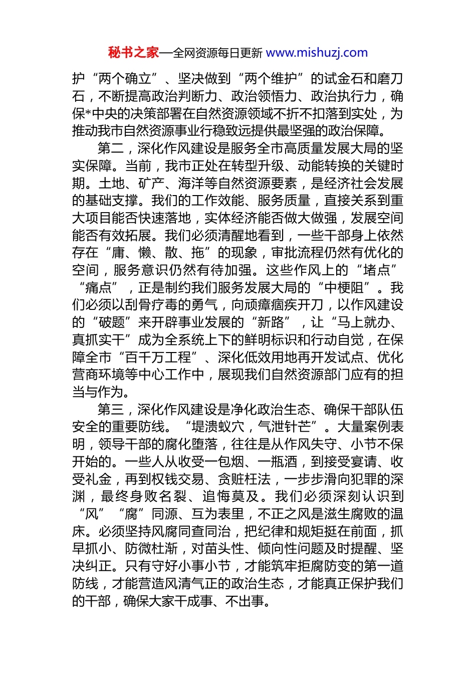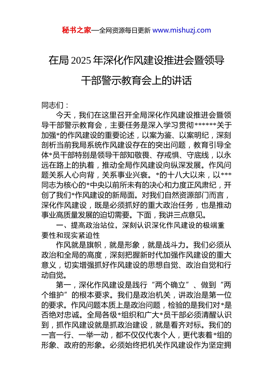 秘书之家—全网资源每日更新 www.mishuzj.com在局 2025 年深化作风建设推进会暨领导干部警示教育会上的讲话同志们:今天,我们在这里召开全局深化作风建设推进会暨领导干部警示教育会,主要任务是深入学习贯彻******关于加强*的作风建设的重要论述,以案为鉴、以案明纪,深刻剖析当前我局系统作风建设存在的突出问题,教育引导全体*员干部特别是领导干部知敬畏、存戒惧、守底线,以永远在路上的执着,推动全局作风建设向纵深发展。作风问题关系人心向背,关系事业兴衰。*的十八大以来,以***同志为核心的*中央以前所未有的决心和力度正风肃纪,开创了我们*作风建设的新局面。对我们自然资源部门而言,深化作风建设,既是必须抓好的重大政治任务,也是推动事业高质量发展的迫切需要。下面,我讲三点意见。一、提高政治站位,深刻认识深化作风建设的极端重要性和现实紧迫性作风就是旗帜,就是形象,就是战斗力。我们必须从政治和全局的高度,深刻把握新时代加强作风建设的重大意义,切实增强抓好作风建设的思想自觉、政治自觉和行动自觉。第一,深化作风建设是践行“两个确立”、做到“两个维护”的根本要求。我们是政治机关,讲政治是第一位的要求。作风问题本质上是政治问题,检验的是我们对*是否绝对忠诚。全局各级*组织和广大*员干部必须清醒认识到,抓作风建设就是抓政治建设,就是看齐对标。我们的一言一行、一举一动,都不仅仅代表个人,更代表着*组的形象、政府的形象。必须始终把机关作风建设作为坚定拥秘书之家—全网资源每日更新 www.mishuzj.com护“两个确立”、坚决做到“两个维护”的试金石和磨刀石,不断提高政治判断力、政治领悟力、政治执行力,确保*中央的决策部署在自然资源领域不折不扣落到实处,为推动我市自然资源事业行稳致远提供最坚强的政治保障。第二,深化作风建设是服务全市高质量发展大局的坚实保障。当前,我市正处在转型升级、动能转换的关键时期。土地、矿产、海洋等自然资源要素,是经济社会发展的基础支撑。我们的工作效能、服务质量,直接关系到重大项目能否快速落地,实体经济能否做大做强,发展空间能否有效拓展。我们必须清醒地看到,一些干部身上依然存在“庸、懒、散、拖”的现象,审批流程仍然有优化的空间,服务意识仍然有待加强。这些作风上的“堵点”“痛点”,正是制约我们服务发展大局的“中梗阻”。我们必须以刮骨疗毒的勇气,向顽瘴痼疾开刀,以作风建设的“破题”来开辟事业发展的“新路”,让“马上就办、真抓实干”成为全系统上下的鲜明标识和行动自觉,在保障全市“百千万工程”、深化低效用地再开发试点、优化营商环境等中心工作中,展现我们自然资源部门应有的担当与作为。第三,深化作风建设是净化政治生态、确保干部队伍安全的重要防线。“堤溃蚁穴,气泄针芒”。大量案例表明,领导干部的腐化堕落,往往是从作风失守、小节不保开始的。一些人从收受一包烟、一瓶酒,到接受宴请、收受礼金,再到权钱交易、贪赃枉法,一步步滑向犯罪的深渊,最终身败名裂、追悔莫及。我们必须深刻认识到“风”“腐”同源、互为表里,不正之风是滋生腐败的温床。必须坚持风腐同查同治,把纪律和规矩挺在前面,抓早抓小、防微杜渐,对苗头性、倾向性问题及时提醒、坚决纠正。只有守好小事小节,才能筑牢拒腐防变的第一道防线,才能营造风清气正的政治生态,才能真正保护我们的干部,确保大家干成事、不出事。秘书之家—全网资源每日更新 www.mishuzj.com二、以案为鉴、以案明纪,深刻汲取反面典型的惨痛教训刚才,我们集中观看了警示教育片。片中的案例,特别是发生在我们身边的、系统内的案例,触目惊心、发人深省。这些反面典型,曾经也是组织的重点培养对象,手握*和人民赋予的权力,却在贪欲和私心的驱使下,迷失了方向,突破了底线,最终沦为阶下囚。他们用自己惨痛的经历,为我们敲响了长鸣的警钟。原局*组成员、副局长 xx,本应是全局干部学习的榜样,但他丧失理想信念,背弃初心使命,对*不忠诚不老实,长期搞迷信活动,沉迷于求神拜佛,完全丧失了共产*员应有的政治觉悟。他无视纪律规定,大肆收受礼金,利用职权为他人在获得用...