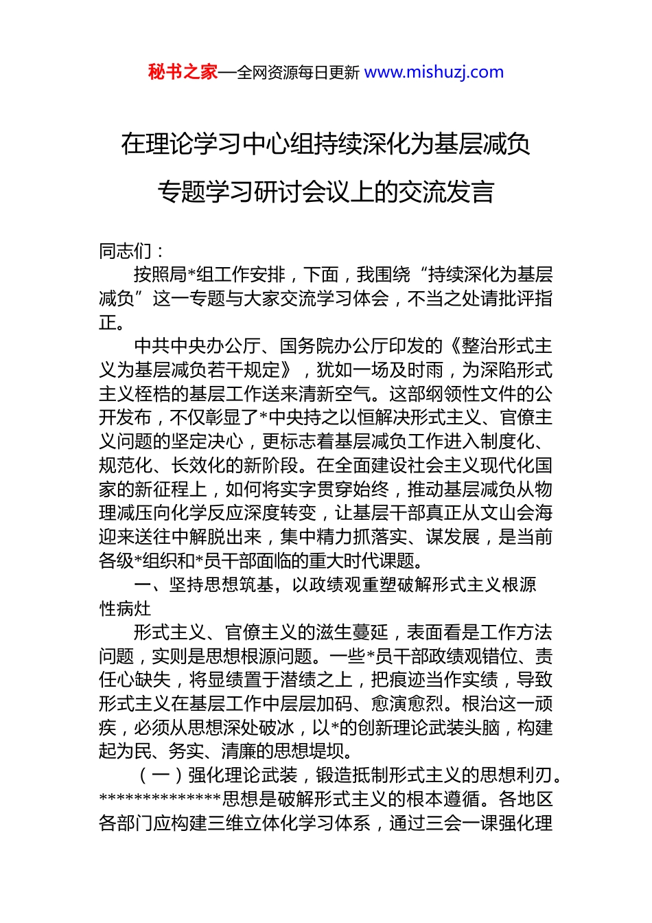 秘书之家—全网资源每日更新 www.mishuzj.com在理论学习中心组持续深化为基层减负专题学习研讨会议上的交流发言同志们:按照局*组工作安排,下面,我围绕“持续深化为基层减负”这一专题与大家交流学习体会,不当之处请批评指正。中共中央办公厅、国务院办公厅印发的《整治形式主义为基层减负若干规定》,犹如一场及时雨,为深陷形式主义桎梏的基层工作送来清新空气。这部纲领性文件的公开发布,不仅彰显了*中央持之以恒解决形式主义、官僚主义问题的坚定决心,更标志着基层减负工作进入制度化、规范化、长效化的新阶段。在全面建设社会主义现代化国家的新征程上,如何将实字贯穿始终,推动基层减负从物理减压向化学反应深度转变,让基层干部真正从文山会海迎来送往中解脱出来,集中精力抓落实、谋发展,是当前各级*组织和*员干部面临的重大时代课题。一、坚持思想筑基,以政绩观重塑破解形式主义根源性病灶形式主义、官僚主义的滋生蔓延,表面看是工作方法问题,实则是思想根源问题。一些*员干部政绩观错位、责任心缺失,将显绩置于潜绩之上,把痕迹当作实绩,导致形式主义在基层工作中层层加码、愈演愈烈。根治这一顽疾,必须从思想深处破冰,以*的创新理论武装头脑,构建起为民、务实、清廉的思想堤坝。(一)强化理论武装,锻造抵制形式主义的思想利刃。**************思想是破解形式主义的根本遵循。各地区各部门应构建三维立体化学习体系,通过三会一课强化理秘书之家—全网资源每日更新 www.mishuzj.com论灌输,原原本本学习《***谈治国理政》中关于力戒形式主义的重要论述;依托红色教育基地开展沉浸式情景教学让*员干部在延安整风精神、焦裕禄精神等红色基因中感悟求真务实的深刻内涵;运用 vr 技术还原脱贫攻坚中的形式主义典型案例,通过虚拟实践增强警示效果。某省开展的理论溯源活动,组织*员干部重走******考察调研路线,在半条被子故事发生地召开现场研讨会,使以人民为中心的发展思想从抽象理论转化为具体行动自觉。(二)树牢正确政绩观,强化功成不必在我的境界担当。畸形政绩观是催生形式主义的温床。要通过三破三立重塑价值导向,破除数字政绩迷思,树立群众满意标尺,将民生改善、生态保护等长效指标纳入考核;打破短期效应思维,建立潜绩认定机制,对招商引资项目落地率、人才引进留存率等设置三年周期考核;爆破材料政绩泡沫,推行无台账考核试点,在乡村振兴工作中仅保留产业发展实际成效等核心指标。某市推行的民生实事票决制,由群众代表对政府工作报告中的民生项目进行现场投票,倒逼干部把精力放在解决学位、床位、车位等群众急难愁盼问题上。(三)聚焦能力提升,培育真抓实干的过硬本领。本领恐慌往往导致形式主义应对。应构建靶向式能力提升体系,开设基层夜校,围绕群众工作方法、突发事件处置等实用技能开展模块化培训;建立导师帮带制,安排乡镇*政正职与年轻干部结对,传授从群众中来,到群众中去的工作经验;开展蹲点调研月活动,要求机关干部每年至少 30天吃住在村,完成民情日记 100 篇、解决实事 20 件的硬指标。某县组织的田间地头办公会,让农业农村局干部带着土壤检测设备驻村,现场解决大棚种植技术难题,既提升了专业能力,又密切了*群关系。二、坚持靶向施治,以系统思维破解形式主义显性化难题秘书之家—全网资源每日更新 www.mishuzj.com文山会海、过度留痕、频繁检查等显性形式主义,如同套在基层干部身上的多重复合镣铐。必须坚持问题导向运用系统思维进行全方位、多角度、深层次治理,让基层干部从事务主义中解脱出来,释放干事创业的内生动力。(一)推动会议文件减量提质,破解以会议落实会议的恶性循环。精文简会不是简单做减法,而是要实现质效革命。应建立三审三查机制,实行会议计划审批制,由*委办公室对会议主题、时长、参会范围进行预审,同比减少30%以上;推行文件负面清单管理,明确可发可不发的一律不发等 10 类禁发情形,某省 2023 年文件数量同比下降42%;开发智能会务平台,实现会议材料云端共享、意见实时反馈,将平均会议时长压缩至 45 分钟以内。更关键的是转变会议模式,推广现场办公会制度...
