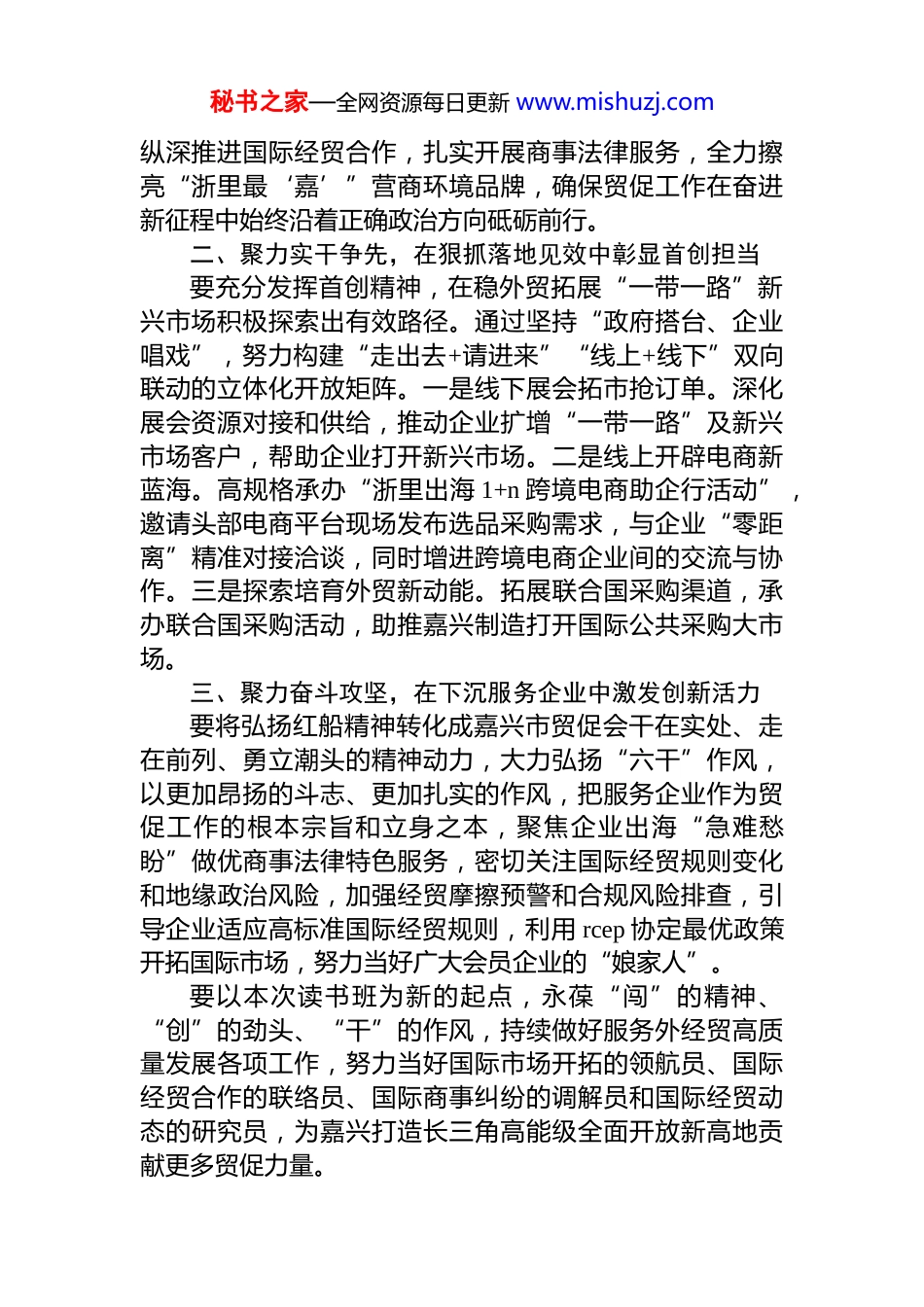秘书之家—全网资源每日更新 www.mishuzj.com在贸促系统集中读书班上的交流发言材料汇编(5 篇)目录1.深耕“一带一路”拓市场奋斗攻坚护航稳外贸....................22.感悟精神之源谱写贸促新篇..................................................43.传承红船精神汲取奋进力量..................................................64.青春何为青春能为青春有为..................................................85.不忘初心做一名勤廉奉献的贸促人....................................10深耕“一带一路”拓市场奋斗攻坚护航稳外贸本次读书班是一次思想的再充电、精神的再淬炼、使命的再升华。一、提高政治站位,在深化理论武装中校准思想之舵要把理论学习成果转化为实际行动的指南,始终胸怀“国之大者”,深刻理解推进高水平对外开放的重要意义充分发挥“联通政企、融通内外、畅通供需”的功能作用立足贸促职能,找准履职着力点,全面服务稳外贸拓市场秘书之家—全网资源每日更新 www.mishuzj.com纵深推进国际经贸合作,扎实开展商事法律服务,全力擦亮“浙里最‘嘉’”营商环境品牌,确保贸促工作在奋进新征程中始终沿着正确政治方向砥砺前行。二、聚力实干争先,在狠抓落地见效中彰显首创担当要充分发挥首创精神,在稳外贸拓展“一带一路”新兴市场积极探索出有效路径。通过坚持“政府搭台、企业唱戏”,努力构建“走出去+请进来”“线上+线下”双向联动的立体化开放矩阵。一是线下展会拓市抢订单。深化展会资源对接和供给,推动企业扩增“一带一路”及新兴市场客户,帮助企业打开新兴市场。二是线上开辟电商新蓝海。高规格承办“浙里出海 1+n 跨境电商助企行活动”,邀请头部电商平台现场发布选品采购需求,与企业“零距离”精准对接洽谈,同时增进跨境电商企业间的交流与协作。三是探索培育外贸新动能。拓展联合国采购渠道,承办联合国采购活动,助推嘉兴制造打开国际公共采购大市场。三、聚力奋斗攻坚,在下沉服务企业中激发创新活力要将弘扬红船精神转化成嘉兴市贸促会干在实处、走在前列、勇立潮头的精神动力,大力弘扬“六干”作风,以更加昂扬的斗志、更加扎实的作风,把服务企业作为贸促工作的根本宗旨和立身之本,聚焦企业出海“急难愁盼”做优商事法律特色服务,密切关注国际经贸规则变化和地缘政治风险,加强经贸摩擦预警和合规风险排查,引导企业适应高标准国际经贸规则,利用 rcep 协定最优政策开拓国际市场,努力当好广大会员企业的“娘家人”。要以本次读书班为新的起点,永葆“闯”的精神、“创”的劲头、“干”的作风,持续做好服务外经贸高质量发展各项工作,努力当好国际市场开拓的领航员、国际经贸合作的联络员、国际商事纠纷的调解员和国际经贸动态的研究员,为嘉兴打造长三角高能级全面开放新高地贡献更多贸促力量。秘书之家—全网资源每日更新 www.mishuzj.com感悟精神之源谱写贸促新篇通过学习,汲取干事创业的力量,赓续为国为民的革命初心和赤子情怀。一、传承红船精神,淬炼*性修养红船精神是砥砺前行的精神源泉。一是要以“开天辟地”的魄力锻造政治品格。传承敢为人先的政治勇气,彰显贸促担当,谱写贸促新篇。二是要以“百折不挠”的韧性磨砺理想信念。时刻保持政治定力,坚定理想信念,永葆共产*员的政治本色。三是要以“忠诚为民”的初心厚植公仆情怀。聚焦企业需求和关切,帮助企业开展对外合作解决其痛点难点问题,助力企业长远发展。二、践行贸促使命,服务中心大局一是建设外联网络,夯实工作基础。从五个层面织大、织密、织紧外联网络,把网络从“建起来”、“用起来”向“强起来”推进。二是聚焦企业需求,提升活动质效。始终以促进经济发展和企业需求为导向,积极发挥网络优势、平台优势、经验优势,加强资源整合,持续打造活动品牌,做出实效,切实提高企业获得感。三是坚持守正创新,打造特色亮点。继续提升创新意识,在工作举措、方式方法、标准流程等各个方面努力谋求新突破。三、弘扬六干作风,提升履职能力一是练好工作本领。树立终身学习的理念,既要系统学习*的理论知识,也要潜心钻研业务。加强“国际交流先锋”...