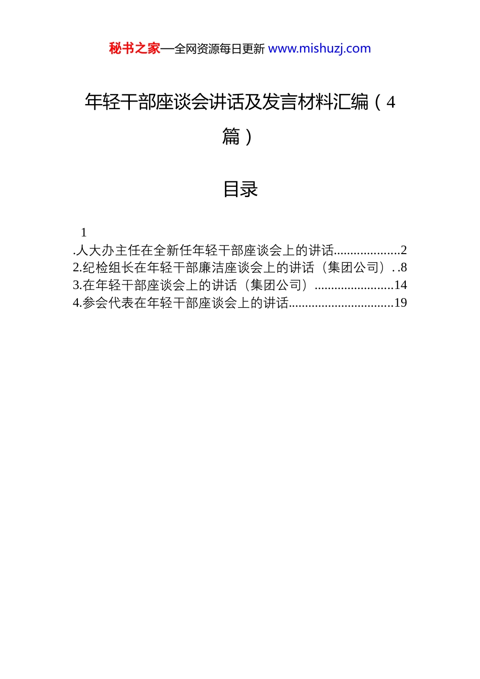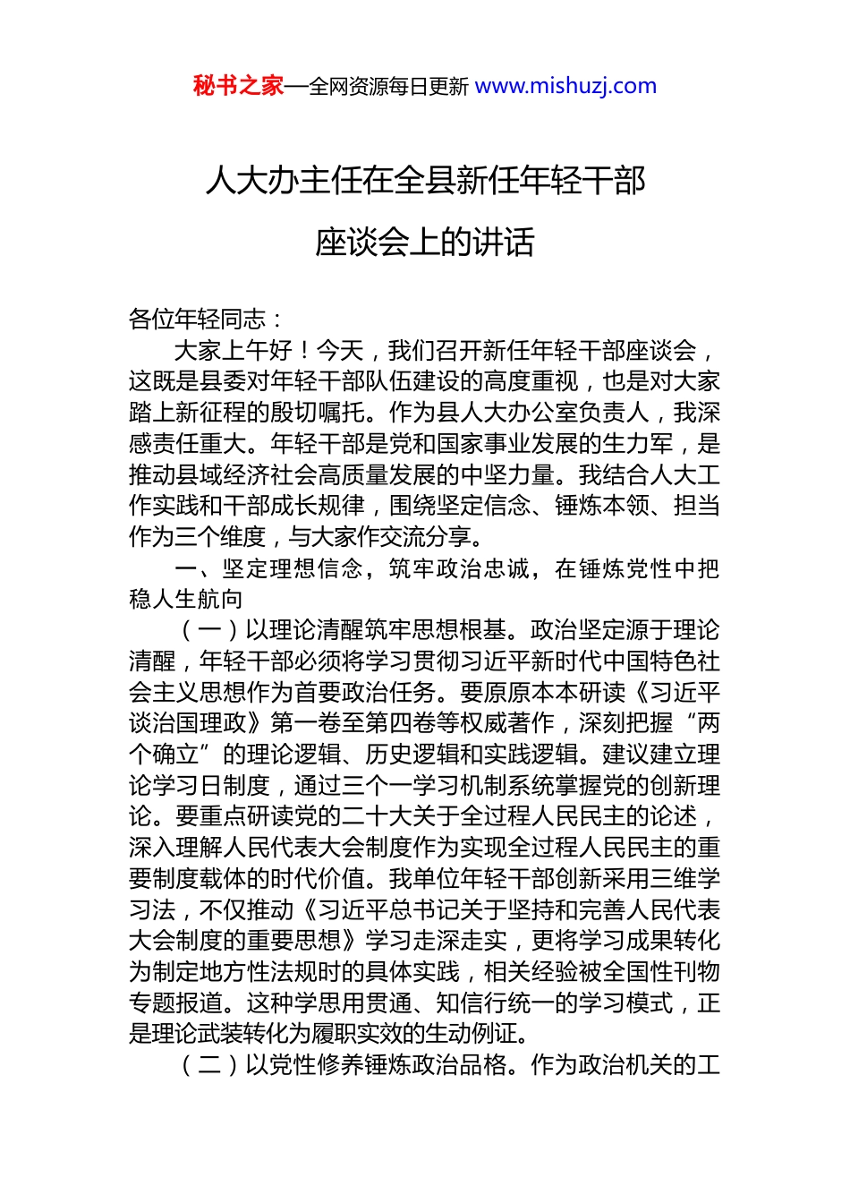 秘书之家—全网资源每日更新 www.mishuzj.com年轻干部座谈会讲话及发言材料汇编(4篇)目录1.人大办主任在全县新任年轻干部座谈会上的讲话....................22.纪检组长在年轻干部廉洁座谈会上的讲话(集团公司). .83.在年轻干部座谈会上的讲话(集团公司)........................144.参会代表在年轻干部座谈会上的讲话................................19秘书之家—全网资源每日更新 www.mishuzj.com人大办主任在全县新任年轻干部座谈会上的讲话各位年轻同志:大家上午好!今天,我们召开新任年轻干部座谈会,这既是县委对年轻干部队伍建设的高度重视,也是对大家踏上新征程的殷切嘱托。作为县人大办公室负责人,我深感责任重大。年轻干部是党和国家事业发展的生力军,是推动县域经济社会高质量发展的中坚力量。我结合人大工作实践和干部成长规律,围绕坚定信念、锤炼本领、担当作为三个维度,与大家作交流分享。一、坚定理想信念,筑牢政治忠诚,在锤炼党性中把稳人生航向(一)以理论清醒筑牢思想根基。政治坚定源于理论清醒,年轻干部必须将学习贯彻习近平新时代中国特色社会主义思想作为首要政治任务。要原原本本研读《习近平谈治国理政》第一卷至第四卷等权威著作,深刻把握“两个确立”的理论逻辑、历史逻辑和实践逻辑。建议建立理论学习日制度,通过三个一学习机制系统掌握党的创新理论。要重点研读党的二十大关于全过程人民民主的论述,深入理解人民代表大会制度作为实现全过程人民民主的重要制度载体的时代价值。我单位年轻干部创新采用三维学习法,不仅推动《习近平总书记关于坚持和完善人民代表大会制度的重要思想》学习走深走实,更将学习成果转化为制定地方性法规时的具体实践,相关经验被全国性刊物专题报道。这种学思用贯通、知信行统一的学习模式,正是理论武装转化为履职实效的生动例证。(二)以党性修养锤炼政治品格。作为政治机关的工秘书之家—全网资源每日更新 www.mishuzj.com作人员,年轻干部必须把政治建设作为生命线。要严格落实“第一议题”制度,建立学习、体检、整改闭环机制,及时跟进学习习近平总书记最新讲话精神,对照党章党规开展“政治体检”,建立问题台账限期整改。在具体工作中,要善于从政治角度分析业务问题,开展执法检查时,既要核查法律条文执行情况,更要审视是否贯彻了以人民为中心的立法初衷。建议推行政治能力提升计划,通过五个一载体,系统强化政治素养。去年在乡村振兴专项监督中,年轻干部创新采用政治对标工作法,既核查产业扶贫资金使用效益,更注重评估政策是否真正提升了农民获得感,这种既看数据报表更重政治效果的工作思路,得到了上级部门的充分肯定。(三)以人民情怀厚植为政之本。人大工作的根基在人民,年轻干部要练好密切联系群众的基本功。建议深化三全工作法,全员落实双联机制,全程记好民情日记,全面创新联系渠道。要掌握蹲点调研四步诀,住下来察实情坐下来听真话、沉下来找根源、跑起来抓落实。在老旧小区改造中,年轻干部创新采用参与式治理模式,通过*场楼道议事会、x 轮方案修改、x 次现场听证,最终形成兼顾各年龄段居民需求的电梯加装公约。这种把板凳坐热、让方案落地的实践启示我们,只有用脚步丈量民情、用真心化解民忧,才能把民有所呼、我有所应转化为具象化的工作成果。二、练就过硬本领,提升履职能力,在实践磨砺中锻造钢筋铁骨(一)在依法履职中锤炼专业素养。人大工作的法律性和程序性特点要求年轻干部必须具备扎实的专业素养。要系统学习宪法、组织法、监督法等法律法规,通过建立法律知识题库和开展每月一法专题学习,不断夯实法律基础。在具体工作中,无论是起草审议意见还是撰写执法检查报告,都要严格对照法律条文,确保每个结论都有明确秘书之家—全网资源每日更新 www.mishuzj.com的法律依据,体现人大工作的规范性和权威性。建议年轻干部积极参与立法联系点工作,通过直接参与地方性法规的修订过程,如《*县文明行为促进条例》的修订工作,在实践中深化对立法精神和程序的理解。可以通过模拟常委会会议等创新形式进行实操演练,从议题审议到表决通过的全流程模拟,...