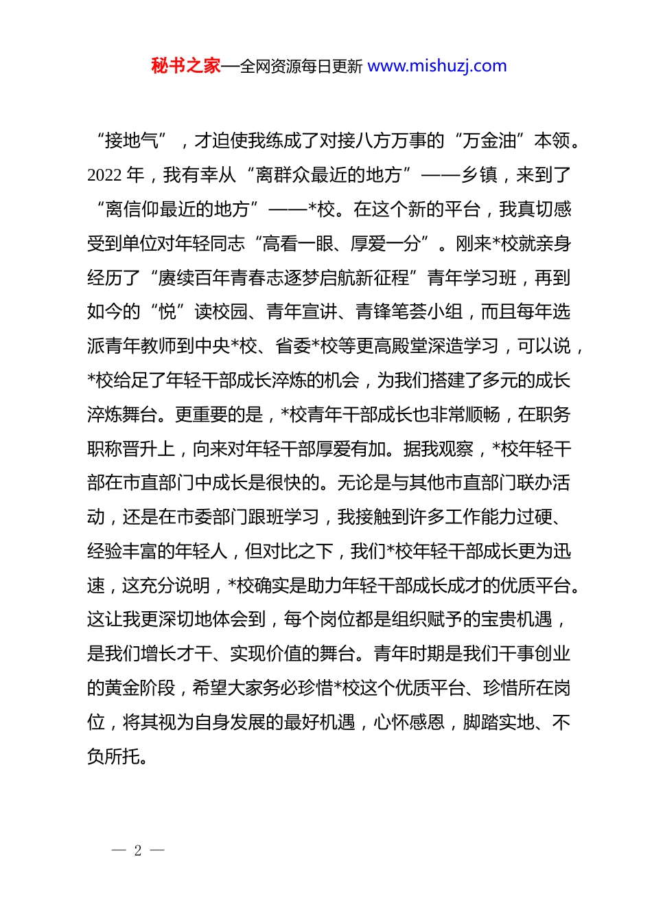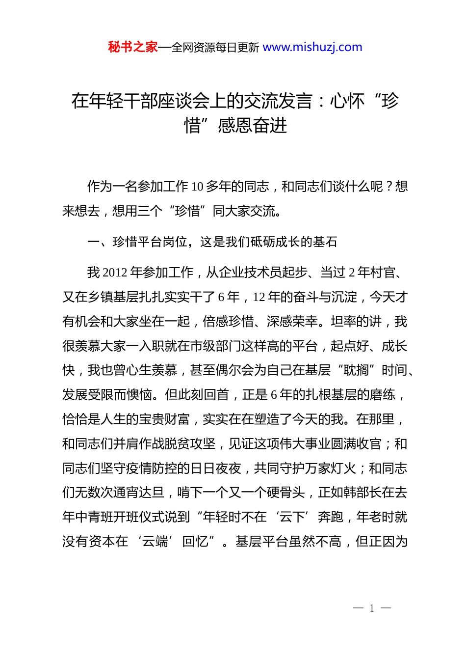 秘书之家—全网资源每日更新 www.mishuzj.com在年轻干部座谈会上的交流发言:心怀“珍惜”感恩奋进作为一名参加工作 10 多年的同志,和同志们谈什么呢?想来想去,想用三个“珍惜”同大家交流。一、珍惜平台岗位,这是我们砥砺成长的基石我 2012 年参加工作,从企业技术员起步、当过 2 年村官、又在乡镇基层扎扎实实干了 6 年,12 年的奋斗与沉淀,今天才有机会和大家坐在一起,倍感珍惜、深感荣幸。坦率的讲,我很羡慕大家一入职就在市级部门这样高的平台,起点好、成长快,我也曾心生羡慕,甚至偶尔会为自己在基层“耽搁”时间、发展受限而懊恼。但此刻回首,正是 6 年的扎根基层的磨练,恰恰是人生的宝贵财富,实实在在塑造了今天的我。在那里,和同志们并肩作战脱贫攻坚,见证这项伟大事业圆满收官;和同志们坚守疫情防控的日日夜夜,共同守护万家灯火;和同志们无数次通宵达旦,啃下一个又一个硬骨头,正如韩部长在去年中青班开班仪式说到“年轻时不在‘云下’奔跑,年老时就没有资本在‘云端’回忆”。基层平台虽然不高,但正因为— 1 —秘书之家—全网资源每日更新 www.mishuzj.com“接地气”,才迫使我练成了对接八方万事的“万金油”本领。2022 年,我有幸从“离群众最近的地方”——乡镇,来到了“离信仰最近的地方”——*校。在这个新的平台,我真切感受到单位对年轻同志“高看一眼、厚爱一分”。刚来*校就亲身经历了“赓续百年青春志逐梦启航新征程”青年学习班,再到如今的“悦”读校园、青年宣讲、青锋笔荟小组,而且每年选派青年教师到中央*校、省委*校等更高殿堂深造学习,可以说,*校给足了年轻干部成长淬炼的机会,为我们搭建了多元的成长淬炼舞台。更重要的是,*校青年干部成长也非常顺畅,在职务职称晋升上,向来对年轻干部厚爱有加。据我观察,*校年轻干部在市直部门中成长是很快的。无论是与其他市直部门联办活动,还是在市委部门跟班学习,我接触到许多工作能力过硬、经验丰富的年轻人,但对比之下,我们*校年轻干部成长更为迅速,这充分说明,*校确实是助力年轻干部成长成才的优质平台。这让我更深切地体会到,每个岗位都是组织赋予的宝贵机遇,是我们增长才干、实现价值的舞台。青年时期是我们干事创业的黄金阶段,希望大家务必珍惜*校这个优质平台、珍惜所在岗位,将其视为自身发展的最好机遇,心怀感恩,脚踏实地、不负所托。— 2 —秘书之家—全网资源每日更新 www.mishuzj.com二、珍惜学习机会,这是我们提升境界的阶梯无论是初入职场的懵懂,还是面对新领域的挑战,我最大的体会就是:学习是克服“本领恐慌”、实现自我超越的唯一捷径。我现在有时候并不后悔自己大多数做出的选择,更多的是对自己在青春时没有好好学习的后悔和惭愧。在平时工作中,表现出遇事不沉稳,有时候过于浮躁;在工作中,效率不高时有加班,这都是学习不够的表现。现在我们在*校拥有优美的校园环境、书藏万卷的图书馆、功能完备的阅览室,而且时不时能有学界大咖和专家教授登台授课,这其实是我们最大的财富,我们拥有其他部门不具备的静心学习的优势。与其刷手机让碎片化的信息消磨时光,不如投身知识海洋游一遭。趁着有这方净土,潜心研读经典、深学理论精髓、精进业务能力,否则退休之后,发现自己此生读书甚少,方觉辜负这篇滋养心灵的沃土,那是何等遗憾与追悔。三、珍惜锻炼实践,这是我们淬炼成钢的熔炉我个人的成长,最关键的养分就来自于基层一线的摔打锤炼。在乡镇,加班加点是常态,条件相对艰苦,急难险重任务多。正是这些“苦差事”,锻炼了抗压能力和吃苦意志。青年干部要勇于到吃劲岗位、艰苦环境、基层一线去“自找苦吃”,— 3 —秘书之家—全网资源每日更新 www.mishuzj.com把“苦”嚼出“甜”味,把经历转化为能力。现在*校环境十分优越,也没那么多急难险重的任务,那我们就要更加珍惜这些为数不多的锻炼机会,作为年轻干部,遇到重要任务主动担当,积极作为,须知,每一次的畏难退缩,看似占了便宜轻松一时,实际上错失了锤炼自我提升能力的机会,长期以往,发现自己工作数载、却身无长技,整日深陷琐碎事务性工作循环,难以实现...