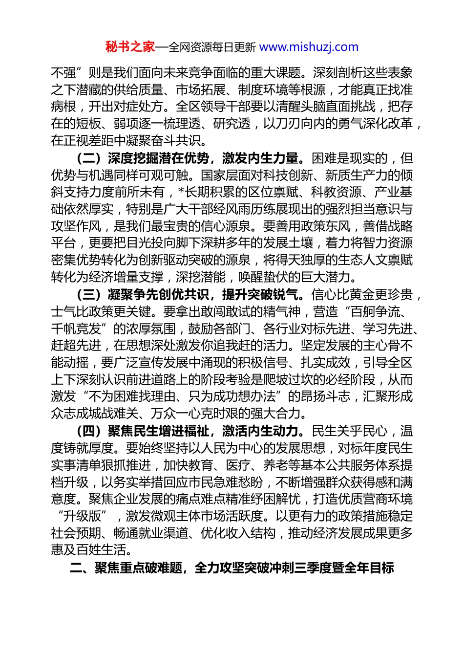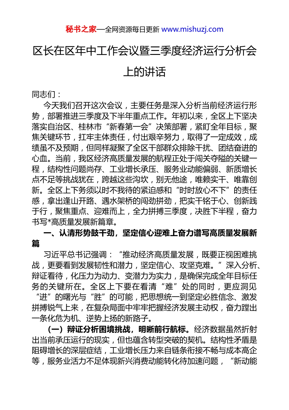 秘书之家—全网资源每日更新 www.mishuzj.com区长在区年中工作会议暨三季度经济运行分析会上的讲话同志们:今天我们召开这次会议,主要任务是深入分析当前经济运行形势,部署推进三季度及下半年重点工作。年初以来,全区上下坚决落实自治区、桂林市“新春第一会”决策部署,紧盯全年目标,聚焦关键环节,扛牢主体责任,付出艰辛努力,取得了一定成效,成绩虽不及预期,但同样凝聚了全区干部群众排除干扰、团结奋进的心血。当前,我区经济高质量发展的航程正处于闯关夺隘的关键一程,结构性问题尚存、工业增长承压、服务业动能偏弱、新质增长点不足等挑战犹在,跨越这些沟坎,别无他途,唯赖实干、唯靠创新。全区上下务须以时不我待的紧迫感和“时时放心不下”的责任感,拿出逢山开路、遇水架桥的闯劲拼劲,把实干铭于心、创新践于行,聚焦重点、迎难而上,全力拼搏三季度,决胜下半程,奋力书写*高质量发展新篇章。一、认清形势鼓干劲,坚定信心迎难上奋力谱写高质量发展新篇习近平总书记强调:“推动经济高质量发展,既要正视困难挑战,更要看到发展韧性和潜力,坚定信心、攻坚克难。”深入分析、辩证看待,化压力为动力、变潜力为实力,是确保完成全年目标任务的关键所在。全区上下要在看清“难”处的同时,更应洞见“进”的曙光与“胜”的可能,把思想统一到坚定必胜信念、激发拼搏锐气上来,在复杂局面中牢牢把握经济发展主动权,奋力蹚出一条化危为机、逆势上扬的新路子。(一)辩证分析困境挑战,明晰前行航标。经济数据虽然折射出当前承压运行的现实,但也蕴含转型突破的契机。结构性矛盾是阻碍增长的深层症结,工业增长压力来自链条衔接不畅与成本高企等,服务业活力不足体现新兴消费动能转化待加速问题,“新动能秘书之家—全网资源每日更新 www.mishuzj.com不强”则是我们面向未来竞争面临的重大课题。深刻剖析这些表象之下潜藏的供给质量、市场拓展、制度环境等根源,才能真正找准病根,开出对症处方。全区领导干部要以清醒头脑直面挑战,把存在的短板、弱项逐一梳理透、研究透,以刀刃向内的勇气深化改革,在正视差距中凝聚奋斗共识。(二)深度挖掘潜在优势,激发内生力量。困难是现实的,但优势与机遇同样可观可触。国家层面对科技创新、新质生产力的倾斜支持力度前所未有,*长期积累的区位禀赋、科教资源、产业基础依然厚实,特别是广大干部经风雨历练展现出的强烈担当意识与攻坚作风,是我们最宝贵的信心源泉。要善用政策东风,善借战略平台,更要把目光投向脚下深耕多年的发展土壤,着力将智力资源密集优势转化为创新驱动突破的源泉,将得天独厚的生态人文禀赋转化为经济增量支撑,深挖潜能,唤醒蛰伏的巨大潜力。(三)凝聚争先创优共识,提升突破锐气。信心比黄金更珍贵,士气比政策更关键。要拿出敢闯敢试的精气神,营造“百舸争流、千帆竞发”的浓厚氛围,鼓励各部门、各行业对标先进、学习先进、赶超先进,在思想深处激发你追我赶的活力。坚定发展的主心骨不能动摇,要广泛宣传发展中涌现的积极信号、扎实成效,引导全区上下深刻认识前进道路上的阶段考验是爬坡过坎的必经阶段,从而激发“不为困难找理由、只为成功想办法”的昂扬斗志,汇聚形成众志成城战难关、万众一心克时艰的强大合力。(四)聚焦民生增进福祉,激活内生动力。民生关乎民心,温度铸就厚度。要始终坚持以人民为中心的发展思想,对标年度民生实事清单狠抓推进,加快教育、医疗、养老等基本公共服务体系提档升级,以务实举措回应市民急难愁盼,不断增强群众获得感和满意度。聚焦企业发展的痛点难点精准纾困解忧,打造优质营商环境“升级版”,激发微观主体市场活跃度。以更有力的政策措施稳定社会预期、畅通就业渠道、优化收入结构,推动经济发展成果更多惠及百姓生活。二、聚焦重点破难题,全力攻坚突破冲刺三季度暨全年目标秘书之家—全网资源每日更新 www.mishuzj.com习近平总书记明确指出:“发展是解决我国一切问题的基础和关键”,“必须把坚持高质量发展作为新时代的硬道理。”高质量发展不是抽象概念,必须具化于突破重点瓶颈、打赢关键战役的务实行动中。三季度经济表现对全年...