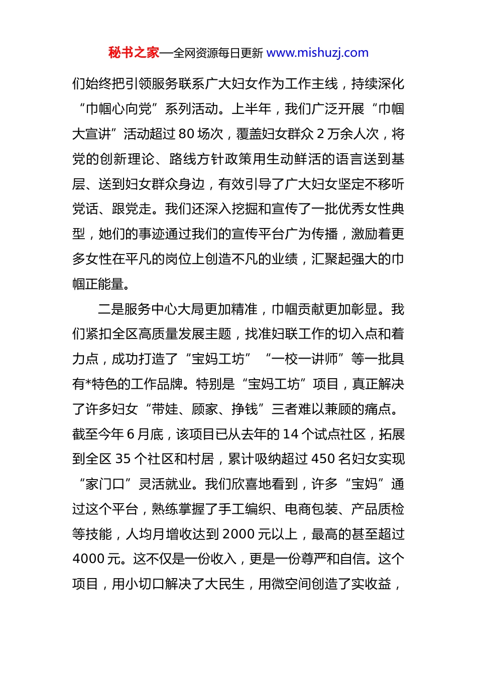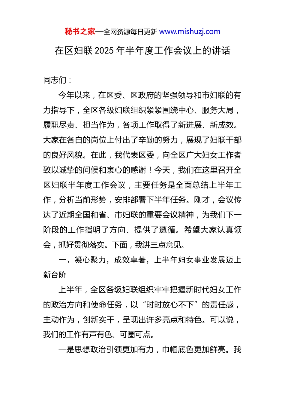 秘书之家—全网资源每日更新 www.mishuzj.com在区妇联 2025 年半年度工作会议上的讲话 同志们:今年以来,在区委、区政府的坚强领导和市妇联的有力指导下,全区各级妇联组织紧紧围绕中心、服务大局,履职尽责、担当作为,各项工作取得了新进展、新成效。大家在各自的岗位上付出了辛勤的努力,展现了妇联干部的良好风貌。在此,我代表区委,向全区广大妇女工作者致以诚挚的问候和衷心的感谢!今天,我们在这里召开全区妇联半年度工作会议,主要任务是全面总结上半年工作,分析当前形势,安排部署下半年任务。刚才,会议传达了近期全国和省、市妇联的重要会议精神,为我们下一阶段的工作指明了方向、提供了遵循。希望大家认真领会,抓好贯彻落实。下面,我讲三点意见。一、凝心聚力,成效卓著,上半年妇女事业发展迈上新台阶上半年,全区各级妇联组织牢牢把握新时代妇女工作的政治方向和使命任务,以“时时放心不下”的责任感,主动作为,创新实干,呈现出许多亮点和特色。可以说,我们的工作有声有色、可圈可点。一是思想政治引领更加有力,巾帼底色更加鲜亮。我秘书之家—全网资源每日更新 www.mishuzj.com们始终把引领服务联系广大妇女作为工作主线,持续深化“巾帼心向党”系列活动。上半年,我们广泛开展“巾帼大宣讲”活动超过 80 场次,覆盖妇女群众 2 万余人次,将党的创新理论、路线方针政策用生动鲜活的语言送到基层、送到妇女群众身边,有效引导了广大妇女坚定不移听党话、跟党走。我们还深入挖掘和宣传了一批优秀女性典型,她们的事迹通过我们的宣传平台广为传播,激励着更多女性在平凡的岗位上创造不凡的业绩,汇聚起强大的巾帼正能量。二是服务中心大局更加精准,巾帼贡献更加彰显。我们紧扣全区高质量发展主题,找准妇联工作的切入点和着力点,成功打造了“宝妈工坊”“一校一讲师”等一批具有*特色的工作品牌。特别是“宝妈工坊”项目,真正解决了许多妇女“带娃、顾家、挣钱”三者难以兼顾的痛点。截至今年 6 月底,该项目已从去年的 14 个试点社区,拓展到全区 35 个社区和村居,累计吸纳超过 450 名妇女实现“家门口”灵活就业。我们欣喜地看到,许多“宝妈”通过这个平台,熟练掌握了手工编织、电商包装、产品质检等技能,人均月增收达到 2000 元以上,最高的甚至超过4000 元。这不仅是一份收入,更是一份尊严和自信。这个项目,用小切口解决了大民生,用微空间创造了实收益,秘书之家—全网资源每日更新 www.mishuzj.com实现了家庭和谐与个人发展的“双赢”。三是民生服务品牌更加响亮,巾帼温度更加暖心。我们始终坚持以人民为中心的发展思想,将联系和服务妇女作为工作的生命线。儿童保护“一校一讲师”工程持续深化,取得了显著的社会效应。自 2021 年启动以来,我们不断壮大由法律专家、心理咨询师、资深教师组成的专业讲师队伍。截至今年上半年,该工程已实现全区中小学全覆盖,累计开展儿童保护专题讲座超过 550 场,受益学生近2.5 万名,为孩子们的健康成长撑起了一把坚实的“保护伞”,在全社会营造了关心关爱未成年人的浓厚氛围。同时,我们扎实开展低收入妇女“两癌”免费检查和救助工作,上半年共为 120 余名困难妇女提供了救助金。我们还深入推进家庭教育指导服务,开展线上线下指导活动近百场,惠及家庭 5000 余户,有效提升了家长的科学育儿能力。这些工作,件件桩桩都关系到妇女儿童的切身利益,实实在在地把党和政府的关怀与温暖送到了她们的心坎上。四是基层组织建设更加扎实,巾帼堡垒更加坚固。我们坚持党建带妇建,以改革创新精神加强妇联自身建设。上半年,我们着眼于妇女群体的新变化新特点,开始在直播电商、现代物流等“三新”领域积极探索妇联组织建秘书之家—全网资源每日更新 www.mishuzj.com设。我们已经成功在 2 个大型物流园区和 1 个电商产业孵化基地建立了行业性妇联组织,初步覆盖了近 300 名新业态女性从业者。虽然这只是一个开端,但它标志着我们的组织触角正在向最活跃、最前沿的经济领域延伸。此外,“美丽庭院”创建活动如火如荼,上半年新增区级示范户600 户,带动上万户家庭改...