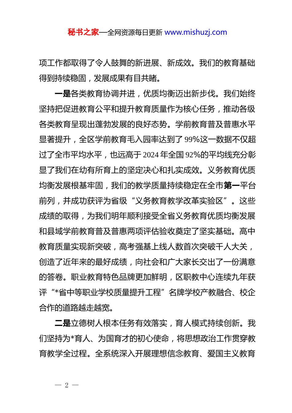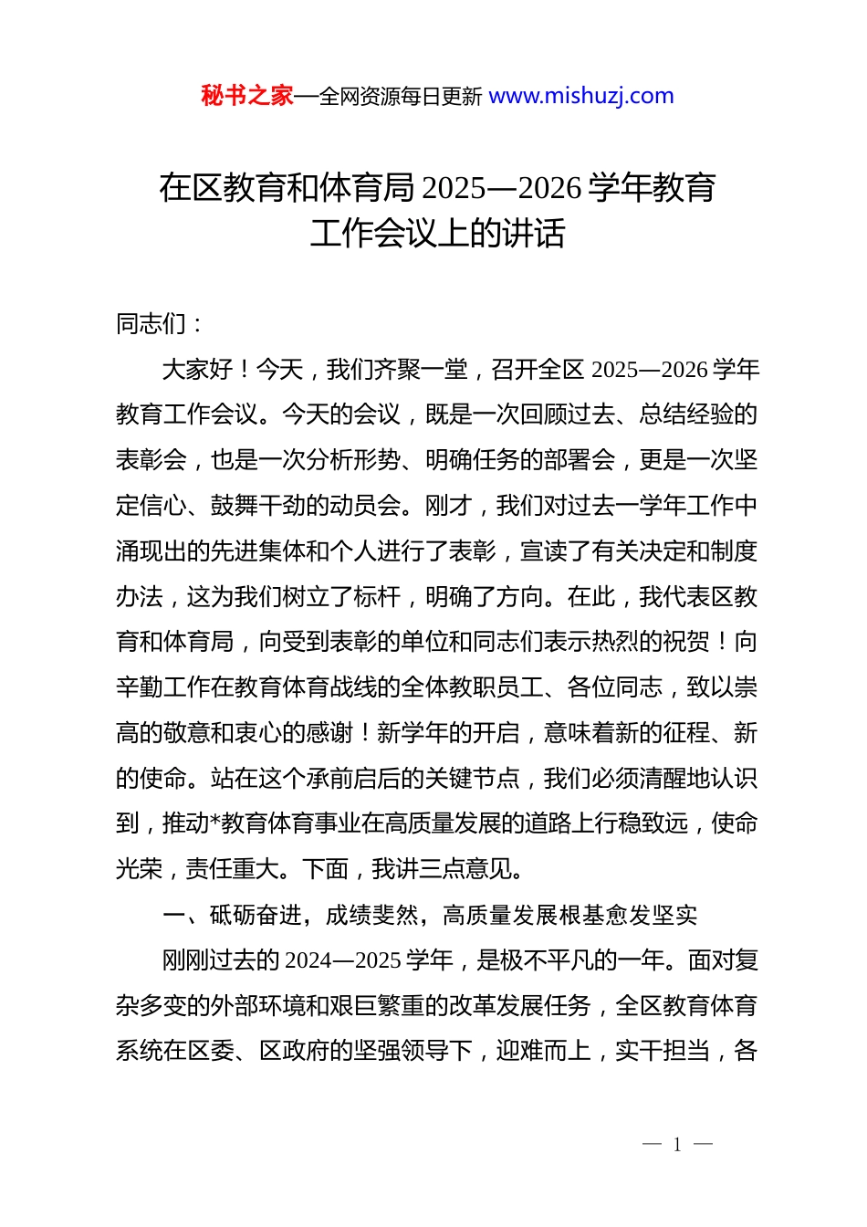 秘书之家—全网资源每日更新 www.mishuzj.com在区教育和体育局 2025—2026 学年教育工作会议上的讲话同志们:大家好!今天,我们齐聚一堂,召开全区 2025—2026 学年教育工作会议。今天的会议,既是一次回顾过去、总结经验的表彰会,也是一次分析形势、明确任务的部署会,更是一次坚定信心、鼓舞干劲的动员会。刚才,我们对过去一学年工作中涌现出的先进集体和个人进行了表彰,宣读了有关决定和制度办法,这为我们树立了标杆,明确了方向。在此,我代表区教育和体育局,向受到表彰的单位和同志们表示热烈的祝贺!向辛勤工作在教育体育战线的全体教职员工、各位同志,致以崇高的敬意和衷心的感谢!新学年的开启,意味着新的征程、新的使命。站在这个承前启后的关键节点,我们必须清醒地认识到,推动*教育体育事业在高质量发展的道路上行稳致远,使命光荣,责任重大。下面,我讲三点意见。一、砥砺奋进,成绩斐然,高质量发展根基愈发坚实刚刚过去的 2024—2025 学年,是极不平凡的一年。面对复杂多变的外部环境和艰巨繁重的改革发展任务,全区教育体育系统在区委、区政府的坚强领导下,迎难而上,实干担当,各— 1 —秘书之家—全网资源每日更新 www.mishuzj.com项工作都取得了令人鼓舞的新进展、新成效。我们的教育基础得到持续稳固,发展成果有目共睹。一是各类教育协调并进,优质均衡迈出新步伐。我们始终坚持把促进教育公平和提升教育质量作为核心任务,推动各级各类教育呈现出蓬勃发展的良好态势。学前教育普及普惠水平显著提升,全区学前教育毛入园率达到了 99%这一数据不仅超过了全市平均水平,也远高于 2024 年全国 92%的平均线充分彰显了我们在幼有所育上的坚定决心和扎实成效。义务教育优质均衡发展根基牢固,我们的教学质量持续稳定在全市第一平台前列,并成功获评为省级“义务教育教学改革实验区”。这些成绩的取得,为我们明年顺利接受全省义务教育优质均衡发展和县域学前教育普及普惠两项评估验收奠定了坚实基础。高中教育质量实现新突破,高考强基上线人数首次突破千人大关,创造了近年来的最好成绩,向社会和广大家长交出了一份满意的答卷。职业教育特色品牌更加鲜明,区职教中心连续九年获评“*省中等职业学校质量提升工程”名牌学校产教融合、校企合作的道路越走越宽。二是立德树人根本任务有效落实,育人模式持续创新。我们坚持为*育人、为国育才的初心使命,将思想政治工作贯穿教育教学全过程。全系统深入开展理想信念教育、爱国主义教育— 2 —秘书之家—全网资源每日更新 www.mishuzj.com和中华优秀传统文化教育,学生的综合素养和精神面貌焕然一新。课堂教学改革向纵深推进,我们鼓励广大教师积极探索新的教学方法和模式,激发学生学习的主动性和创造性。“五育并举”得到全面加强,体育、美育、劳动教育的育人功能得到充分发挥,学生的心理健康教育得到前所未有的重视,促进了学生的全面发展。三是教师队伍建设成果丰硕,专业素养整体提升。我们深知,教育大计,教师为本。过去一年,我们不断完善教师培养、评价和激励机制,涌现出了一批师德高尚、业务精湛的优秀教师,其中有的同志还荣获了“全国优秀教师”的光荣称号,这是我们全区教育系统的骄傲。我们通过开展多层次、全覆盖的培训和教研活动,广大教师的专业能力和教学水平得到了显著提升,为教育高质量发展提供了最有力的人才支撑。四是内部治理能力不断增强,发展环境持续优化。我们坚持以 dj 引领事业发展,深化中小学校*组织领导的校长负责制,*对教育工作的全面领导得到不折不扣地落实。我们高度重视*风廉政建设,特别是针对社会关切的校园餐、校服采购、教辅征订等领域,开展了集中整治工作。通过规范程序、加强监督、严肃纪律,有效净化了育人环境,维护了广大学生和家长的切身利益。同时,我们积极构建家校社协同育人机制,主动加强— 3 —秘书之家—全网资源每日更新 www.mishuzj.com与属地乡镇、相关部门和社会各界的沟通协调,为教育发展营造了更加和谐有利的外部环境。这些成绩的取得,是区委、区政府正确领导的结果,是社会各界关心支持的结果,更是全区广大教育...