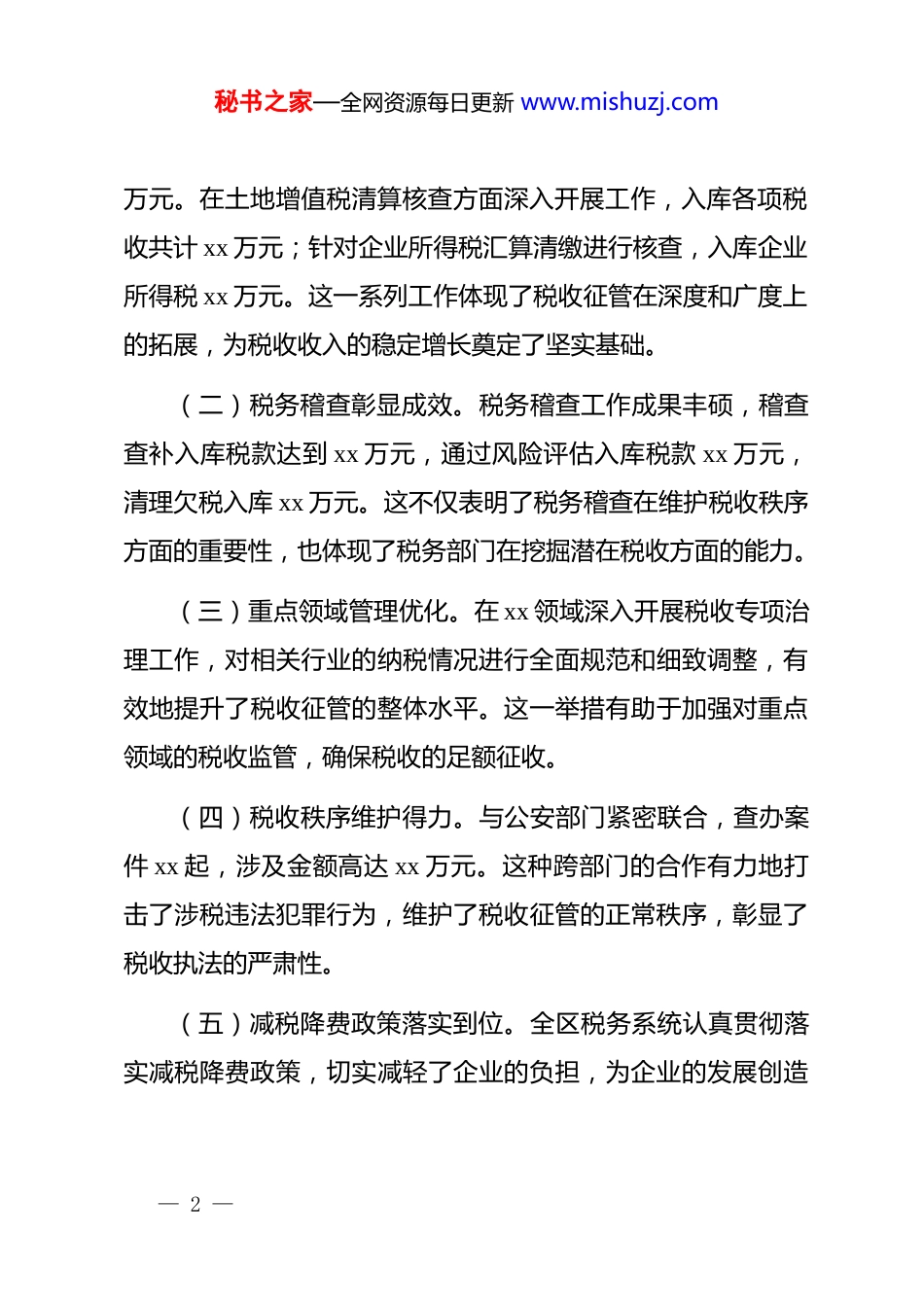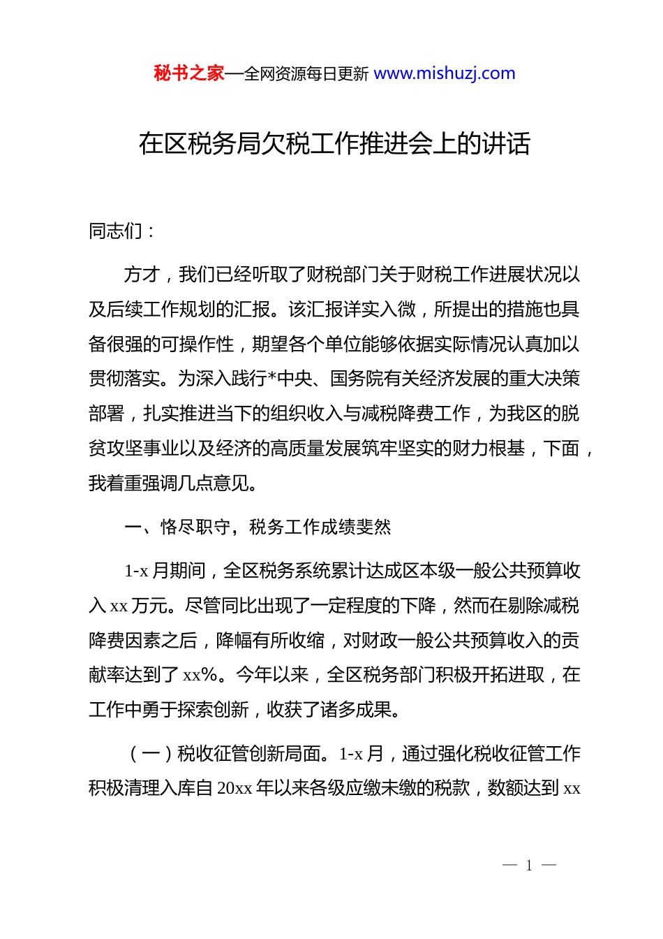 秘书之家—全网资源每日更新 www.mishuzj.com在区税务局欠税工作推进会上的讲话同志们:方才,我们已经听取了财税部门关于财税工作进展状况以及后续工作规划的汇报。该汇报详实入微,所提出的措施也具备很强的可操作性,期望各个单位能够依据实际情况认真加以贯彻落实。为深入践行*中央、国务院有关经济发展的重大决策部署,扎实推进当下的组织收入与减税降费工作,为我区的脱贫攻坚事业以及经济的高质量发展筑牢坚实的财力根基,下面,我着重强调几点意见。一、恪尽职守,税务工作成绩斐然1-x 月期间,全区税务系统累计达成区本级一般公共预算收入 xx 万元。尽管同比出现了一定程度的下降,然而在剔除减税降费因素之后,降幅有所收缩,对财政一般公共预算收入的贡献率达到了 xx%。今年以来,全区税务部门积极开拓进取,在工作中勇于探索创新,收获了诸多成果。(一)税收征管创新局面。1-x 月,通过强化税收征管工作积极清理入库自 20xx 年以来各级应缴未缴的税款,数额达到 xx— 1 —秘书之家—全网资源每日更新 www.mishuzj.com万元。在土地增值税清算核查方面深入开展工作,入库各项税收共计 xx 万元;针对企业所得税汇算清缴进行核查,入库企业所得税 xx 万元。这一系列工作体现了税收征管在深度和广度上的拓展,为税收收入的稳定增长奠定了坚实基础。(二)税务稽查彰显成效。税务稽查工作成果丰硕,稽查查补入库税款达到 xx 万元,通过风险评估入库税款 xx 万元,清理欠税入库 xx 万元。这不仅表明了税务稽查在维护税收秩序方面的重要性,也体现了税务部门在挖掘潜在税收方面的能力。(三)重点领域管理优化。在 xx 领域深入开展税收专项治理工作,对相关行业的纳税情况进行全面规范和细致调整,有效地提升了税收征管的整体水平。这一举措有助于加强对重点领域的税收监管,确保税收的足额征收。(四)税收秩序维护得力。与公安部门紧密联合,查办案件 xx 起,涉及金额高达 xx 万元。这种跨部门的合作有力地打击了涉税违法犯罪行为,维护了税收征管的正常秩序,彰显了税收执法的严肃性。(五)减税降费政策落实到位。全区税务系统认真贯彻落实减税降费政策,切实减轻了企业的负担,为企业的发展创造— 2 —秘书之家—全网资源每日更新 www.mishuzj.com了更为有利的环境,积极推动了企业的发展与转型升级。这一政策的有效实施体现了税务部门在宏观经济调控中的积极作用,有助于激发市场活力。这些成绩的取得,充分彰显了税务部门积极担当、奋发有为的精神风貌。二、直面问题,靶向发力化解困局从 1-x 月全区的经济运行态势来看,当前财税工作仍然存在若干问题亟待解决。(一)部分乡镇重视不足。部分乡镇政府对财税工作的重视程度有所欠缺,组织收入工作的开展缺乏力度,致使收入进度滞后。当前全区财税收入进度仅为 xx%,这一现状反映出部分乡镇在财税工作中的积极性和主动性有待提高。(二)新增税源动力不足。新增税源相对匮乏,缺乏强有力的支柱税源来填补收入的缺口。项目投资数量不足,融资面临重重困难,政府投资项目数量减少,开工率处于较低水平,有效投资严重欠缺,进而导致项目税收以及相关税收出现下滑趋势。(三)存量税源缴纳不力。部分存量税源存在应缴未缴的— 3 —秘书之家—全网资源每日更新 www.mishuzj.com情况,这对当期的税费收入产生了直接的负面影响。这种现象反映出在税源管理方面存在漏洞,需要进一步加强监管。(四)部门协作协同欠缺。部门之间的协作配合尚未达到紧密无间的程度,税收共治的良好氛围尚未真正形成。各部门之间缺乏有效的沟通与协调机制,导致在税收征管工作中无法形成强大的工作合力。(五)社保职能划转受阻。个别乡镇对社保职能划转税务征收工作缺乏足够的重视,从而影响了社保费职能划转改革的顺利推进。这一情况反映出在改革推进过程中,部分地区对政策的贯彻落实不到位。(六)招商企业涉税风险。招商引资企业存在一些涉税问题,相关部门在监管方面存在一定的风险。这需要我们在吸引投资的同时,加强对招商企业的涉税管理和监管力度。(七)收入目标调整失当。部分乡镇未能按照减税降...