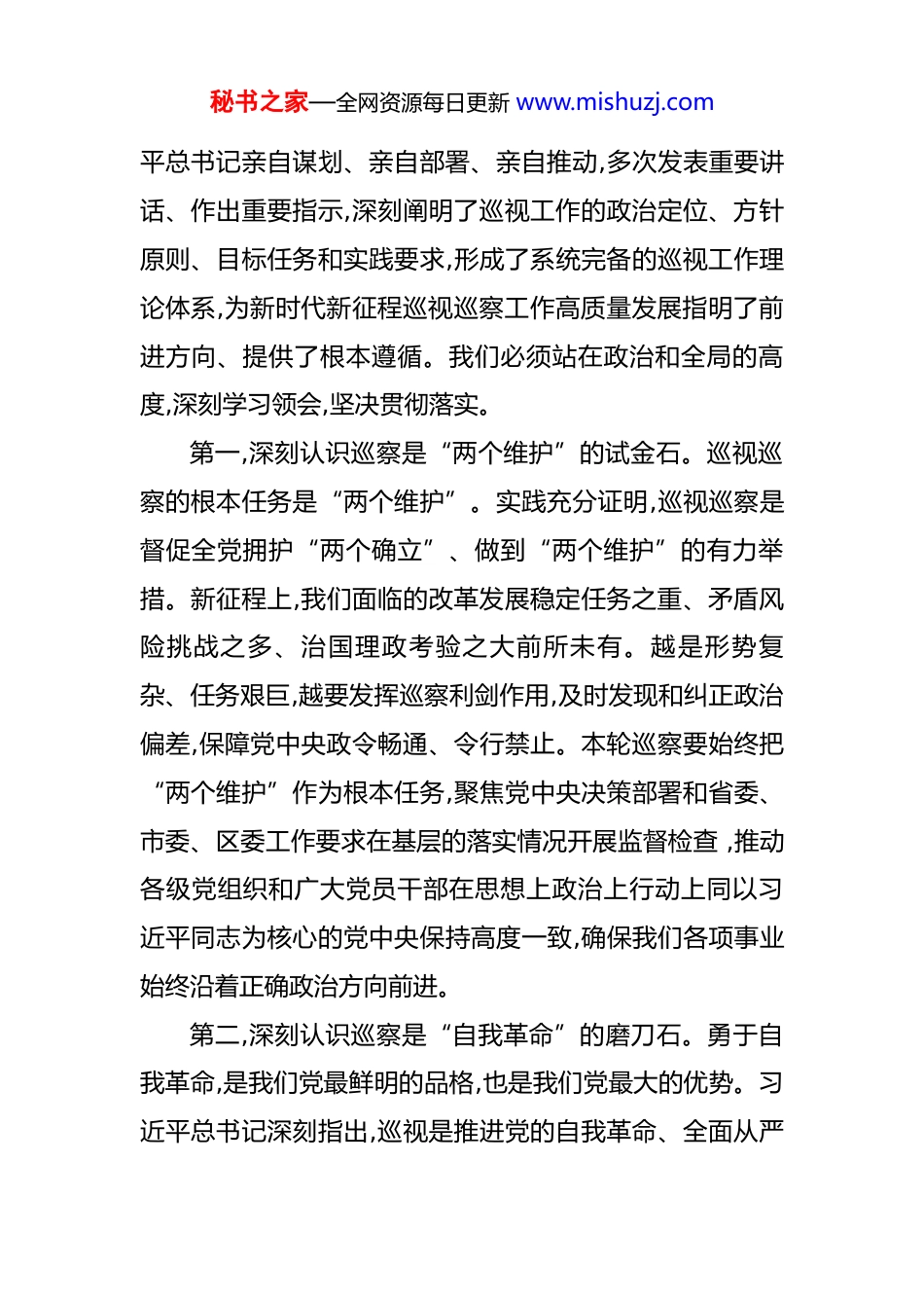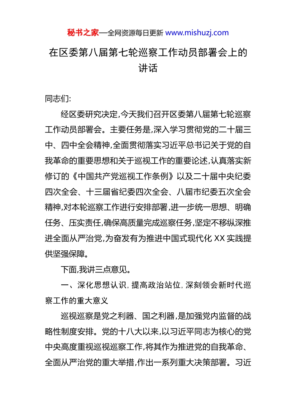 秘书之家—全网资源每日更新 www.mishuzj.com在区委第八届第七轮巡察工作动员部署会上的讲话 同志们:经区委研究决定,今天我们召开区委第八届第七轮巡察工作动员部署会。主要任务是,深入学习贯彻党的二十届三中、四中全会精神,全面贯彻落实习近平总书记关于党的自我革命的重要思想和关于巡视工作的重要论述,认真落实新修订的《中国共产党巡视工作条例》以及二十届中央纪委四次全会、十三届省纪委四次全会、八届市纪委五次全会精神,对本轮巡察工作进行安排部署,进一步统一思想、明确任务、压实责任,确保高质量完成巡察任务,坚定不移纵深推进全面从严治党,为奋发有为推进中国式现代化 XX 实践提供坚强保障。下面,我讲三点意见。一、深化思想认识,提高政治站位,深刻领会新时代巡察工作的重大意义巡视巡察是党之利器、国之利器,是加强党内监督的战略性制度安排。党的十八大以来,以习近平同志为核心的党中央高度重视巡视巡察工作,将其作为推进党的自我革命、全面从严治党的重大举措,作出一系列重大决策部署。习近秘书之家—全网资源每日更新 www.mishuzj.com平总书记亲自谋划、亲自部署、亲自推动,多次发表重要讲话、作出重要指示,深刻阐明了巡视工作的政治定位、方针原则、目标任务和实践要求,形成了系统完备的巡视工作理论体系,为新时代新征程巡视巡察工作高质量发展指明了前进方向、提供了根本遵循。我们必须站在政治和全局的高度,深刻学习领会,坚决贯彻落实。第一,深刻认识巡察是“两个维护”的试金石。巡视巡察的根本任务是“两个维护”。实践充分证明,巡视巡察是督促全党拥护“两个确立”、做到“两个维护”的有力举措。新征程上,我们面临的改革发展稳定任务之重、矛盾风险挑战之多、治国理政考验之大前所未有。越是形势复杂、任务艰巨,越要发挥巡察利剑作用,及时发现和纠正政治偏差,保障党中央政令畅通、令行禁止。本轮巡察要始终把“两个维护”作为根本任务,聚焦党中央决策部署和省委、市委、区委工作要求在基层的落实情况开展监督检查 ,推动各级党组织和广大党员干部在思想上政治上行动上同以习近平同志为核心的党中央保持高度一致,确保我们各项事业始终沿着正确政治方向前进。第二,深刻认识巡察是“自我革命”的磨刀石。勇于自我革命,是我们党最鲜明的品格,也是我们党最大的优势。习近平总书记深刻指出,巡视是推进党的自我革命、全面从严秘书之家—全网资源每日更新 www.mishuzj.com治党的战略性制度安排。巡察作为巡视向基层的延伸,本质上就是通过外部监督推动党组织内部自我净化、自我完善、自我革新、自我提高。过去一年,我区经济社会发展取得了显著成绩,2024 年全区地区生产总值历史性突破 1000亿元,一般公共预算收入同比增长 7.3%,城乡居民人均可支配收入分别增长 5.5%和 6.8%,但这并不意味着我们可以高枕无忧。我们必须清醒地看到,一些深层次的矛盾和问题依然存在,党风廉政建设和反腐败斗争形势依然严峻复杂。我们必须始终保持“赶考”的清醒和“永远在路上”的坚定,用好巡察这把反腐利剑,以刀刃向内的勇气,不断清除侵蚀党的健康肌体的病毒,永葆党的先进性和纯洁性。第三,深刻认识巡察是“联系群众”的连心桥。民心是最大的政治。我们党来自人民、植根人民、服务人民。巡察工作一头连着区委,一头连着基层群众,是党密切联系群众的桥梁和纽带。巡察的监督重点,就是群众反映强烈的突出问题 。要坚持以人民为中心的发展思想,把巡察监督的聚光灯对准群众身边的腐败问题和不正之风,深入查找教育、医疗、养老、社保、住房、环保等民生领域的突出问题 ,推动解决群众的“急难愁盼”,让人民群众在正风肃纪反腐中有更多的获得感、幸福感、安全感。通过巡察,要推动各级党组织树牢为民宗旨,践行群众路线,切实维护好、发展好、实秘书之家—全网资源每日更新 www.mishuzj.com现好最广大人民的根本利益,不断夯实党执政的政治基础和群众基础。二、聚焦监督重点,把握关键环节,以高质量巡察护航高质量发展今年是实现“十四五”规划目标的收官之年,也是推进八届区委巡察全覆盖的攻坚之年、关键之年。做好今年的巡察工作,意义重大、责任重大。我们要坚持问题导向,围绕中心、服...