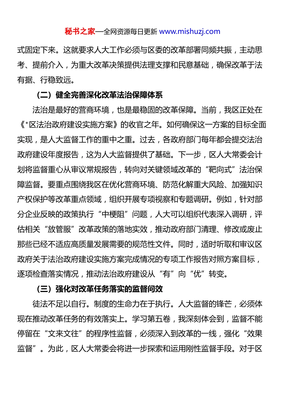 秘书之家—全网资源每日更新 www.mishuzj.com在区委理论学习中心组专题学习会上学习治国理政第五卷的发言材料近期,通过对《***谈治国理政》第五卷的深入学习,我深受教育、备受启发。这部重要著作集中反映了**************思想的最新发展,是指导我们认识世界、改造世界的强大思想武器。作为区人大常委会的负责同志,我结合人大工作实际,聚焦如何将学习成果转化为推动*区高质量发展的具体行动,谈几点认识、体会与打算。我不谈具体工作成绩,主要围绕认识和思路,向各位同志作一个汇报。一、把握“关键一招”,以法治保障引领改革纵深推进《***谈治国理政》第五卷深刻阐明,改革与法治如鸟之两翼、车之两轮,必须一体部署、一体推进。当前,改革已进入攻坚期和深水区,面对的都是难啃的“硬骨头”。作为地方国家权力机关,人大必须发挥法治的规范、引领和保障作用,确保每一项改革都在法治轨道上有序进行,确保改革成果经得起历史和人民的检验。(一)深刻领会全面深化改革核心要义学习第五卷让我更加清醒地认识到,全面深化改革的总目标是完善和发展中国特色社会主义制度,推进国家治理体系和治理能力现代化。这要求我们的改革不能是零敲碎打、头痛医头,而必须是系统集成、协同高效的制度创新。对于*区而言,无论是产业转型、城市更新,还是社会治理、民生改善,都迫切需要破除体制机制障碍。人大的根本任务,就是要通过法定程序,将*的改革主张转化为全区人民的共同意志,并以法律法规的形秘书之家—全网资源每日更新 www.mishuzj.com式固定下来。这就要求人大工作必须与区委的改革部署同频共振,主动思考、提前介入,为重大改革决策提供法理支撑和民意基础,确保改革于法有据、行稳致远。(二)健全完善深化改革法治保障体系法治是最好的营商环境,也是最稳固的改革保障。当前,我区正处在《*区法治政府建设实施方案》的收官之年。如何确保这一方案的目标全面实现,是人大监督工作的重中之重。过去,各政府部门每年都会提交法治政府建设年度报告,这为人大监督提供了基础。下一步,区人大常委会计划将监督重心从审议常规报告,转向对关键领域改革的“靶向式”法治保障监督。要重点围绕我区在优化营商环境、防范化解重大风险、加强知识产权保护等改革重点领域,组织开展专项视察和专题调研。例如,针对部分企业反映的政策执行“中梗阻”问题,人大可以组织代表深入调研,评估相关“放管服”改革政策的落地实效,推动政府部门清理、修改或废止那些已经不适应高质量发展需要的规范性文件。同时,适时听取和审议区政府关于法治政府建设实施方案完成情况的专项工作报告对照方案目标,逐项检查落实情况,推动法治政府建设从“有”向“优”转变。(三)强化对改革任务落实的监督问效徒法不足以自行。制度的生命力在于执行。人大监督的锋芒,必须体现在推动改革任务的有效落实上。学习第五卷,我深刻体会到,监督不能停留在“文来文往”的程序性监督,必须深入到改革的一线,强化“效果监督”。为此,区人大常委会将进一步探索和运用刚性监督手段。对于区秘书之家—全网资源每日更新 www.mishuzj.com委确定的重大改革项目,如*研发及制造中心、*精品包装研发生产基地等产业项目的推进,人大将通过“嵌入式”监督,跟踪项目审批、土地供应、要素保障等环节的法治状况。对于社会关注度高、与群众利益密切相关的改革事项,如下放行政执法权的承接与运行情况,可以依法启动询问、质询等监督方式,推动问题解决。此外,还计划引入“立法后评估”机制,对过去几年区人大及其常委会出台的地方性规范文件,特别是涉及经济社会管理方面的,开展实施效果评估,检验其是否真正达到了促进改革、服务发展的预期目标,并根据评估结果提出“立改废释”的建议,形成“决策—立法—实施—监督—评估—再立法”的闭环管理,确保法治对改革的保障精准有效。二、聚焦“核心动力”,以创新动能驱动高质量发展第五卷用大量篇幅论述了高质量发展和科技自立自强。******提出的“新质生产力”概念,为我们指明了发展的未来方向。*区作为*市的中心城区,工业基础较好,但传统动能减弱的压力同样存在。推动高...