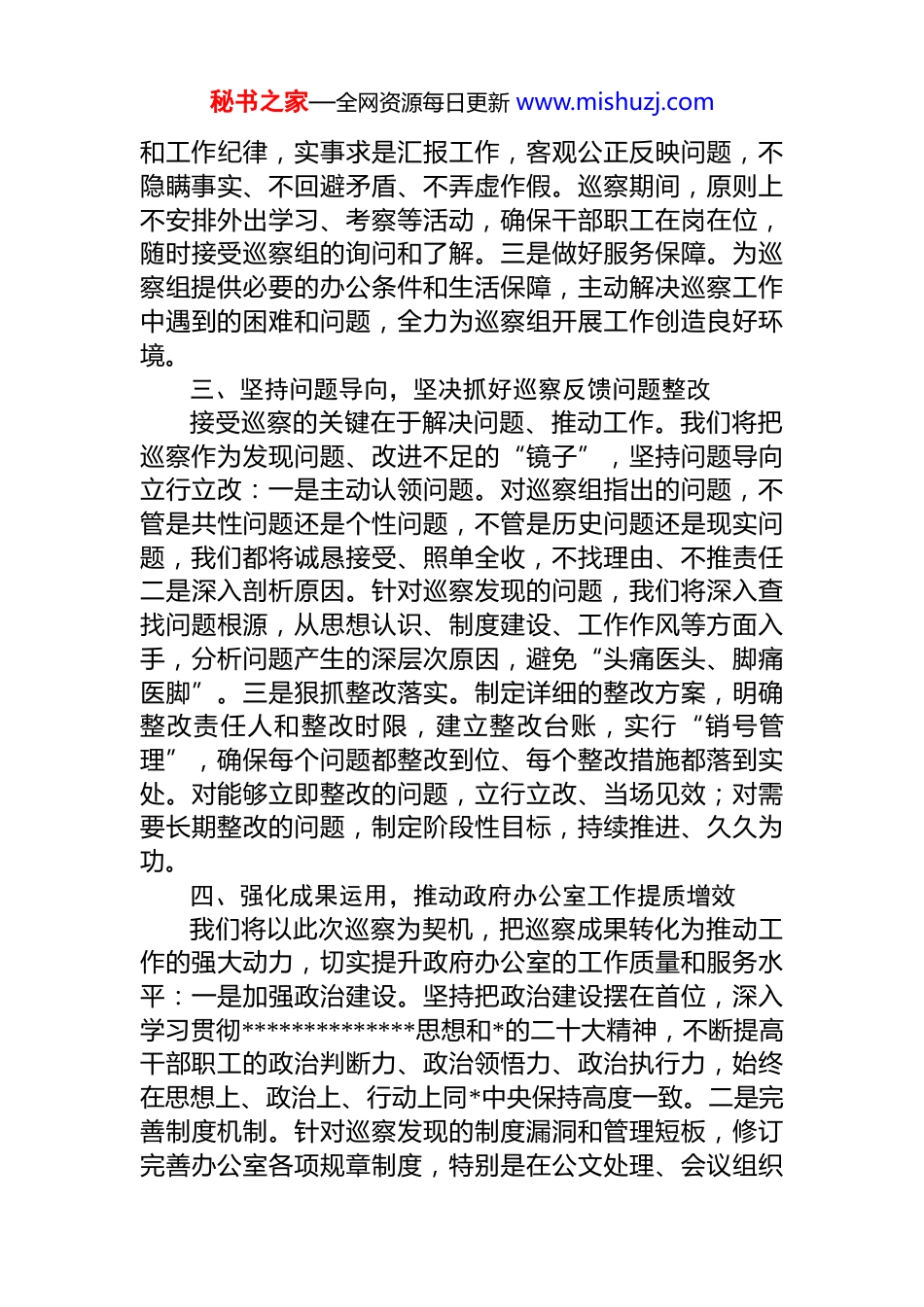 秘书之家—全网资源每日更新 www.mishuzj.com在区委巡视组巡察进驻会上的表态发言尊敬的各位领导、同志们:今天,区委巡视组正式进驻区政府办公室开展巡察工作,这是区委对区政府办公室工作的高度重视和关心爱护也是对我们履行职责、改进作风的全面检验。在此,我代表区政府办公室全体干部职工,向巡察组各位领导表示热烈欢迎和衷心感谢!下面,我就全力配合做好巡察工作,作如下表态:一、提高政治站位,深刻认识巡察工作的重要意义巡察是*内监督的重要制度安排,是推进全面从严治*向基层延伸的重要举措,更是帮助我们发现问题、改进工作、提升能力的重要契机。区政府办公室作为区政府的“中枢机关”,承担着参谋助手、统筹协调、督促落实、服务保障等重要职能,我们的工作质量直接关系到区政府决策部署的贯彻落实,关系到政府形象和群众利益。我们将始终把接受巡察作为当前首要政治任务,深入学习贯彻******关于巡视工作的重要论述,深刻领悟“两个确立”的决定性意义,增强“四个意识”、坚定“四个自信”、做到“两个维护”,切实把思想和行动统一到区委巡察工作要求上来,以高度的政治自觉和行动自觉接受巡察监督。二、全力支持配合,确保巡察工作顺利开展配合巡察组开展工作,是我们的政治责任和应尽义务。我们将严格按照巡察组的工作要求,全方位、无条件地支持配合巡察工作:一是做好统筹协调。成立由我任组长的巡察工作配合领导小组,明确专人负责对接巡察组的各项工作,及时提供巡察所需的文件资料、会议记录、财务账目等材料,确保资料提供精准、及时、全面。二是严肃工作纪律。要求全体干部职工严格遵守政治纪律、组织纪律秘书之家—全网资源每日更新 www.mishuzj.com和工作纪律,实事求是汇报工作,客观公正反映问题,不隐瞒事实、不回避矛盾、不弄虚作假。巡察期间,原则上不安排外出学习、考察等活动,确保干部职工在岗在位,随时接受巡察组的询问和了解。三是做好服务保障。为巡察组提供必要的办公条件和生活保障,主动解决巡察工作中遇到的困难和问题,全力为巡察组开展工作创造良好环境。三、坚持问题导向,坚决抓好巡察反馈问题整改接受巡察的关键在于解决问题、推动工作。我们将把巡察作为发现问题、改进不足的“镜子”,坚持问题导向立行立改:一是主动认领问题。对巡察组指出的问题,不管是共性问题还是个性问题,不管是历史问题还是现实问题,我们都将诚恳接受、照单全收,不找理由、不推责任二是深入剖析原因。针对巡察发现的问题,我们将深入查找问题根源,从思想认识、制度建设、工作作风等方面入手,分析问题产生的深层次原因,避免“头痛医头、脚痛医脚”。三是狠抓整改落实。制定详细的整改方案,明确整改责任人和整改时限,建立整改台账,实行“销号管理”,确保每个问题都整改到位、每个整改措施都落到实处。对能够立即整改的问题,立行立改、当场见效;对需要长期整改的问题,制定阶段性目标,持续推进、久久为功。四、强化成果运用,推动政府办公室工作提质增效我们将以此次巡察为契机,把巡察成果转化为推动工作的强大动力,切实提升政府办公室的工作质量和服务水平:一是加强政治建设。坚持把政治建设摆在首位,深入学习贯彻**************思想和*的二十大精神,不断提高干部职工的政治判断力、政治领悟力、政治执行力,始终在思想上、政治上、行动上同*中央保持高度一致。二是完善制度机制。针对巡察发现的制度漏洞和管理短板,修订完善办公室各项规章制度,特别是在公文处理、会议组织秘书之家—全网资源每日更新 www.mishuzj.com督查落实、后勤保障等方面,建立健全科学规范、运行有效的制度体系,实现用制度管权、管事、管人。三是提升服务能力。聚焦“三服务”核心职能,加强干部职工的业务培训和实践锻炼,不断提高参谋辅政、统筹协调、督促落实的能力,努力打造“忠诚、干净、担当”的干部队伍为区政府高效运转提供坚强保障。四是推动工作落实。把巡察整改与推动当前工作结合起来,以巡察整改促进工作落实,以工作落实检验整改成效,切实把巡察成果转化为推动区政府办公室工作提质增效的实际行动,为全区经济社会高质量发展贡献力量...