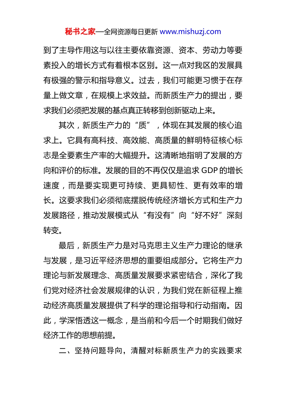 秘书之家—全网资源每日更新 www.mishuzj.com在区委中心组学习《习近平经济文选》专题研讨会上的发言 各位同志:根据会议安排,下面我结合近期参加区委常委会(扩大)会议的学习内容,以及个人对《习近平经济文选》第一卷的研读思考,围绕“新质生产力”这一核心概念,谈几点不成熟的认识和体会,希望能与各位同志交流互鉴,共同深化理解、凝聚共识。一、深化思想认识,深刻领会新质生产力的时代内涵与理论价值通过原原本本研读《什么是新质生产力,如何发展新质生产力》等重要篇章我感到,“新质生产力”不仅是一个全新的概念,更是一个内涵极其丰富、指向十分明确的时代命题。它深刻回答了在高质量发展阶段,中国经济“以什么样的生产力、如何实现持续发展”的根本性问题。首先,新质生产力的“新”,体现在其生成的根本动力上。它不是对传统生产力的简单改良或量的叠加,而是一种由技术革命性突破、生产要素创新性配置、产业深度转型升级而催生的质变。其本质是创新在生产力发展中起秘书之家—全网资源每日更新 www.mishuzj.com到了主导作用这与以往主要依靠资源、资本、劳动力等要素投入的增长方式有着根本区别。这一点对我区的发展具有极强的警示和指导意义。过去,我们可能更习惯于在存量上做文章,在规模上求效益。而新质生产力的提出,要求我们必须把发展的基点真正转移到创新驱动上来。其次,新质生产力的“质”,体现在其发展的核心追求上。它具有高科技、高效能、高质量的鲜明特征核心标志是全要素生产率的大幅提升。这清晰地指明了发展的方向和评价的标准。发展的目的不再仅仅是追求 GDP 的增长速度,而是要实现更可持续、更具韧性、更有效率的增长。这要求我们必须彻底摆脱传统经济增长方式和生产力发展路径,推动发展模式从“有没有”向“好不好”深刻转变。最后,新质生产力是对马克思主义生产力理论的继承与发展,是习近平经济思想的重要组成部分。它将生产力理论与新发展理念、高质量发展要求紧密结合,深化了我们党对经济社会发展规律的认识,为我们党在新征程上推动经济高质量发展提供了科学的理论指导和行动指南。因此,学深悟透这一概念,是当前和今后一个时期我们做好经济工作的思想前提。二、坚持问题导向,清醒对标新质生产力的实践要求秘书之家—全网资源每日更新 www.mishuzj.com反思自身理论的价值在于指导实践。对照新质生产力的核心要义,结合我区实际情况进行反思,我认为既要看到我们的优势和潜力,更要正视存在的短板和挑战。正如区委常委会上所强调的,我们要立足*区实际,找准区域协同发展定位。那么,我们的“实际”是什么?优势在于,我们拥有一定的产业基础和市场空间,干部群众干事创业的热情高。短板则更为突出:我们的传统产业占比依然较大,转型升级的步伐还不够快;战略性新兴产业虽有布局,但体量偏小,尚未形成集聚效应和核心竞争力;科技创新能力不强,高层次人才和创新平台相对匮乏,企业作为创新主体的积极性和能力都有待提升。这些问题,归根结底是新质生产力发育不足、成长不快的具体表现。在这样的背景下,省委提出的“两高四着力”发展要求以及市委明确的“一源一区一堡一地”战略定位,为我们指明了前进方向和奋斗坐标。但是,如何将这些宏观战略转化为我区发展的具体路径?我认为,关键就在于以发展新质生产力为总牵引。我们不能再“穿新鞋走老路”,不能满足于修修补补,必须以“壮士断腕”的勇气和“脱胎换骨”的决心,推动一场深刻的发展范式变革。具体来说,需要反思几个问题:我们的招商引资,是否真正做到了“招新引优”,秘书之家—全网资源每日更新 www.mishuzj.com招来的项目是不是真正具备高科技、高效能的特征?我们的企业培育,是否真正聚焦于激励创新、提升“智”造水平?我们的营商环境优化,是否真正打通了人才、技术、数据等新型生产要素流动的堵点?我们对传统产业的改造,是真的实现了深度转型升级,还是停留在表面的设备更新?这些问题值得我们每一位同志深入思考。三、聚焦精准发力,积极探索培育壮大新质生产力的可行路径知不足而后进。认识到差距,关键在于行动。发展新质生产力是一项系统工程...
