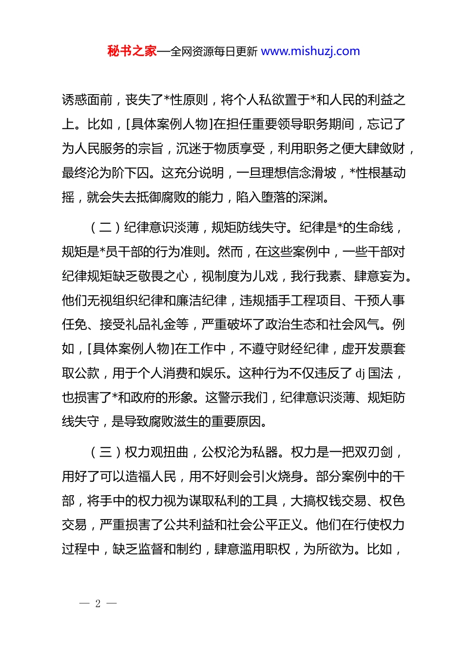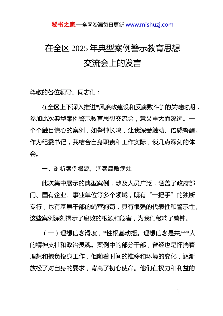 秘书之家—全网资源每日更新 www.mishuzj.com在全区 2025 年典型案例警示教育思想交流会上的发言尊敬的各位领导、同志们:在全区上下深入推进*风廉政建设和反腐败斗争的关键时期,参加此次典型案例警示教育思想交流会,意义重大而深远。一个个触目惊心的案例,如警钟长鸣,让我深受触动、倍感警醒。作为纪委书记,我结合自身职责和工作实际,谈几点深刻的体会。一、剖析案例根源,洞察腐败病灶此次集中展示的典型案例,涉及人员广泛,涵盖了政府部门、国有企业、事业单位等多个领域,既有“一把手”的独断专行,也有基层干部的蝇营狗苟,具有很强的代表性和警示性。这些案例深刻揭示了腐败的根源和危害,为我们敲响了警钟。(一)理想信念滑坡,*性根基动摇。理想信念是共产*人的精神支柱和政治灵魂。案例中的部分干部,曾经也是怀揣着理想和抱负投身工作,但随着时间的推移和环境的变化,逐渐放松了对自身的要求,背离了初心使命。他们在权力和利益的— 1 —秘书之家—全网资源每日更新 www.mishuzj.com诱惑面前,丧失了*性原则,将个人私欲置于*和人民的利益之上。比如,[具体案例人物]在担任重要领导职务期间,忘记了为人民服务的宗旨,沉迷于物质享受,利用职务之便大肆敛财,最终沦为阶下囚。这充分说明,一旦理想信念滑坡,*性根基动摇,就会失去抵御腐败的能力,陷入堕落的深渊。(二)纪律意识淡薄,规矩防线失守。纪律是*的生命线,规矩是*员干部的行为准则。然而,在这些案例中,一些干部对纪律规矩缺乏敬畏之心,视制度为儿戏,我行我素、肆意妄为。他们无视组织纪律和廉洁纪律,违规插手工程项目、干预人事任免、接受礼品礼金等,严重破坏了政治生态和社会风气。例如,[具体案例人物]在工作中,不遵守财经纪律,虚开发票套取公款,用于个人消费和娱乐。这种行为不仅违反了 dj 国法,也损害了*和政府的形象。这警示我们,纪律意识淡薄、规矩防线失守,是导致腐败滋生的重要原因。(三)权力观扭曲,公权沦为私器。权力是一把双刃剑,用好了可以造福人民,用不好则会引火烧身。部分案例中的干部,将手中的权力视为谋取私利的工具,大搞权钱交易、权色交易,严重损害了公共利益和社会公平正义。他们在行使权力过程中,缺乏监督和制约,肆意滥用职权,为所欲为。比如,— 2 —秘书之家—全网资源每日更新 www.mishuzj.com[具体案例人物]利用职务上的便利,为他人在项目审批、土地出让等方面提供帮助,收受巨额贿赂。这种权力观的扭曲,不仅导致了个人的腐败堕落,也给国家和社会带来了巨大的损失。(四)监督机制缺失,制度执行乏力。监督是防止权力滥用的重要保障,制度是规范权力运行的根本遵循。然而,在一些案例中,我们可以看到监督机制的缺失和制度执行的乏力。部分单位和部门内部监督形同虚设,对干部的违纪违法行为缺乏有效的发现和制止机制。同时,一些制度在执行过程中打折扣、搞变通,没有得到严格落实。例如,[具体案例单位]在工程项目招投标过程中,存在违规操作、暗箱操作等问题,但由于监督不力,这些问题长期得不到解决,最终导致了腐败案件的发生。这说明,监督机制缺失、制度执行乏力,为腐败滋生提供了土壤和条件。二、反思自身行为,查找问题短板作为纪委书记,我深知自己肩负着重要的责任和使命。通过对这些典型案例的剖析和反思,我也深刻认识到自身在工作中还存在一些不足之处。(一)政治站位有待提高。在工作中,有时对政治理论学— 3 —秘书之家—全网资源每日更新 www.mishuzj.com习的重视程度不够,缺乏系统性和深入性,导致政治站位不够高,对*中央关于*风廉政建设和反腐败斗争的决策部署理解不够透彻,在实际工作中不能很好地将政治要求贯穿始终。例如,在处理一些复杂问题时,没有从政治高度去分析和解决,导致工作效果不够理想。(二)执纪能力有待提升。随着*风廉政建设和反腐败斗争的不断深入,对纪检干部的监督执纪能力提出了更高的要求。虽然自己在工作中积累了一定的经验,但面对新形势、新任务、新挑战,还存在一些能力短板。比如,在运用大数据、信息化手段开展监督执纪方面还不够熟练,对一些新型腐败和隐形变异问...