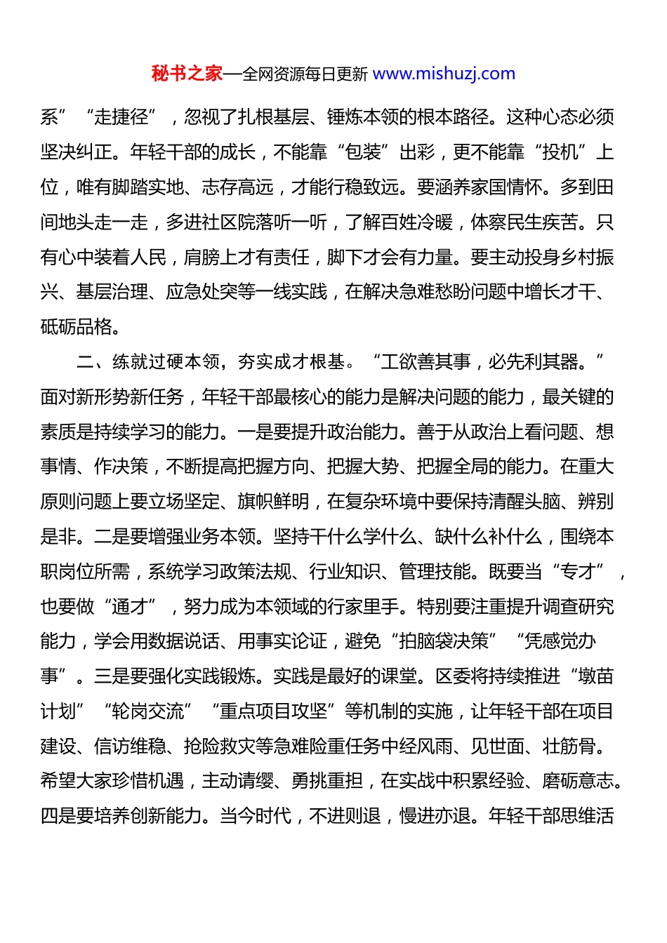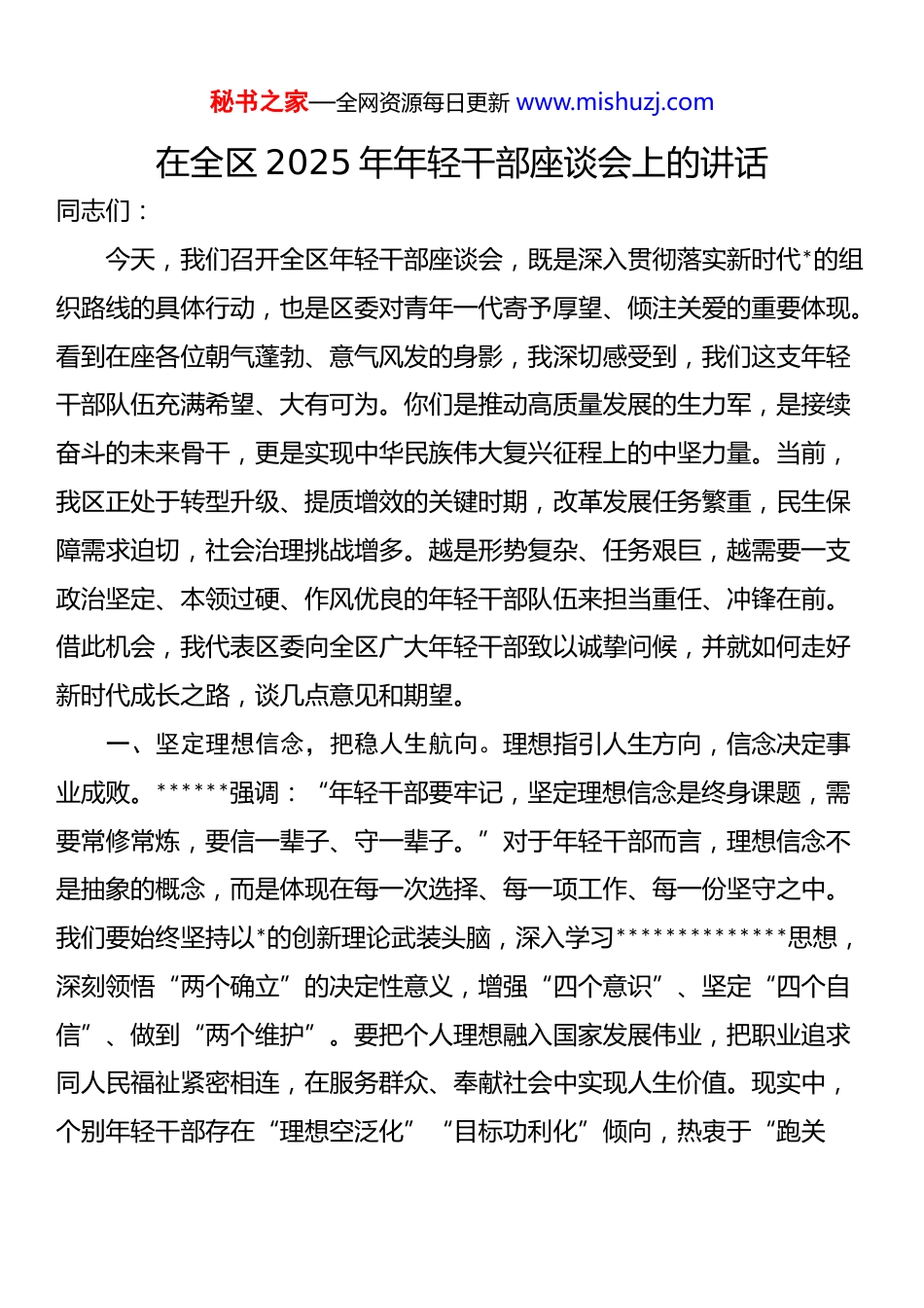 秘书之家—全网资源每日更新 www.mishuzj.com在全区 2025 年年轻干部座谈会上的讲话同志们:今天,我们召开全区年轻干部座谈会,既是深入贯彻落实新时代*的组织路线的具体行动,也是区委对青年一代寄予厚望、倾注关爱的重要体现。看到在座各位朝气蓬勃、意气风发的身影,我深切感受到,我们这支年轻干部队伍充满希望、大有可为。你们是推动高质量发展的生力军,是接续奋斗的未来骨干,更是实现中华民族伟大复兴征程上的中坚力量。当前,我区正处于转型升级、提质增效的关键时期,改革发展任务繁重,民生保障需求迫切,社会治理挑战增多。越是形势复杂、任务艰巨,越需要一支政治坚定、本领过硬、作风优良的年轻干部队伍来担当重任、冲锋在前。借此机会,我代表区委向全区广大年轻干部致以诚挚问候,并就如何走好新时代成长之路,谈几点意见和期望。一、坚定理想信念,把稳人生航向。理想指引人生方向,信念决定事业成败。******强调:“年轻干部要牢记,坚定理想信念是终身课题,需要常修常炼,要信一辈子、守一辈子。”对于年轻干部而言,理想信念不是抽象的概念,而是体现在每一次选择、每一项工作、每一份坚守之中。我们要始终坚持以*的创新理论武装头脑,深入学习**************思想,深刻领悟“两个确立”的决定性意义,增强“四个意识”、坚定“四个自信”、做到“两个维护”。要把个人理想融入国家发展伟业,把职业追求同人民福祉紧密相连,在服务群众、奉献社会中实现人生价值。现实中,个别年轻干部存在“理想空泛化”“目标功利化”倾向,热衷于“跑关秘书之家—全网资源每日更新 www.mishuzj.com系”“走捷径”,忽视了扎根基层、锤炼本领的根本路径。这种心态必须坚决纠正。年轻干部的成长,不能靠“包装”出彩,更不能靠“投机”上位,唯有脚踏实地、志存高远,才能行稳致远。要涵养家国情怀。多到田间地头走一走,多进社区院落听一听,了解百姓冷暖,体察民生疾苦。只有心中装着人民,肩膀上才有责任,脚下才会有力量。要主动投身乡村振兴、基层治理、应急处突等一线实践,在解决急难愁盼问题中增长才干、砥砺品格。二、练就过硬本领,夯实成才根基。“工欲善其事,必先利其器。”面对新形势新任务,年轻干部最核心的能力是解决问题的能力,最关键的素质是持续学习的能力。一是要提升政治能力。善于从政治上看问题、想事情、作决策,不断提高把握方向、把握大势、把握全局的能力。在重大原则问题上要立场坚定、旗帜鲜明,在复杂环境中要保持清醒头脑、辨别是非。二是要增强业务本领。坚持干什么学什么、缺什么补什么,围绕本职岗位所需,系统学习政策法规、行业知识、管理技能。既要当“专才”,也要做“通才”,努力成为本领域的行家里手。特别要注重提升调查研究能力,学会用数据说话、用事实论证,避免“拍脑袋决策”“凭感觉办事”。三是要强化实践锻炼。实践是最好的课堂。区委将持续推进“墩苗计划”“轮岗交流”“重点项目攻坚”等机制的实施,让年轻干部在项目建设、信访维稳、抢险救灾等急难险重任务中经风雨、见世面、壮筋骨。希望大家珍惜机遇,主动请缨、勇挑重担,在实战中积累经验、磨砺意志。四是要培养创新能力。当今时代,不进则退,慢进亦退。年轻干部思维活秘书之家—全网资源每日更新 www.mishuzj.com跃、接受新事物快,理应成为改革创新的先锋队。要敢于打破惯性思维,探索新模式、新路径。比如,在数字化治理、智慧社区建设、便民服务优化等方面,可以大胆提出建议、试点做法,为全区发展注入新动能。三、锤炼严实作风,涵养清廉本色。作风正,则人心齐;作风实,则事业兴。年轻干部刚走上工作岗位,最容易被一些不良风气影响,必须从一开始就扣好廉洁从政的“第一粒扣子”。一是要恪守纪律规矩。严格遵守中央八项规定及其实施细则精神,自觉净化社交圈、生活圈、朋友圈。不该吃的饭不吃,不该拿的东西不拿,不该去的地方不去。尤其要警惕“小节无害”思想,防止由“微腐败”演变为“大祸患”。二是要坚持实事求是。不搞形式主义、官僚主义,不报喜藏忧、弄虚作假。写材料要真实准确,汇报工作要客观全面,反映问题要原原本本。切忌“会...