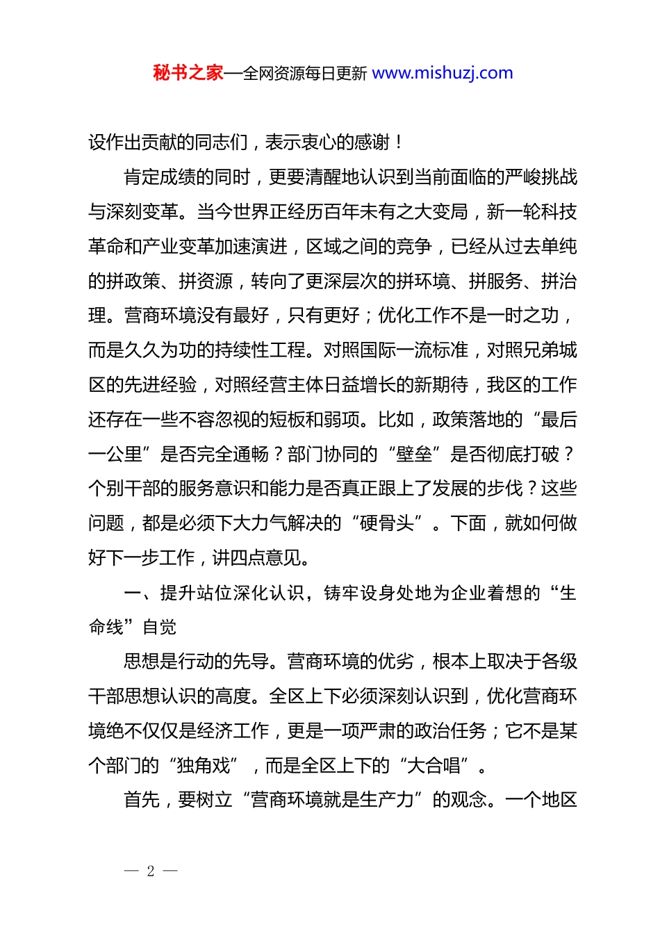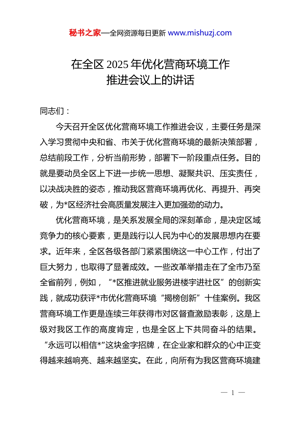 秘书之家—全网资源每日更新 www.mishuzj.com在全区 2025 年优化营商环境工作推进会议上的讲话同志们:今天召开全区优化营商环境工作推进会议,主要任务是深入学习贯彻中央和省、市关于优化营商环境的最新决策部署,总结前段工作,分析当前形势,部署下一阶段重点任务。目的就是要动员全区上下进一步统一思想、凝聚共识、压实责任,以决战决胜的姿态,推动我区营商环境再优化、再提升、再突破,为*区经济社会高质量发展注入更加强劲的动力。优化营商环境,是关系发展全局的深刻革命,是决定区域竞争力的核心要素,更是践行以人民为中心的发展思想内在要求。近年来,全区各级各部门紧紧围绕这一中心工作,付出了巨大努力,也取得了显著成效。一些改革举措走在了全市乃至全省前列,例如,“*区推进就业服务进楼宇进社区”的创新实践,就成功获评*市优化营商环境“揭榜创新”十佳案例。我区营商环境工作更是连续三年获得市对区督查激励表彰,这是上级对我区工作的高度肯定,也是全区上下共同奋斗的结果。“永远可以相信*”这块金字招牌,在企业家和群众的心中正变得越来越响亮、越来越坚实。在此,向所有为我区营商环境建— 1 —秘书之家—全网资源每日更新 www.mishuzj.com设作出贡献的同志们,表示衷心的感谢!肯定成绩的同时,更要清醒地认识到当前面临的严峻挑战与深刻变革。当今世界正经历百年未有之大变局,新一轮科技革命和产业变革加速演进,区域之间的竞争,已经从过去单纯的拼政策、拼资源,转向了更深层次的拼环境、拼服务、拼治理。营商环境没有最好,只有更好;优化工作不是一时之功,而是久久为功的持续性工程。对照国际一流标准,对照兄弟城区的先进经验,对照经营主体日益增长的新期待,我区的工作还存在一些不容忽视的短板和弱项。比如,政策落地的“最后一公里”是否完全通畅?部门协同的“壁垒”是否彻底打破?个别干部的服务意识和能力是否真正跟上了发展的步伐?这些问题,都是必须下大力气解决的“硬骨头”。下面,就如何做好下一步工作,讲四点意见。一、提升站位深化认识,铸牢设身处地为企业着想的“生命线”自觉思想是行动的先导。营商环境的优劣,根本上取决于各级干部思想认识的高度。全区上下必须深刻认识到,优化营商环境绝不仅仅是经济工作,更是一项严肃的政治任务;它不是某个部门的“独角戏”,而是全区上下的“大合唱”。首先,要树立“营商环境就是生产力”的观念。一个地区— 2 —秘书之家—全网资源每日更新 www.mishuzj.com的发展,短期看项目,中期看政策,长期看环境。一流的营商环境,能够像磁场一样,吸引高端要素、集聚优质资源、激发创新活力。反之,环境不好,再好的区位优势、再优惠的政策支持,也可能成为“空中楼阁”。要把优化营商环境作为培育和发展新质生产力的关键一招,作为应对经济下行压力、实现高质量发展的根本之策,摆在全局工作的核心位置。其次,要树立“人人都是营商环境”的观念。营商环境体现在方方面面,既包括宏观的政策制度,也包括微观的办事流程;既包括硬件的基础设施,也包括软件的服务态度。从区级领导到窗口办事员,从执法人员到社区工作者,每一个人都是*形象的代言人,每一项工作都是营商环境的构成要素。必须彻底破除“与己无关”的看客心态,牢固树立“人人有责、人人尽责”的主人翁意识,让关心环境、维护环境、优化环境成为全区上下的思想共识和行动自觉。再者,要树立“法治是最好的营商环境”的观念。市场经济本质上是法治经济。一个稳定、公平、透明、可预期的法治环境,是给予企业家最根本的安全感和最长久的信心。要坚持依法行政,严格规范涉企行政执法检查行为,坚决杜绝选择性执法、随意性执法。要依法保护各类经营主体的产权和合法权益,让企业家在*区放心投资、安心经营、专心创业。法律的准— 3 —秘书之家—全网资源每日更新 www.mishuzj.com绳面前,所有市场主体一视同仁,这是底线,也是高压线。二、聚焦关切精准施策,实现从被动响应到主动服务的“根本性”转变服务是优化营商环境的核心内容。过去的服务模式,往往是企业有需求,部门再响应。面向未来,必须实现根本性转...